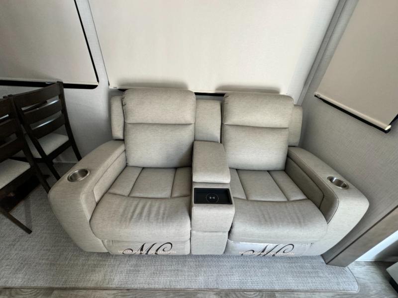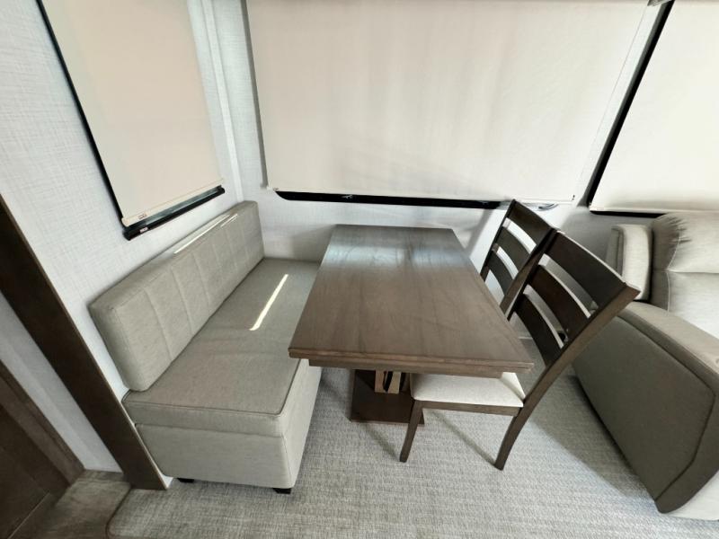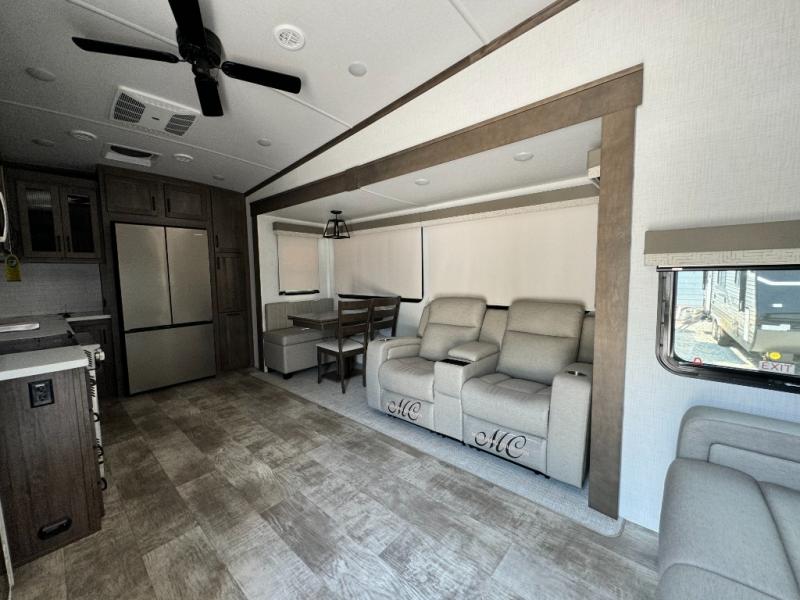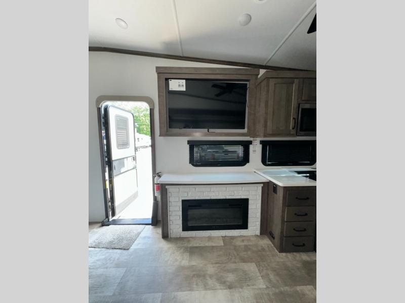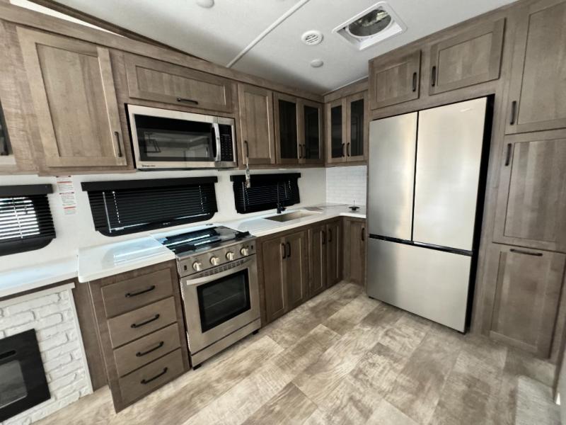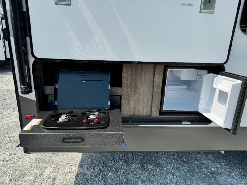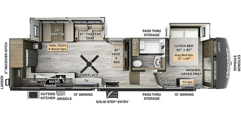 This fifth wheel has everything and then some! The front private bedroom has a king bed slide with an optional king bed that can replace it and a front wardrobe with washer and dryer prep. Freshen up each morning in the full bathroom featuring a shower with a seat, then head to the rear kitchen and scramble up some eggs on the three burner cooktop. You can enjoy your morning coffee and eggs at the 39" dinette. In the living area there is a 67" theater seat across from a TV with a fireplace, and there is a 60" hide-a-bed sofa fore more sleeping space. You can even a cook outside on the outside kitchen with an outdoor griddle underneath the 13' awning! There is even a second 15' awning over the Solid Step entry and pass-thru storage area.