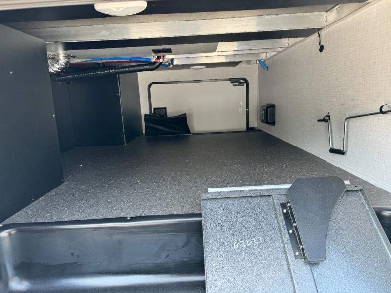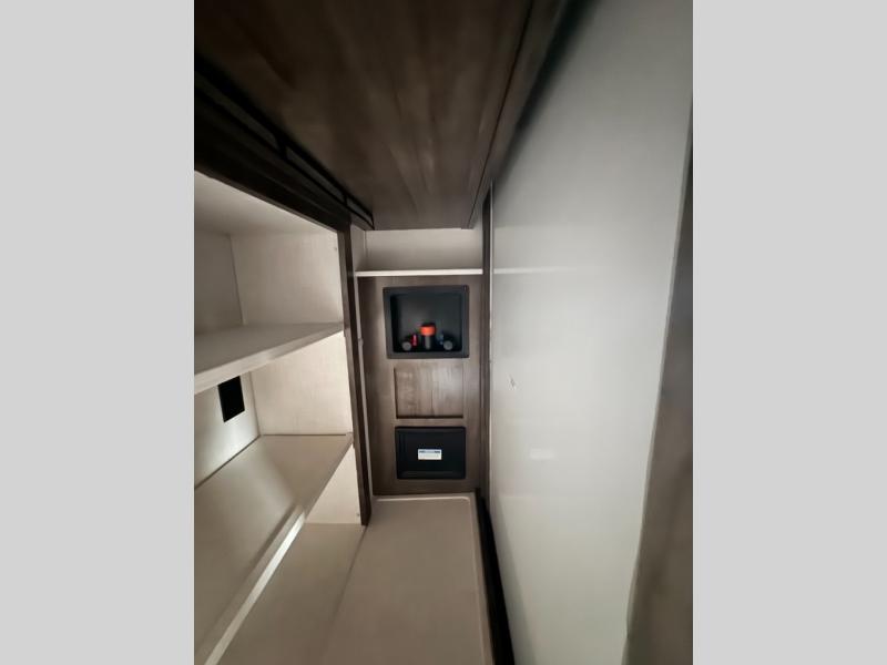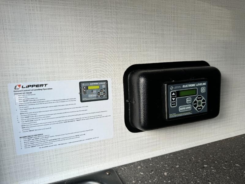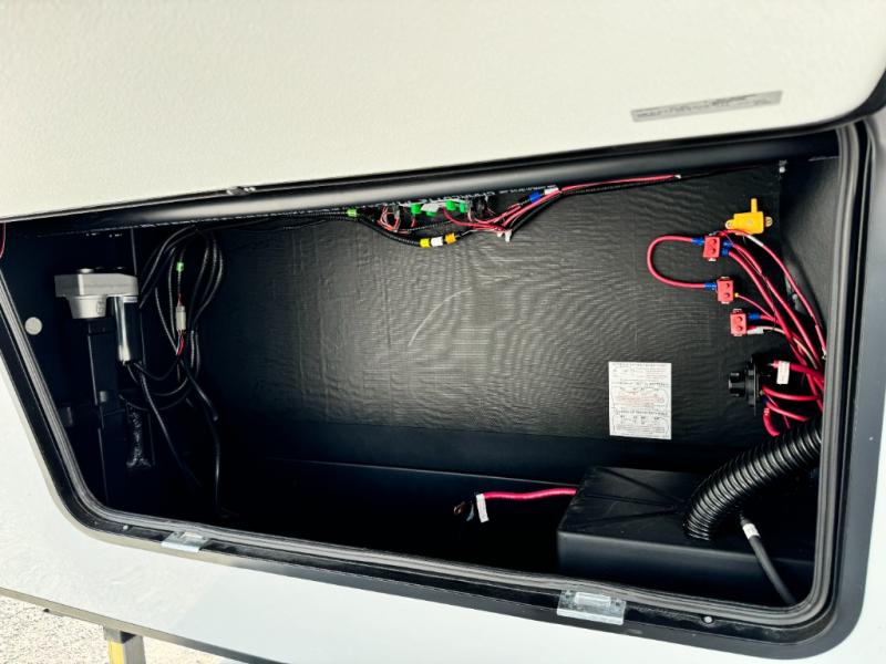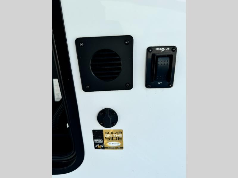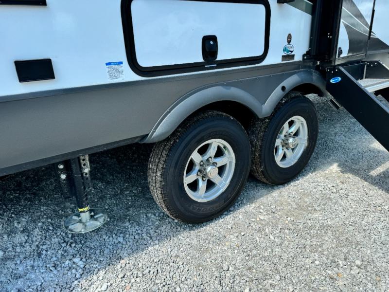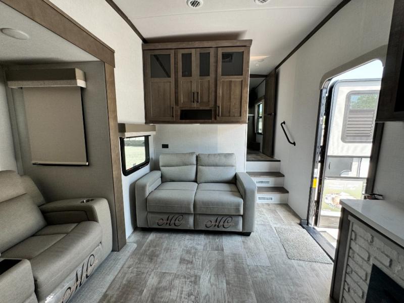 This fifth wheel has everything and then some! The front private bedroom has a king bed slide with an optional king bed that can replace it and a front wardrobe with washer and dryer prep. Freshen up each morning in the full bathroom featuring a shower with a seat, then head to the rear kitchen and scramble up some eggs on the three burner cooktop. You can enjoy your morning coffee and eggs at the 39" dinette. In the living area there is a 67" theater seat across from a TV with a fireplace, and there is a 60" hide-a-bed sofa fore more sleeping space. You can even a cook outside on the outside kitchen with an outdoor griddle underneath the 13' awning! There is even a second 15' awning over the Solid Step entry and pass-thru storage area.