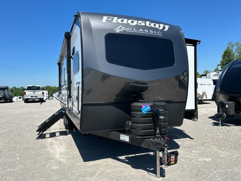 Each one of these Forest River Flagstaff Classic fifth wheels or travel trailers will be your home on wheels! Their quality craftsmanship and attention to detail shines through the surface-coated steel I-beam frame on fifth wheels, the enclosed underbelly, the radius roof with vaulted interior ceilings, and six-sided fully aluminum-framed floor, walls, and roof. Towing your unit will be easy with the torsion axle, Rubber-Ryde suspension, and nitrogen-filled Goodyear Endurance tires. You will even reduce your use of water with the Showermiser water saving system in the bathroom. A few other convenient features you will enjoy include a control panel with WeRV app control, a designer headboard and bedding, and an outside shower with hot and cold water. Come choose your favorite one today!