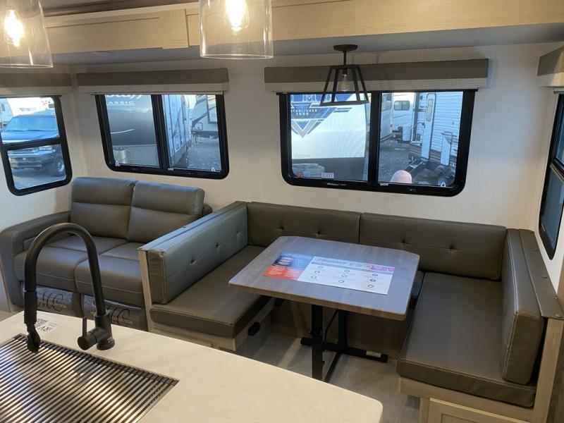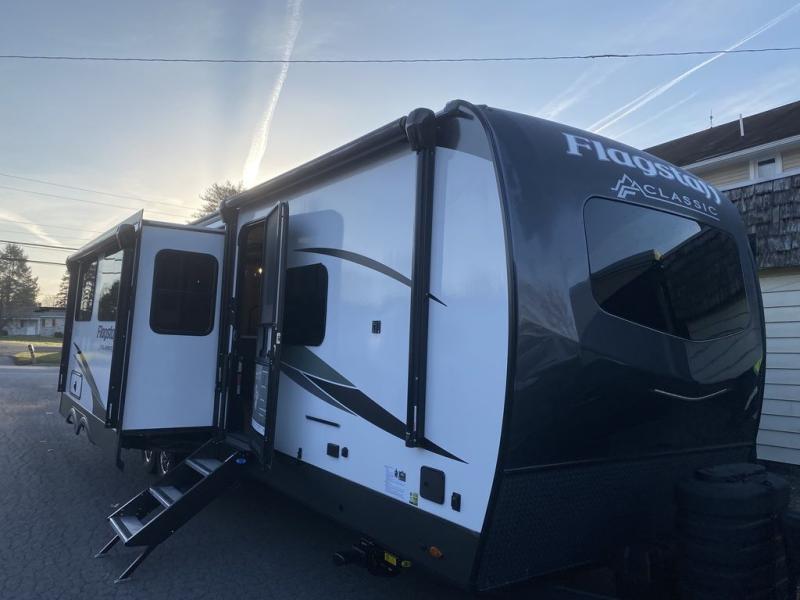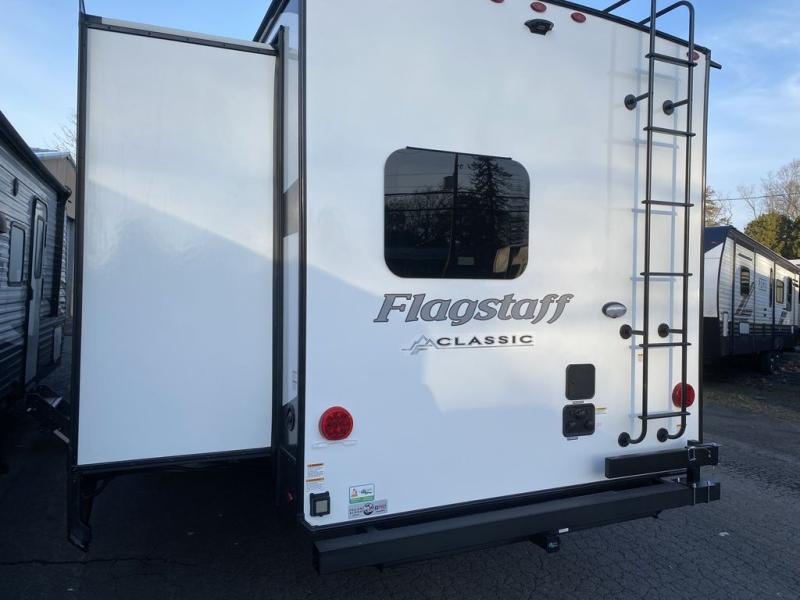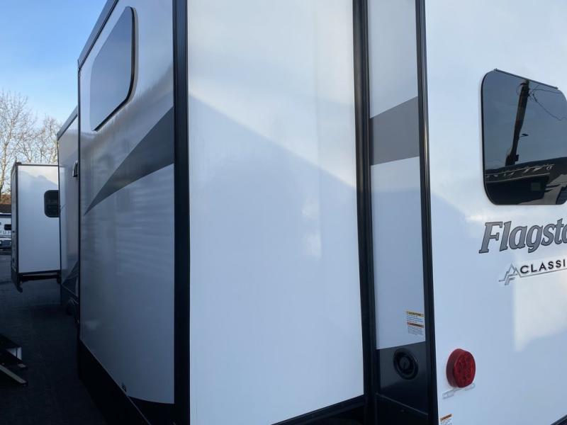 Each one of these Forest River Flagstaff Classic fifth wheels or travel trailers will be your home on wheels! Their quality craftsmanship and attention to detail shines through the surface-coated steel I-beam frame on fifth wheels, the enclosed underbelly, the radius roof with vaulted interior ceilings, and six-sided fully aluminum-framed floor, walls, and roof. Towing your unit will be easy with the torsion axle, Rubber-Ryde suspension, and nitrogen-filled Goodyear Endurance tires. You will even reduce your use of water with the Showermiser water saving system in the bathroom. A few other convenient features you will enjoy include a control panel with WeRV app control, a designer headboard and bedding, and an outside shower with hot and cold water. Come choose your favorite one today!