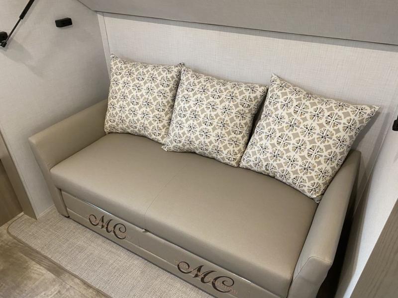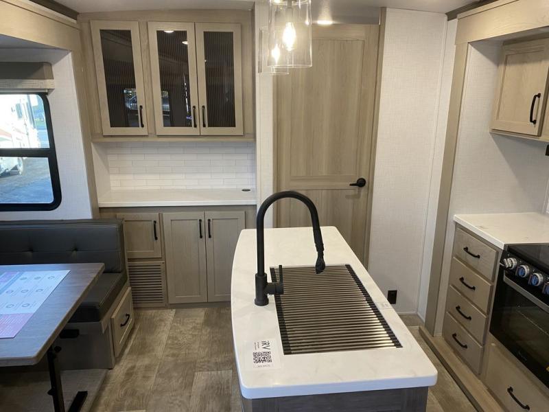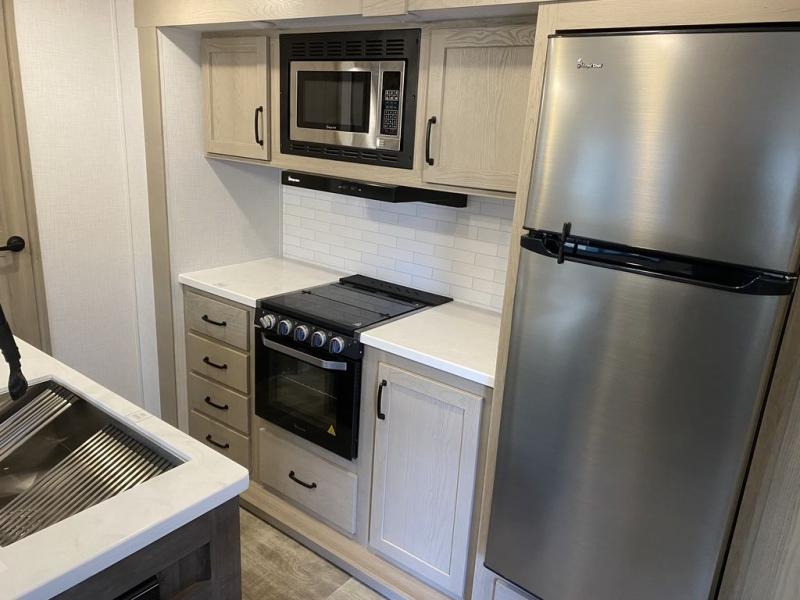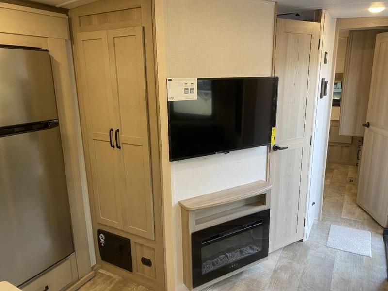 The whole family will love camping in this travel trailer! The kids have their own privacy within the rear bunkhouse that features a 42" x 72" upper bunk with a TV option below it along the curbside, and a 72" x 32" flip-up bunk with a 67" hide-a-bed sofa below it along the roadside. After you have prepared a delicious home-cooked meal with the three-burner cooktop and kitchen island, you can head to the 44" x 81" U-shaped dinette where everyone can gather around. You could even prepare dinner at the outside kitchen, set up a table and chairs, and eat underneath the 11' power awning. The 60" hide-a-bed sofa is the perfect place to sit while enjoying the fireplace or watching your favorite movie on the LED TV. A dual-entry bathroom makes it easy for everyone to access especially those staying in the front private bedroom!
