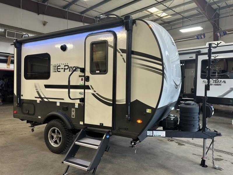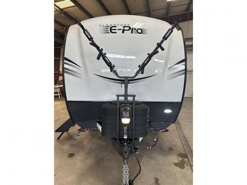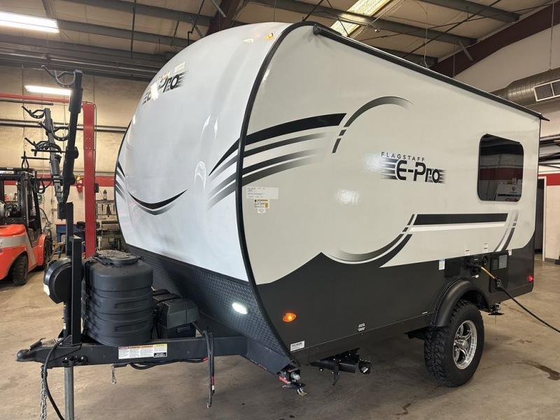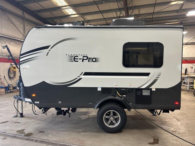 With any Flagstaff E-Pro travel trailer by Forest River, you will experience lightweight towing, style and features that will meet your needs, plus amenities that give you more than you expected! Built with interior and exterior composite sidewall construction, tongue and grove plywood flooring, and a vacuum laminated roof and walls, plus torsion axle, Rubber-Ryde suspension, and a tire pressure monitoring system for safety while traveling. And the 200 watt roof mount solar panel with 1,800-watt inverter will allow you to stay off-grid if you like. The interior offers a comfortable environment with the choice to use the air conditioner or furnace, and a 12V entertainment TV with stereo to stay up to date on your favorite movies. Make your selection today!