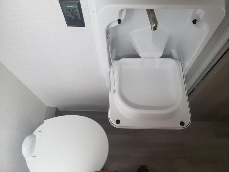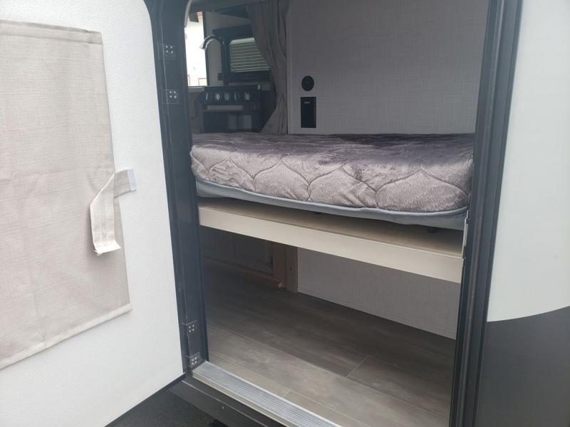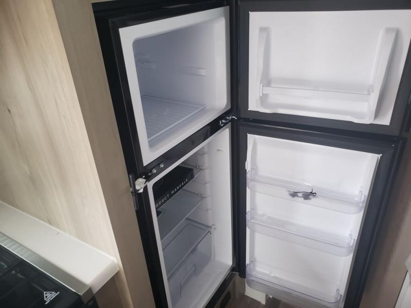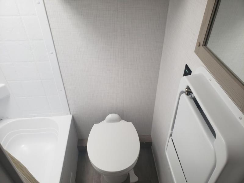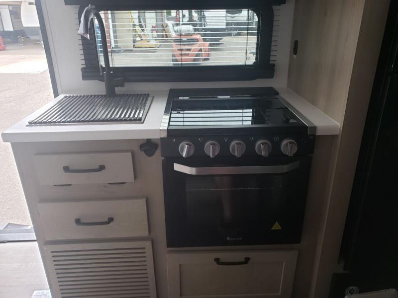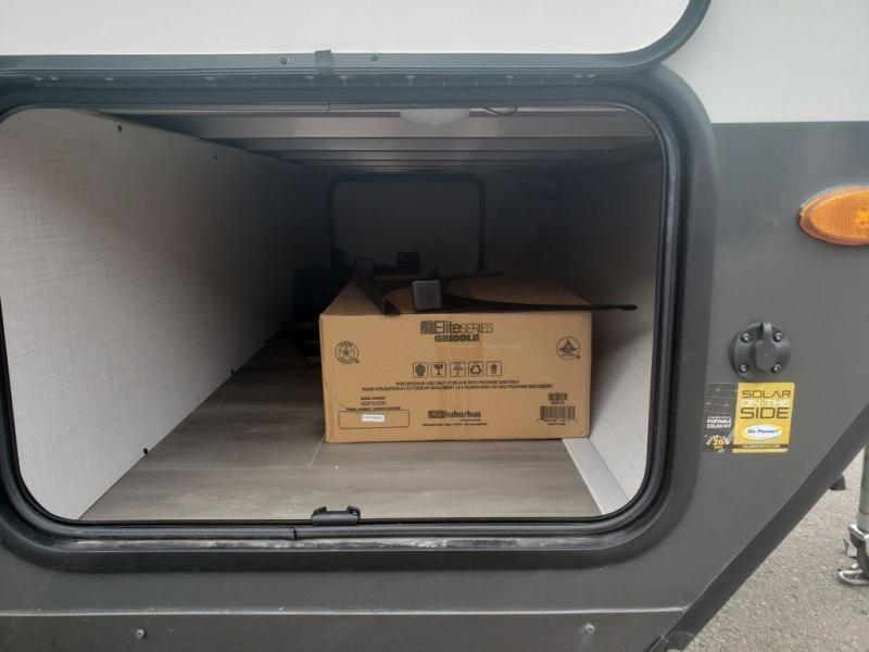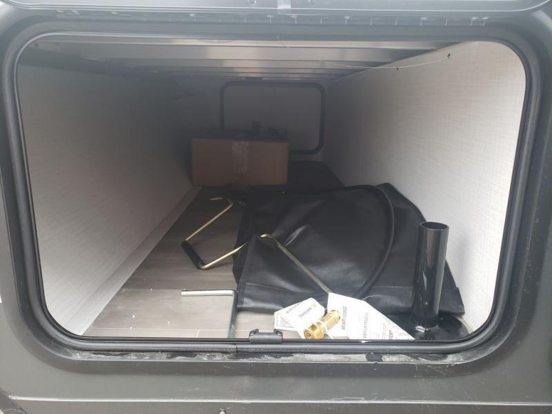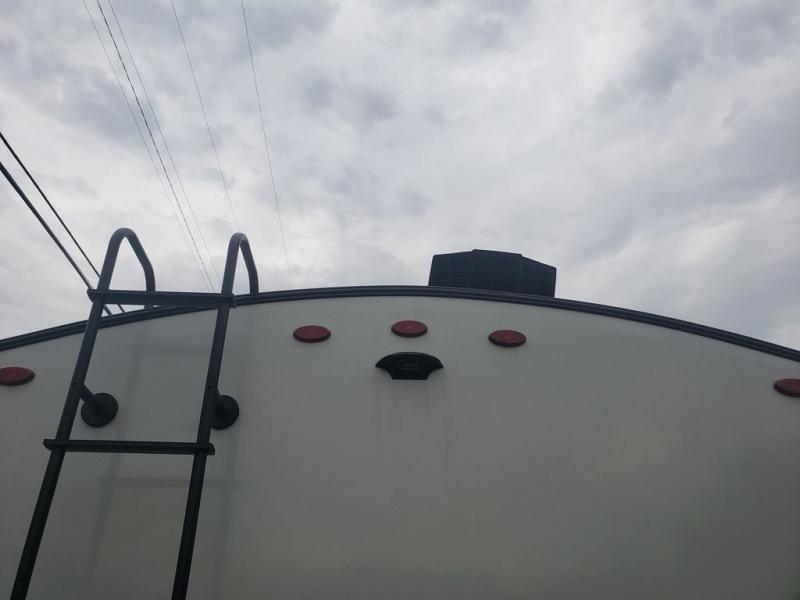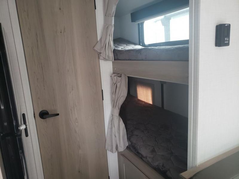 Enjoy moving from campground to campground easily in this trailer thanks to not having a slide out, you can hitch up and go when you are ready. Just don't forget to push the button to the 14' power awning. Your kids or friends will enjoy having their own bunk bed to sleep on while you have a full bed up front, and the 32" dinette sleeps one more. Convenience is appreciated in the rear toilet and shower/bath giving you a place to change in privacy and get cleaned up. The bike door allows you to store bicycles or totes easily inside for traveling, and the exterior storage compartments give you extra space for outdoor gear, camping chairs and such.