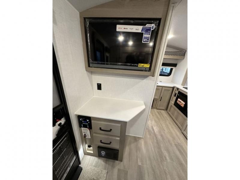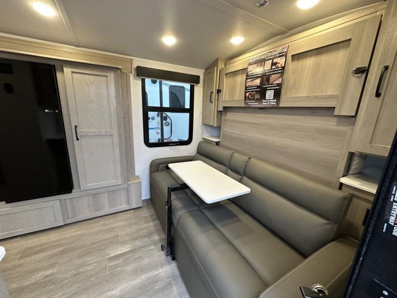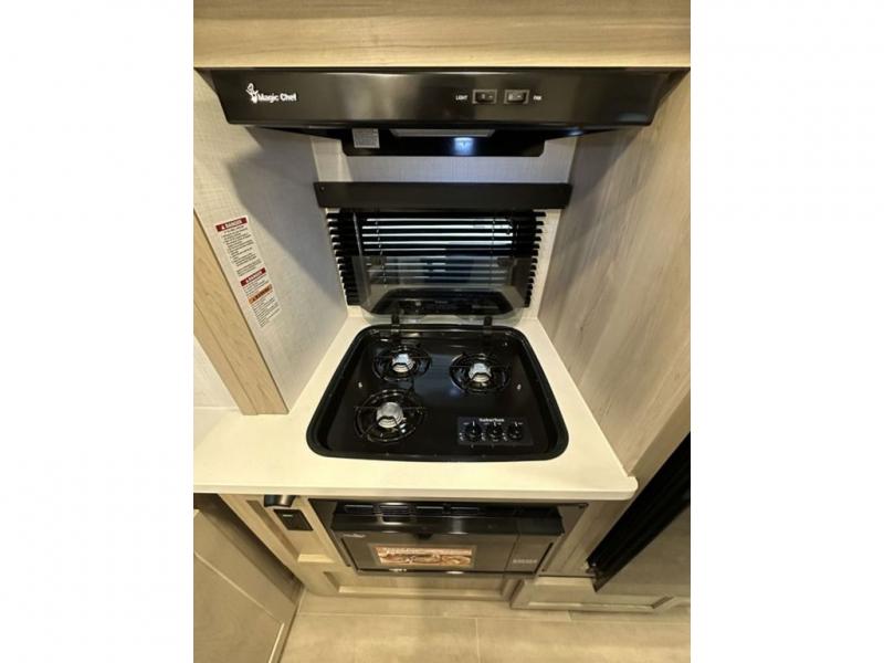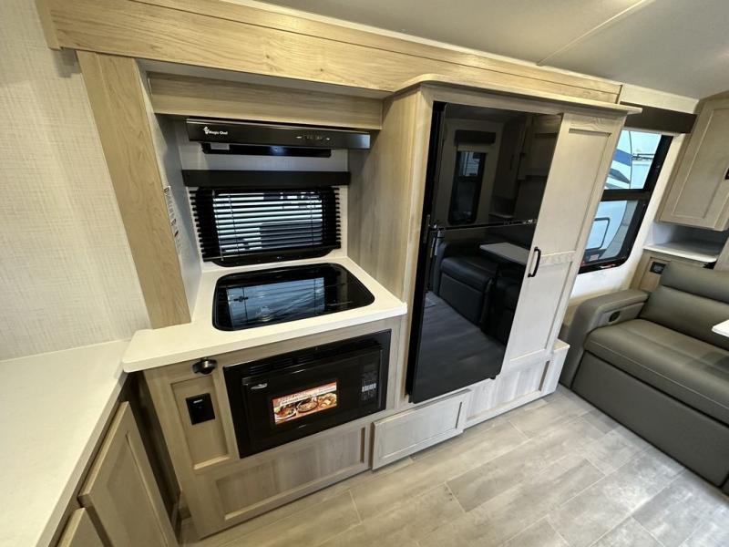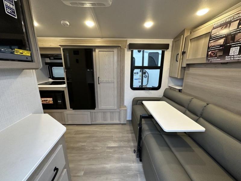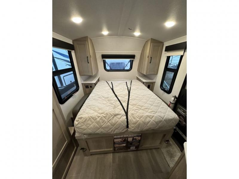 You will love the versatile living in this travel trailer! The jackknife sofa has a 30" x 15" table to relax and enjoy your meals prepared with the recessed three burner cooktop or heat up some leftovers in the convection microwave. At night you can transform the sofa into a 54" x 74" Murphy bed while you watch your favorite movie on the 32" TV across from it. You can freshen up each morning in the rear corner bathroom with the shower which has a shower miser water saver feature to efficiently use your water. The 11' power awning will protect you rain or shine as you cook at the outdoor griddle, and there is plenty of storage between the front outside storage area and the additional pass-through storage area!