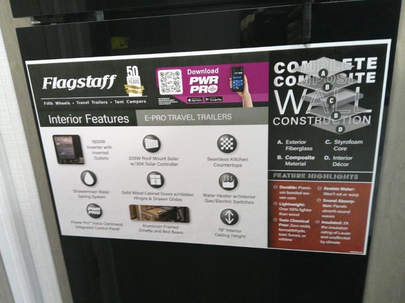 With any Flagstaff E-Pro travel trailer by Forest River, you will experience lightweight towing, style and features that will meet your needs, plus amenities that give you more than you expected! Built with interior and exterior composite sidewall construction, tongue and grove plywood flooring, and a vacuum laminated roof and walls, plus torsion axle, Rubber-Ryde suspension, and a tire pressure monitoring system for safety while traveling. And the 200 watt roof mount solar panel with 1,800-watt inverter will allow you to stay off-grid if you like. The interior offers a comfortable environment with the choice to use the air conditioner or furnace, and a 12V entertainment TV with stereo to stay up to date on your favorite movies. Make your selection today!