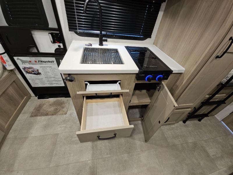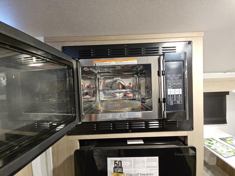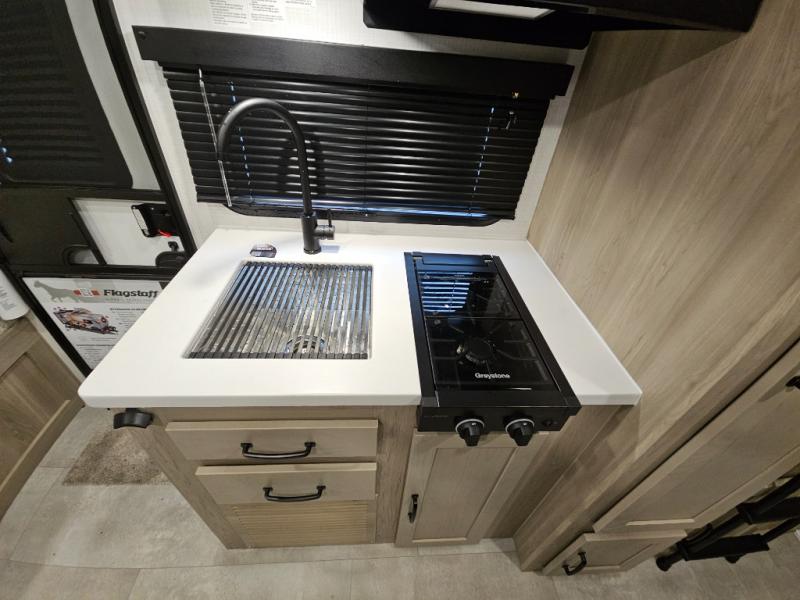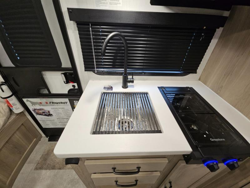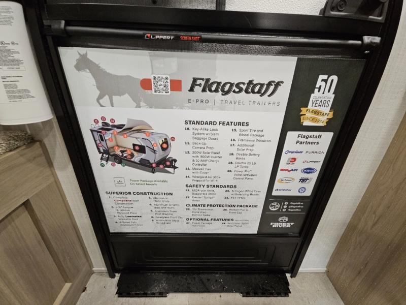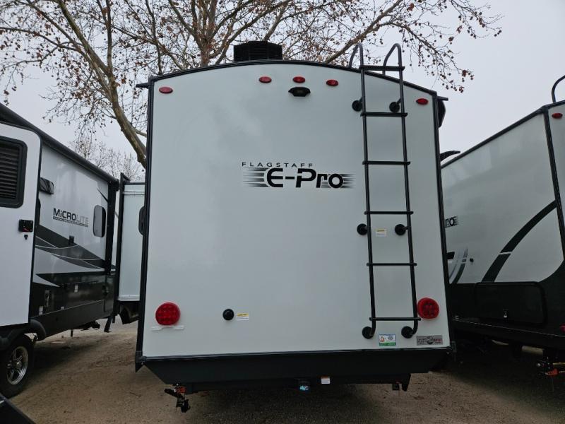 With any Flagstaff E-Pro travel trailer by Forest River, you will experience lightweight towing, style and features that will meet your needs, plus amenities that give you more than you expected! Built with interior and exterior composite sidewall construction, tongue and grove plywood flooring, and a vacuum laminated roof and walls, plus torsion axle, Rubber-Ryde suspension, and a tire pressure monitoring system for safety while traveling. And the 200 watt roof mount solar panel with 1,800-watt inverter will allow you to stay off-grid if you like. The interior offers a comfortable environment with the choice to use the air conditioner or furnace, and a 12V entertainment TV with stereo to stay up to date on your favorite movies. Make your selection today!