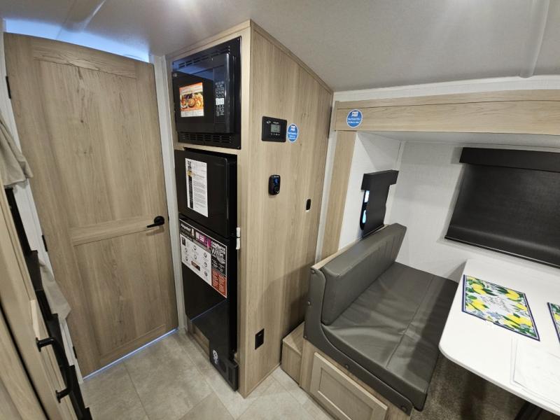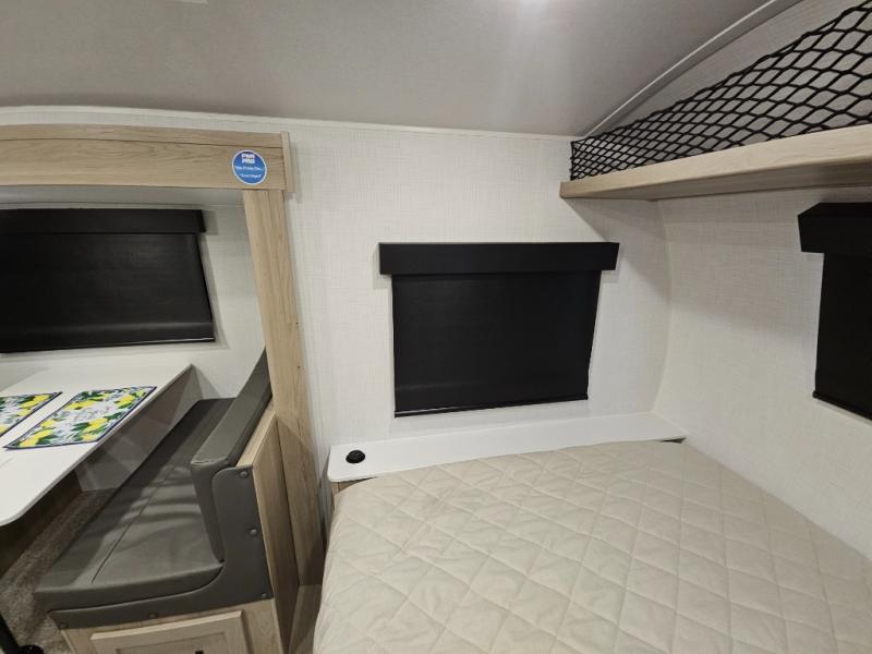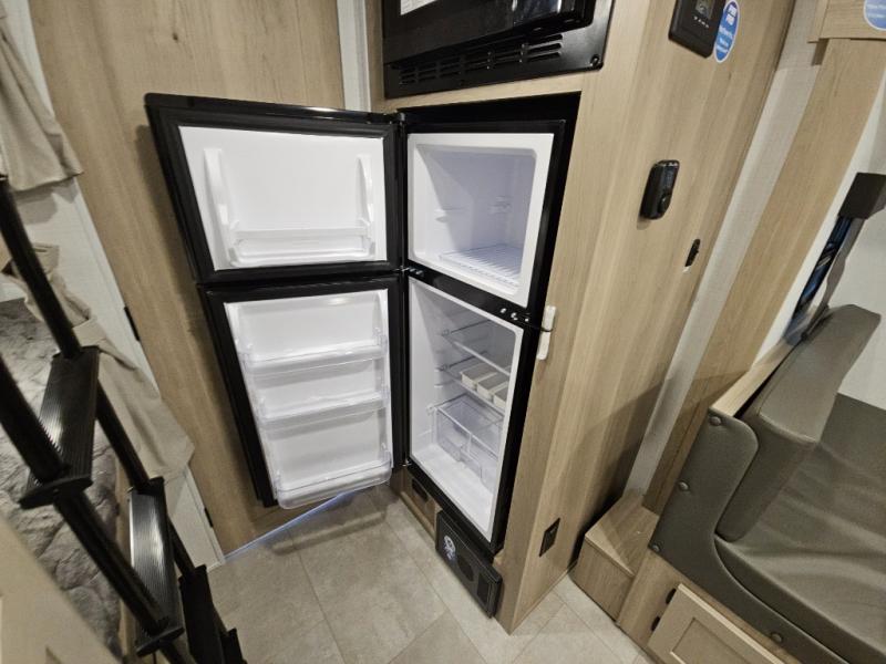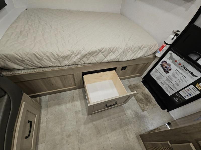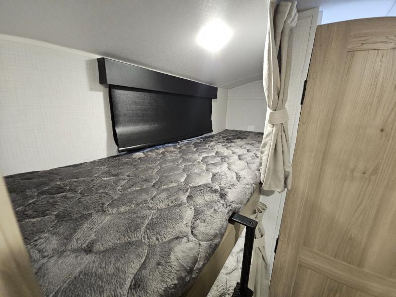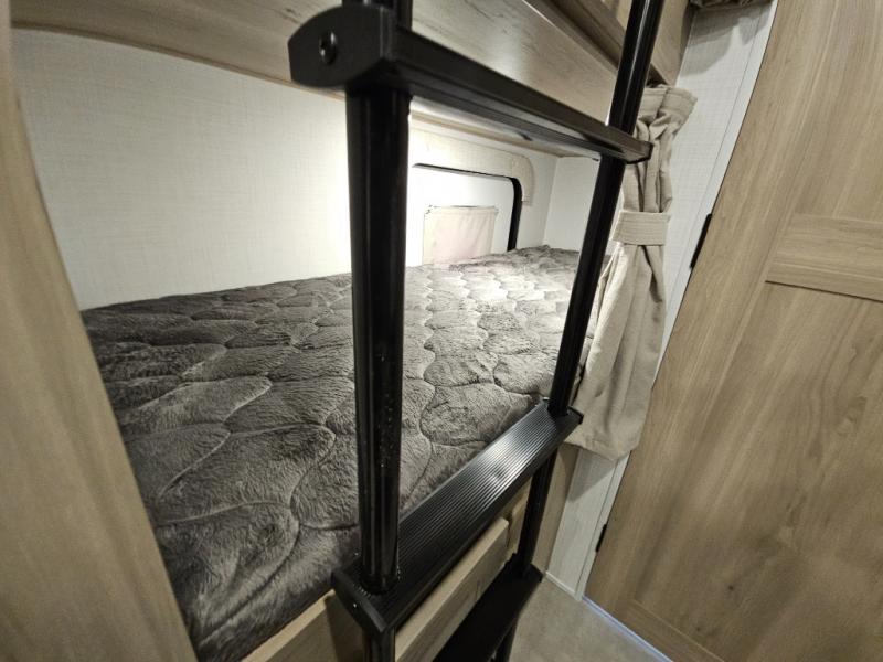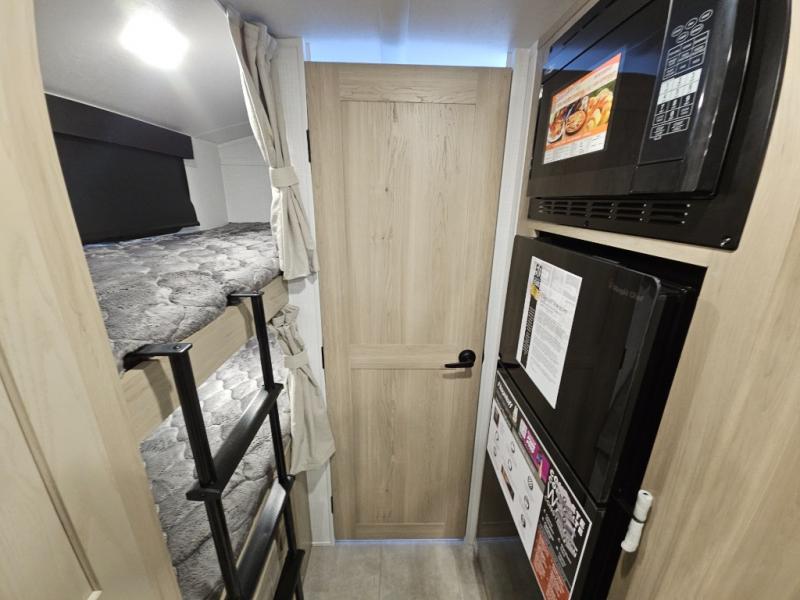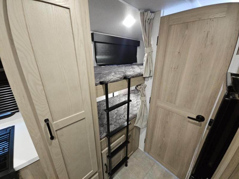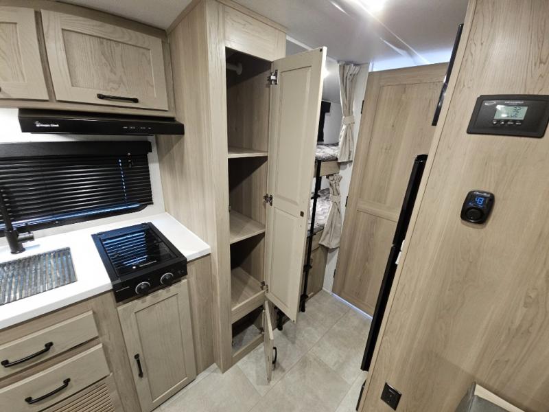 The largest bunk trailer in the E-Pro lineup will work perfectly for a family or friend group that enjoys their own sleeping space, plus more floor space with the dinette slide out that can sleep one to two. The bottom bunk even flips up so you can stow away your bikes, totes and such through the bike door for secure travels. There is exterior storage for more outdoor gear, and interior storage found throughout. The cook will love having a pantry and overhead cabinets for snacks, canned goods, dishes and more. After making a warm meal, the 12V refrigerator can hold the leftovers. The private toilet and shower/tub room gives you privacy and a place to get cleaned up after a fun day outdoors.