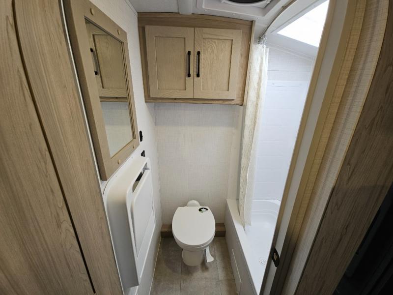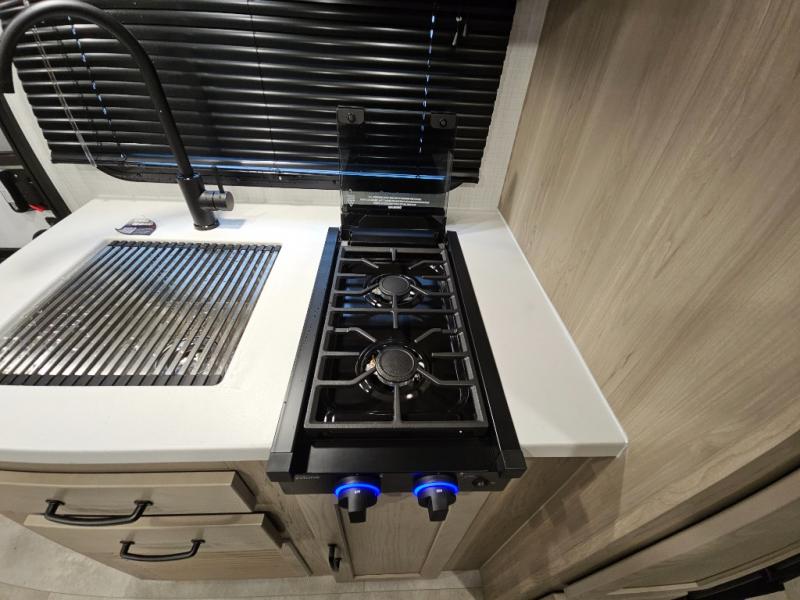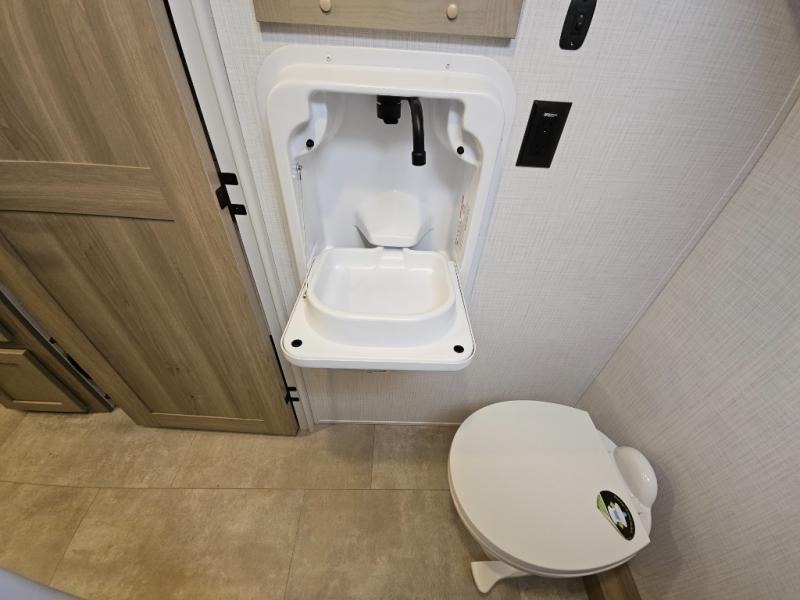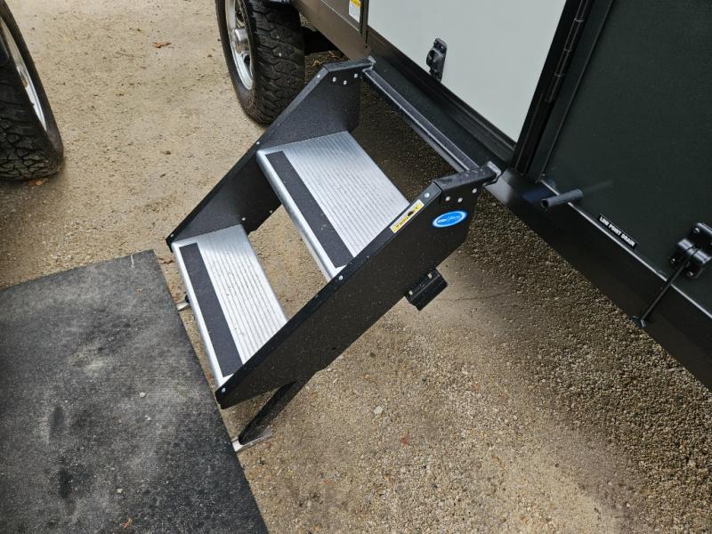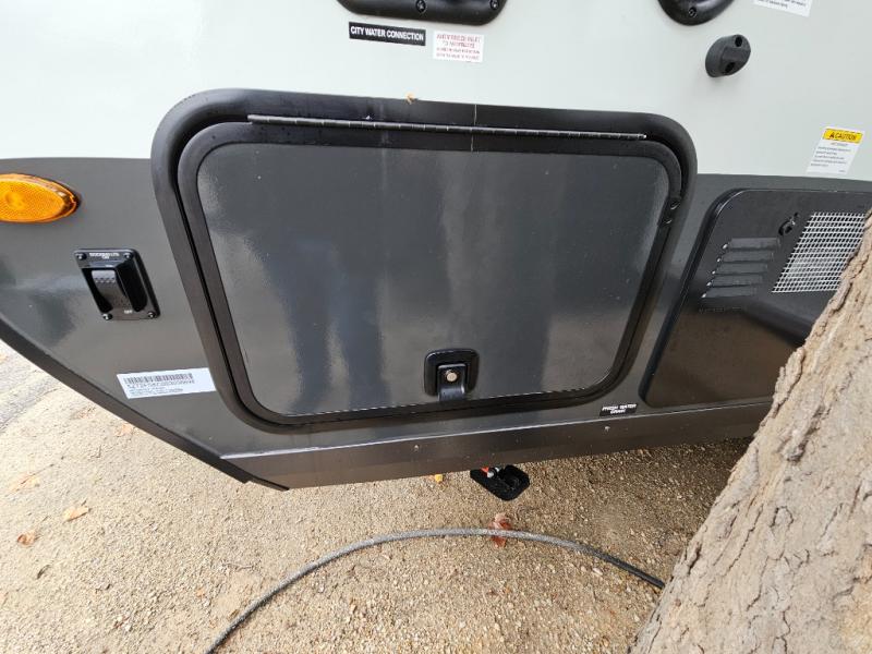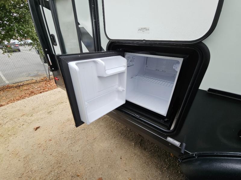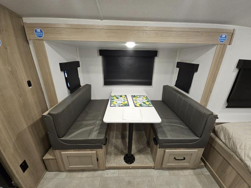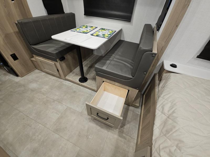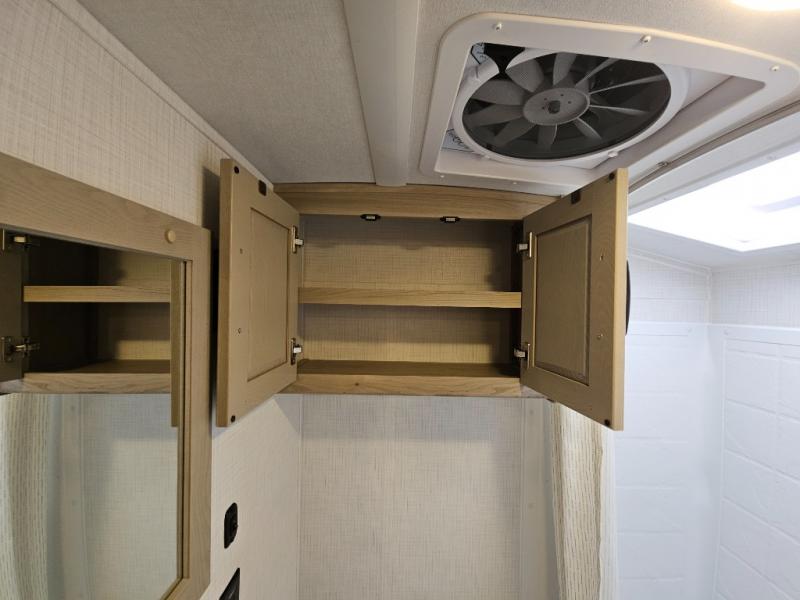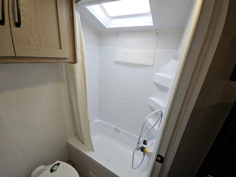 The largest bunk trailer in the E-Pro lineup will work perfectly for a family or friend group that enjoys their own sleeping space, plus more floor space with the dinette slide out that can sleep one to two. The bottom bunk even flips up so you can stow away your bikes, totes and such through the bike door for secure travels. There is exterior storage for more outdoor gear, and interior storage found throughout. The cook will love having a pantry and overhead cabinets for snacks, canned goods, dishes and more. After making a warm meal, the 12V refrigerator can hold the leftovers. The private toilet and shower/tub room gives you privacy and a place to get cleaned up after a fun day outdoors.