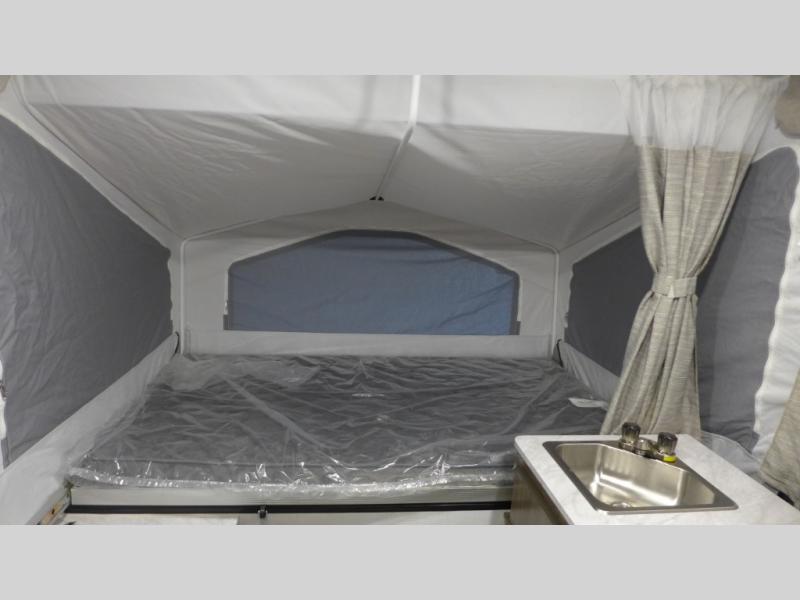 If you have put off your upcoming camping trip because you dread the idea of towing and traveling, one look at this camper will change your mind! It will be extremely easy to transport this lightweight and compact camper, and it will also be just as easy to set it up once you get to the campsite. One of the favorite features of any pop-up camper is the tent end bed because it allows you to sleep under the stars without the annoyance of actually sleeping on the ground. The quilted-top mattresses will provide you with a comfortable night of rest on the queen tent bed, and you can even use the 40" x 74" booth dinette to create an additional sleeping space. Use the privacy curtains to section off some space at night, and in the morning, you can get a hearty breakfast going on the two-burner range.