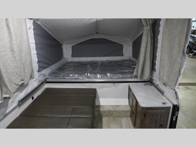 With any Limited Series folding pop-up campers by Forest River you will enjoy simple, yet convenient camping features. There are nitrogen filled tires and leaf spring axles to provide a smooth tow from home to campground, and the rear stabilizer jacks with sand pads add stability once you're all set up. There is also a one-piece screen door, an electric water pump, and a power lift system for added convenience. The interior includes LED lights, an inside/outside two burner stove, residential style cabinet doors, and a wood look floor you are sure to love.