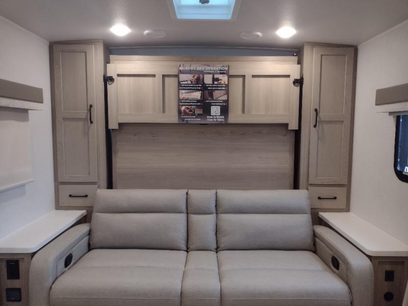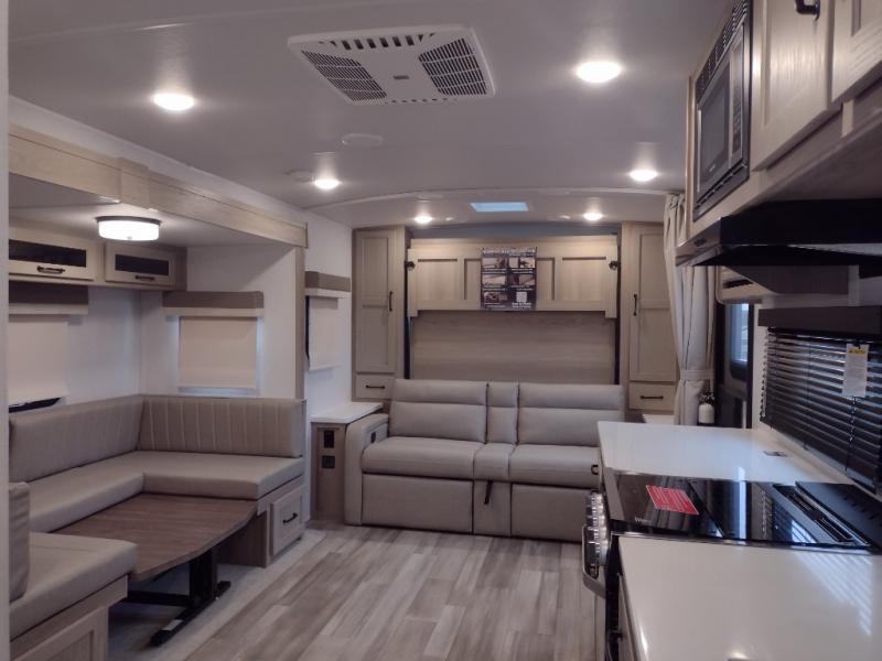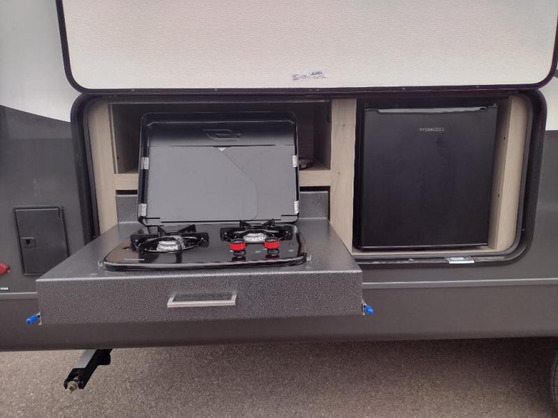Not only does this travel trailer include an exterior pull out stove and an exterior griddle, but also a full interior kitchen in the back corner! You will appreciate ample counter space inside to prep kabobs for dinner or set out appetizers to keep your campers happy. Up front, you'll find the 74" sofa where you can relax each day, then fold down the Murphy bed in the evening for a great night's rest. There is also a privacy curtain here if you have guests staying over on the U-shaped dinette within the slide out, and the 32" TV means you all can watch a movie at night. This model also includes The Power Package that comes with a 400AH single Mastervolt MLI lithium-ion battery, five 200W solar panels, a 13,500 BTU soft start power saver A/C, and more features that will allow you to go off-grid when the adventure calls for it!