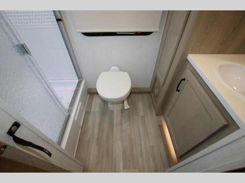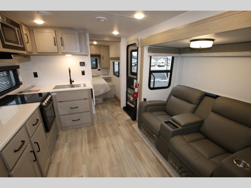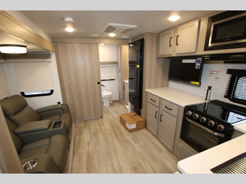 If you like to camp with your honey or a friend, this travel trailer will be perfect for you! You can sleep two people each night on the RV queen bed in the front private bedroom. You'll also find a wardrobe slide in the bedroom for more space, plus an additional wardrobe and an optional TV if you enjoy movies in bed. The theater seat with tables will provide a place to relax and dine together, and if you do need extra sleeping space, just choose the optional hide-a-bed sofa with a table instead of the theater seat. Delicious meals can be made on the three burner cooktop or in the 21" gas oven, and there is a 12V refrigerator for leftovers. The exterior is just as accommodating as the interior with its exterior griddle, drop-frame pass-through storage, 2" receiver hitch, and 19' power awning with LED lights. This model also includes The Power Package that comes with a 400AH single Mastervolt MLI lithium-ion battery, five 200W solar panels, a 13,500 BTU soft start power saver A/C, and more features that will allow you to go off-grid when the adventure calls for it!