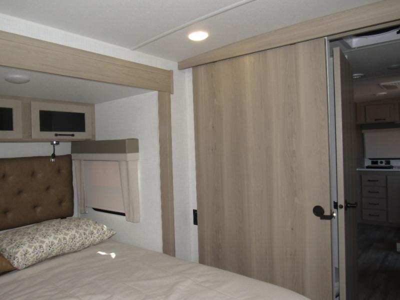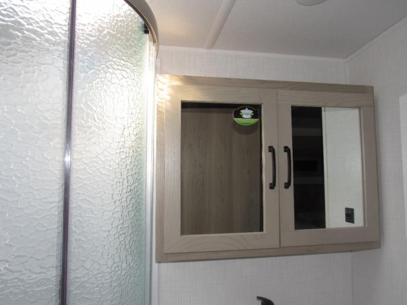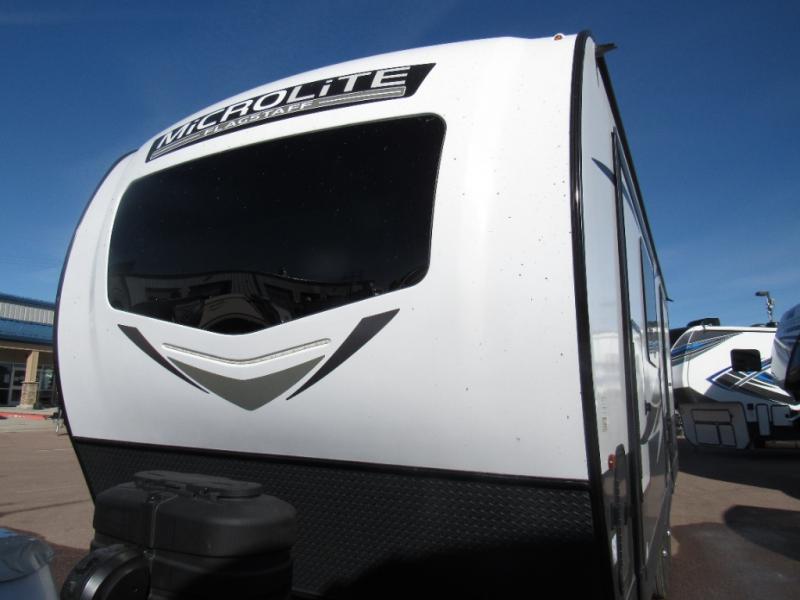 This Flagstaff Micro Lite travel trailer is going to make your camping dreams come true! With a queen bed slide and a large wardrobe in the private bedroom, you will have all that you need for sleeping and storing your belongings. Plus, the second exterior entry door leads right into the bedroom so that you can escape for an early morning run without running through the entire trailer to get outside. The front kitchen is open and accommodating with its helpful tools, and the 67" theater seat is right next to the 12V refrigerator on the slide out. Right next to the front entry door is a coat closet/pantry so you can keep your jackets readily available, and there is also a linen closet in the walk-through bath so that you can keep your towels ready for your shower.