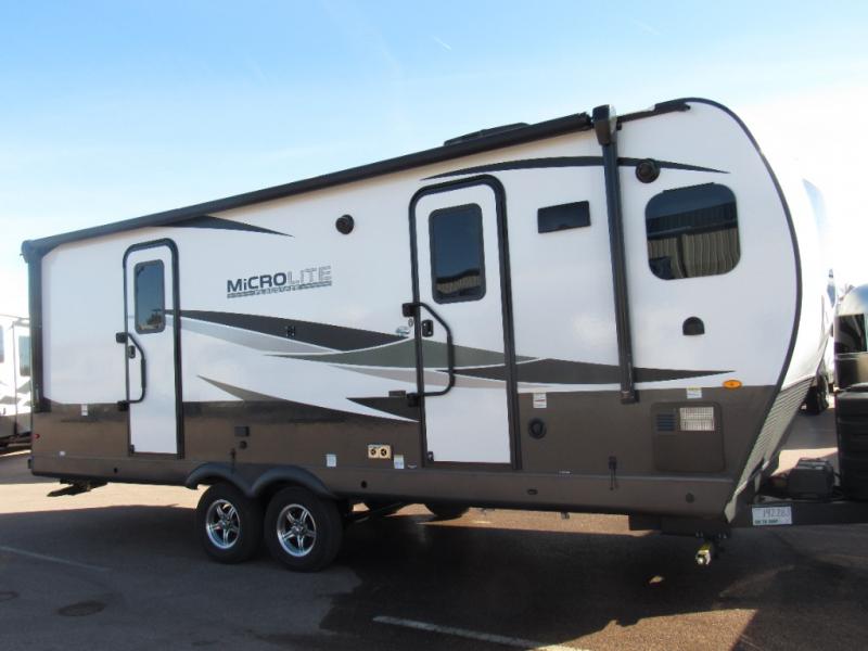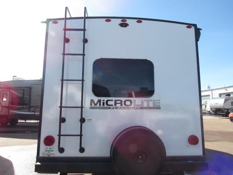 With any Flagstaff Micro Lite travel trailer by Forest River you will enjoy lightweight towing, durable construction, and added interior comforts to make each trip memorable! Each model features a torsion axle, Rubber-Ryde suspension, nitrogen filled, Goodyear Endurance tires, and easy lube axles with Nev-R-Adjust brakes for smooth towing from home to campground. The 6-sided aluminum framed construction provides a strong foundation so you can enjoy your RV for years to come, plus electronically controlled heated holding tanks and an enclosed underbelly will let you camp all year long. Head inside to find hybrid woven flooring in the slide outs, Sedona wood cabinetry, solid surface kitchen countertops, and many more amenities. These travel trailers also include exterior conveniences for hassle-free camping, like the power tongue jack, magnetic compartment door catches, Keyed Alike locks, and rear ladder to name a few!