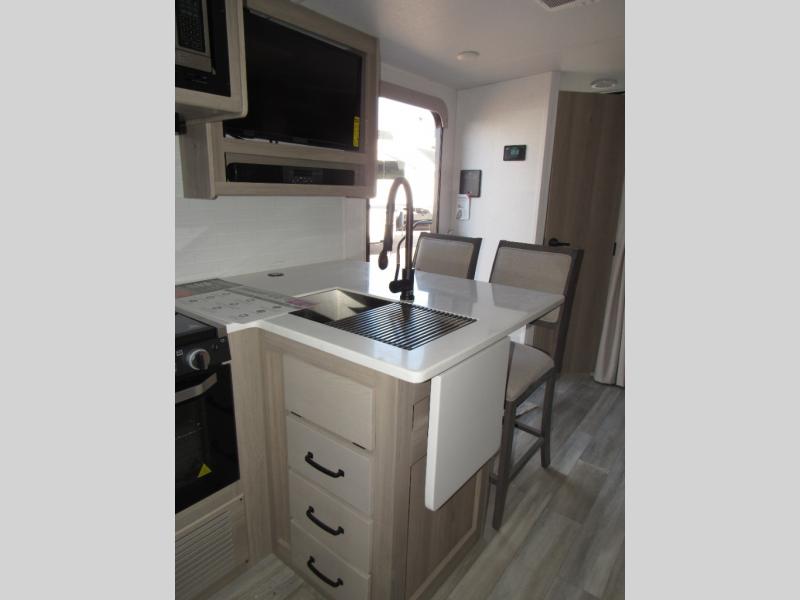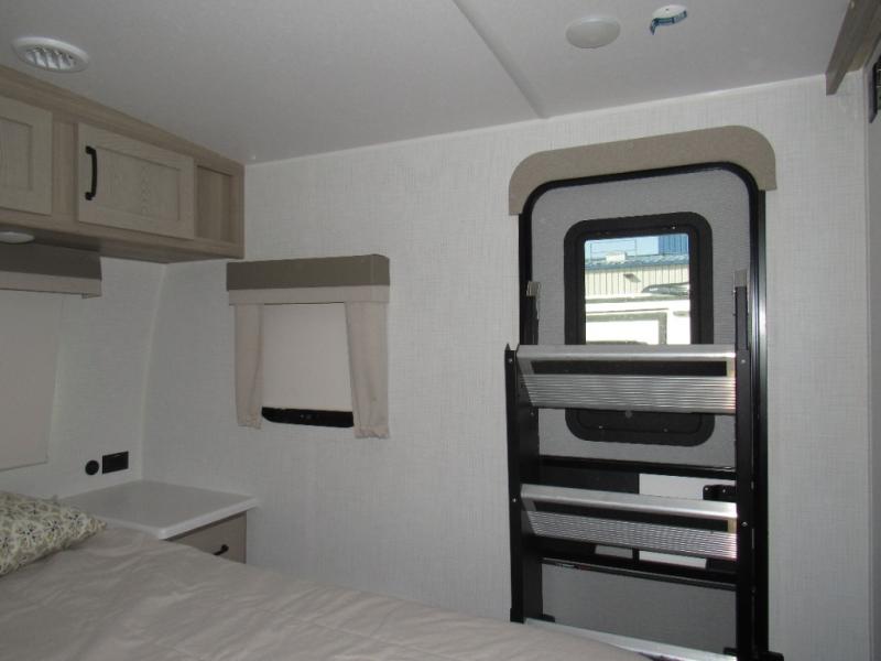 Camping with friends and family has never been easier than with this lightweight travel trailer! There is a semi-private bunkhouse in the rear corner with a privacy curtain, a sofa slide out, and a flip-up bunk. The full bath with its own exterior entry door is close by to make nighttime restroom breaks easy for the little ones, and you'll enjoy the front private bedroom all to yourselves. Here, you can sleep soundly on the queen bed, store your clothes in the wardrobe slide, and sneak out early to fish through the second entry door; how convenient! The middle living area and kitchen includes a third slide out, a theater seat across from the TV, and a countertop with stools where campers can visit with the chef as they cook dinner. Head outside to enjoy the 21' power awning with LED lights, exterior griddle, and pass-thru storage with a steel sliding tray!