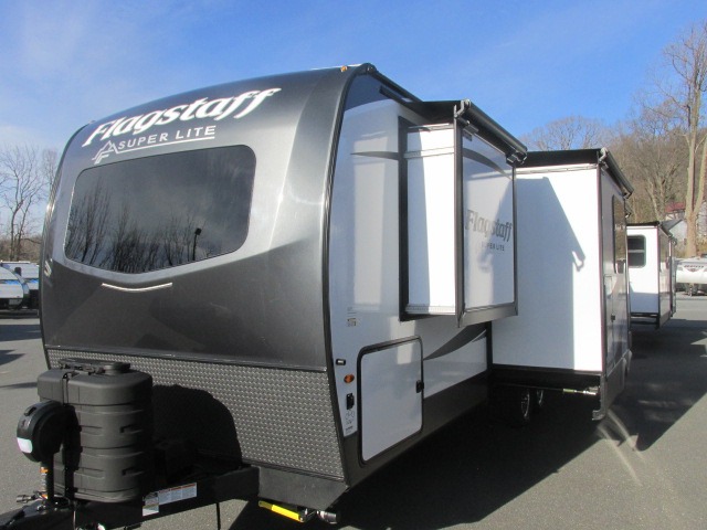 With any Flagstaff Super Lite travel trailer by Forest River the towing features include the TST tire pressure monitor system with a monitor providing safety on the road, Easy Lube axles and Nev-R adjust brakes, a power tongue jack for easy setup, and rear observation camera prep. Each is built with 6 sided aluminum framed side walls, end wall, front, floor and a roof, a plywood tongue and groove subfloor, electronically controlled heated holding tanks and an enclosed underbelly allowing you to travel during any season. The interior a multi-zone stereo with DVD, CD, AM/FM and Bluetooth control, a Showermiser water saving system, designer bedding and so much more!