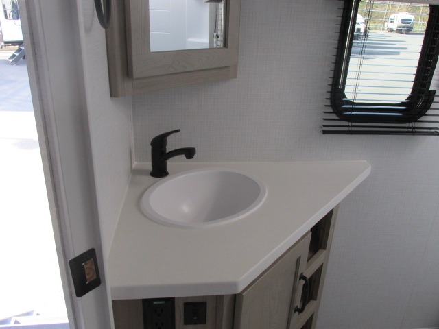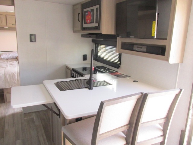 Camping with friends and family has never been easier than with this lightweight travel trailer! There is a semi-private bunkhouse in the rear corner with a privacy curtain, a sofa slide out, and a flip-up bunk. The full bath with its own exterior entry door is close by to make nighttime restroom breaks easy for the little ones, and you'll enjoy the front private bedroom all to yourselves. Here, you can sleep soundly on the queen bed, store your clothes in the wardrobe slide, and sneak out early to fish through the second entry door; how convenient! The middle living area and kitchen includes a third slide out, a theater seat across from the TV, and a countertop with stools where campers can visit with the chef as they cook dinner. Head outside to enjoy the 21' power awning with LED lights, exterior griddle, and drop-frame pass-through storage!
