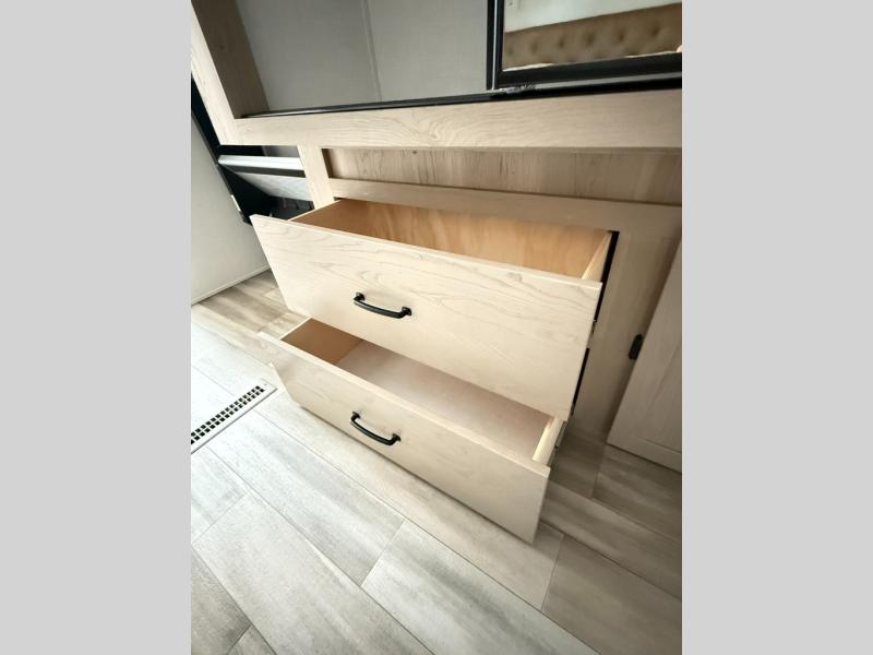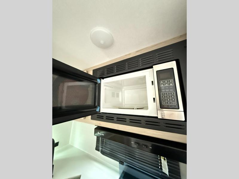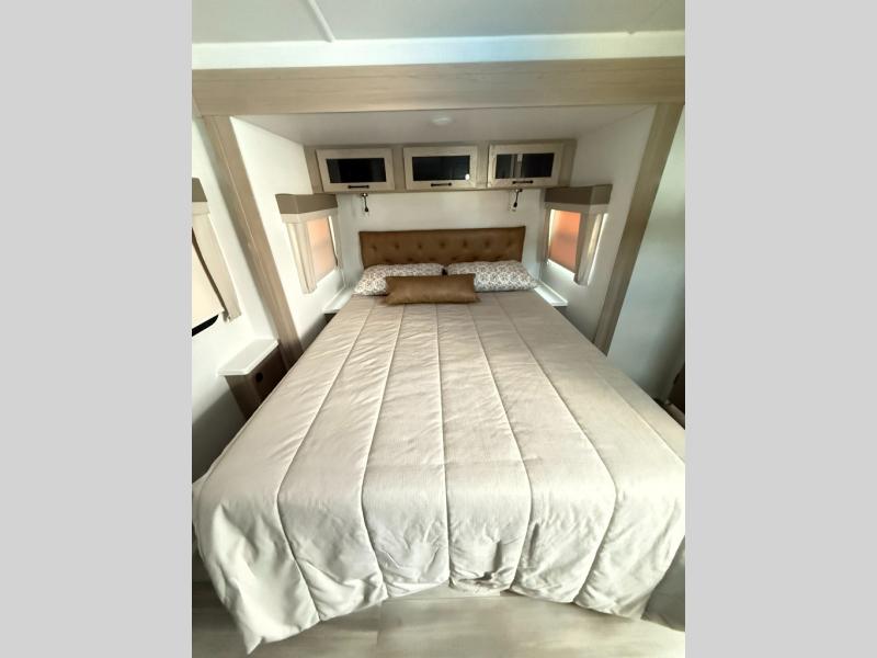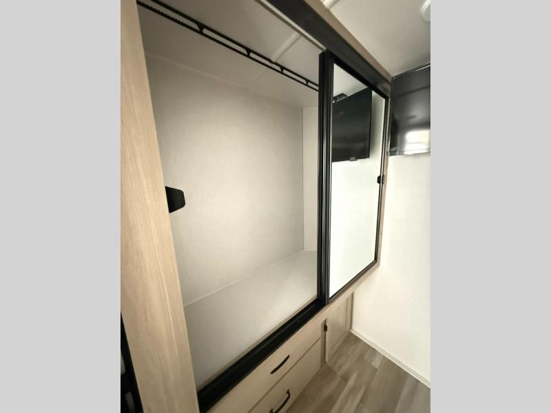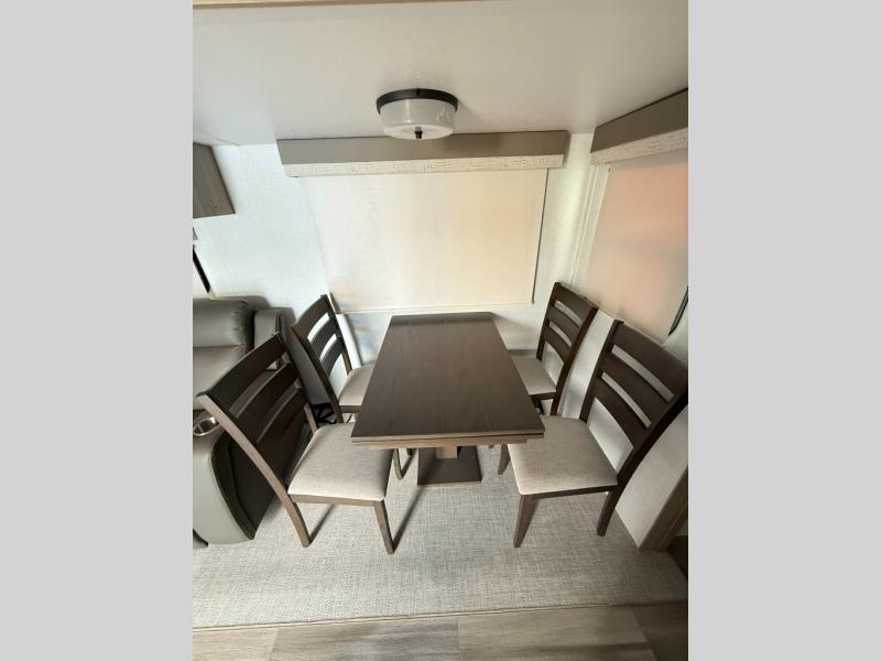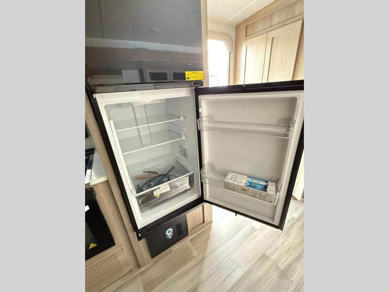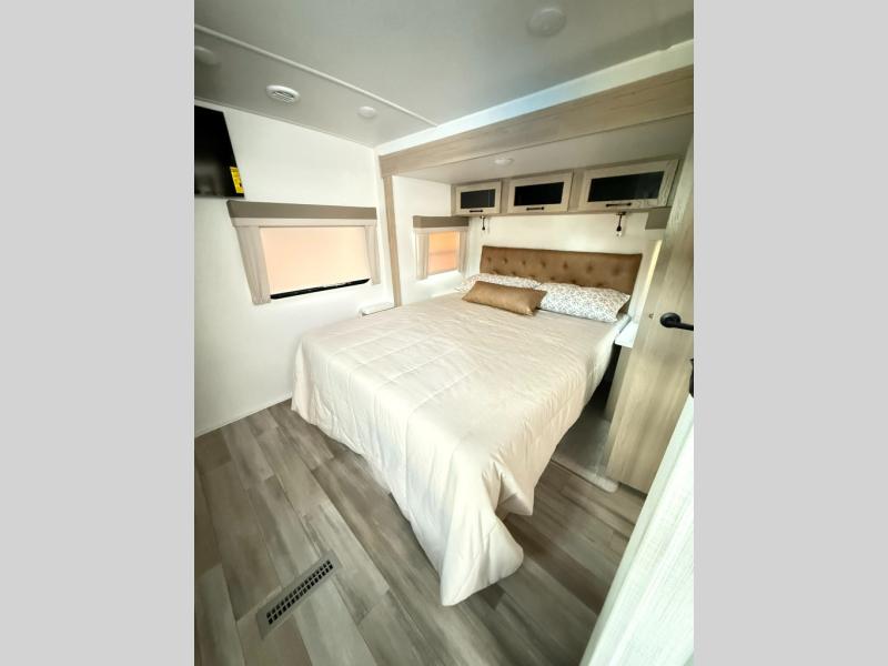 This is the perfect couples trailer with a spacious living and kitchen area and a rear bedroom which includes the second exterior entry/exit door! The bedroom also provides a slide out queen bed, a wardrobe and an optional TV, plus windows for great views and access to the double entry bathroom. The front kitchen gives the cook counter space and cabinetry for dishes and such, plus all the appliances needed to make warm meals and store leftovers. You can dine at the booth dinette, relax on the 67" theater seating and watch the Smart TV while enjoying the fireplace.