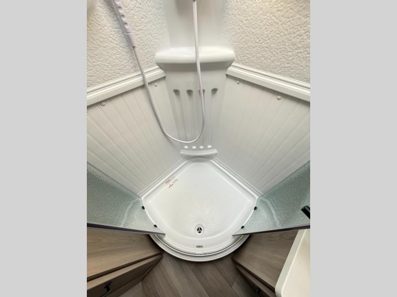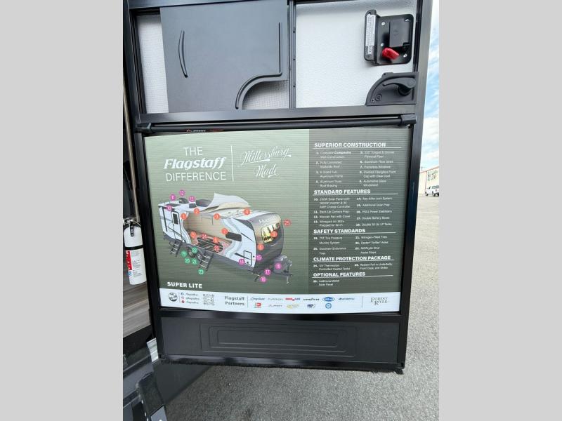 With any Flagstaff Super Lite travel trailer by Forest River the towing features include the TST tire pressure monitor system with a monitor providing safety on the road, Easy Lube axles and Nev-R adjust brakes, a power tongue jack for easy setup, and rear observation camera prep. Each is built with 6 sided aluminum framed side walls, end wall, front, floor and a roof, a plywood tongue and groove subfloor, electronically controlled heated holding tanks and an enclosed underbelly allowing you to travel during any season. The interior offers a multi-zone stereo with DVD, CD, AM/FM and Bluetooth control, a Showermiser water saving system, designer bedding and so much more!