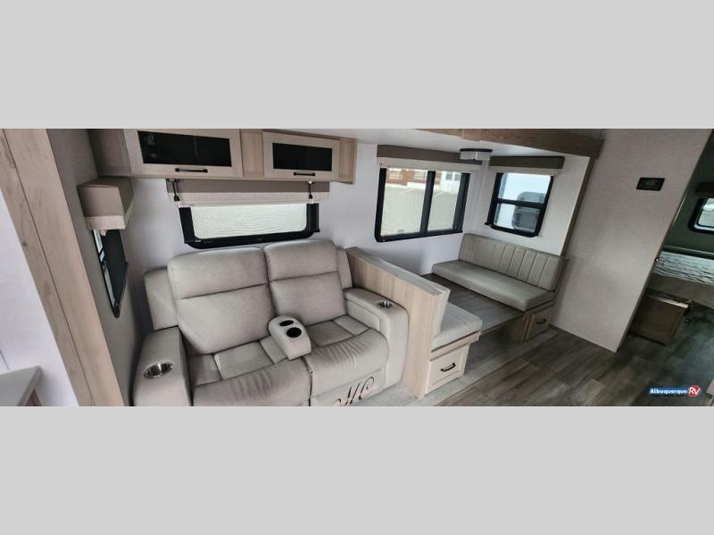 Whether you camp at state parks, national forests or on your friend's land, this trailer offers you plenty of floor space thanks to the two slide outs! As you enter the main entrance near the rear kitchen you can grab a drink from the 12V refrigerator or a snack from the pantry and relax on the 60" theater seating or sit at the booth dinette. The Smart TV offers entertainment while the fireplace will keep you cozy during the cooler months. Everyone will appreciate having a full bathroom to get cleaned up in, and the front bedroom gives you privacy and a queen bed slide, plus storage and the second exterior entry.