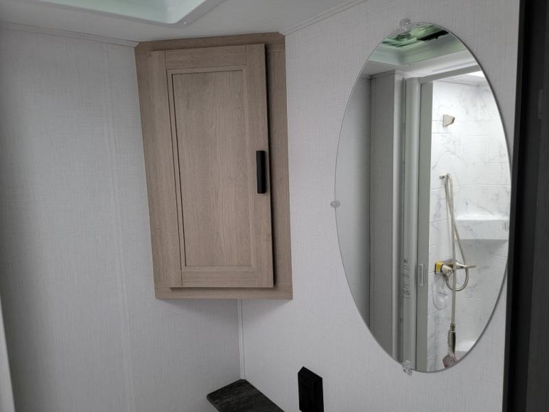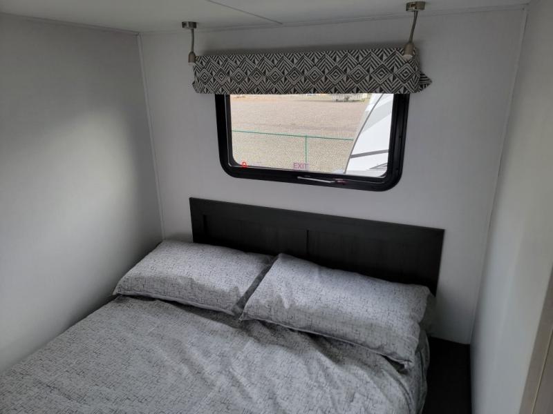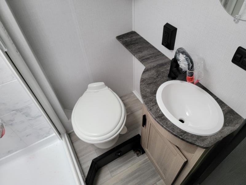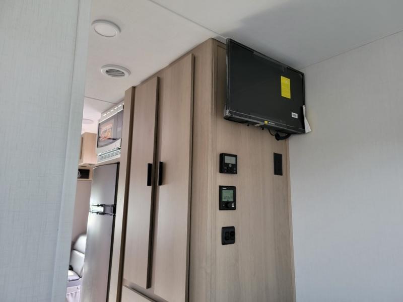Looking for easy driving, comfortable sleeping arrangements, and a place to dine inside when you are on the road? This is the perfect couples coach with features like a wardrobe with drawers across from the side full bathroom with a shower, a double-size bed for two in the rear, plus full kitchen amenities. You will also find a 12V LED flat panel adjustable side TV and a 12V bedroom TV. There is an optional 190 watt 12V charging system if you would like to add that feature for off-grid camping.