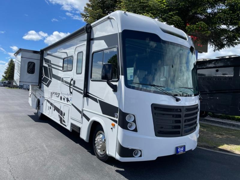 With each FR3 Class A gas motorhome by Forest River, you will find an easy-to-drive coach with a spacious interior allowing you to gather with friends and family with convenience and style found throughout! Each is built with vacuum-bonded construction, a one-piece fiberglass roof with extended rain spouts, a steel firewall and A-pillar extension, Bi-LED headlamps and lower LED fog lights, and grey Rotocast storage boxes with drains. Inside, you will enjoy black hardware, appliances, plumbing fixtures, and a glass shower door frame. You will also find a stainless steel kitchen sink with a bamboo cutting board and roll-up dryer, heavy-duty full-extension ball bearing drawer guides, dual-access dinette storage with doors, and nightstands with charging stations to keep your cellphones ready for whatever is next. Make your selection today!