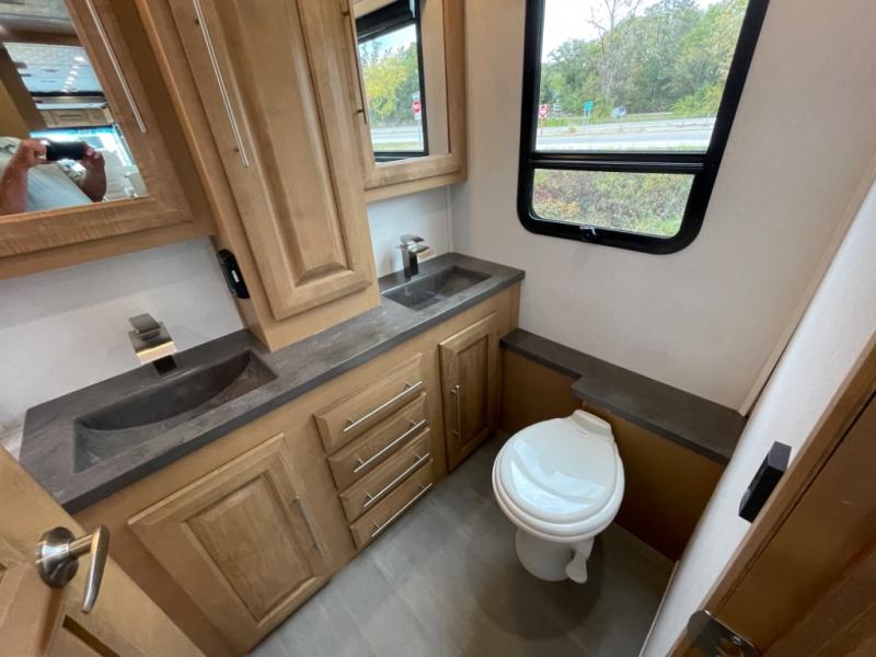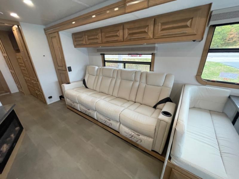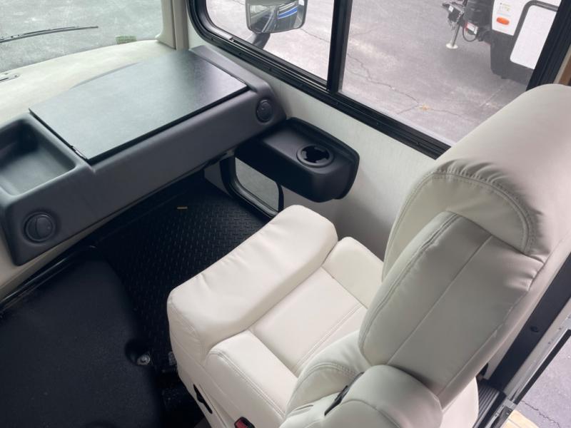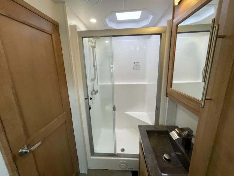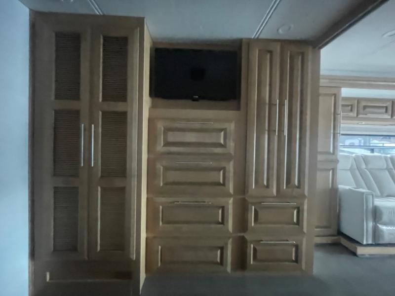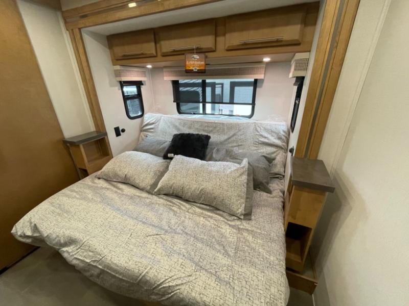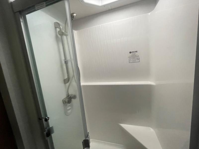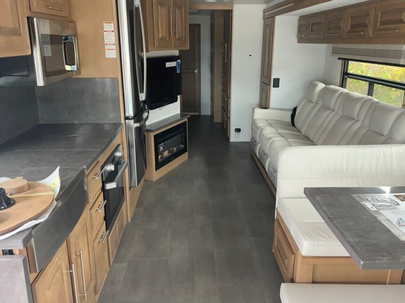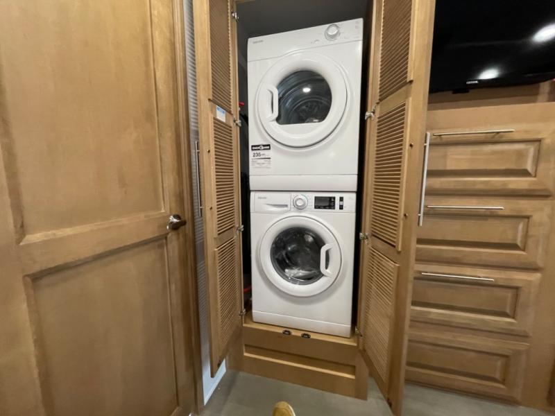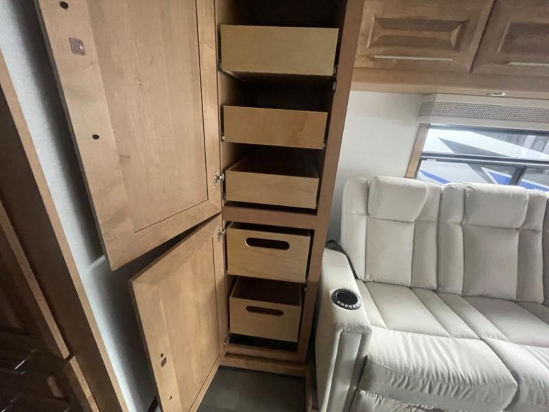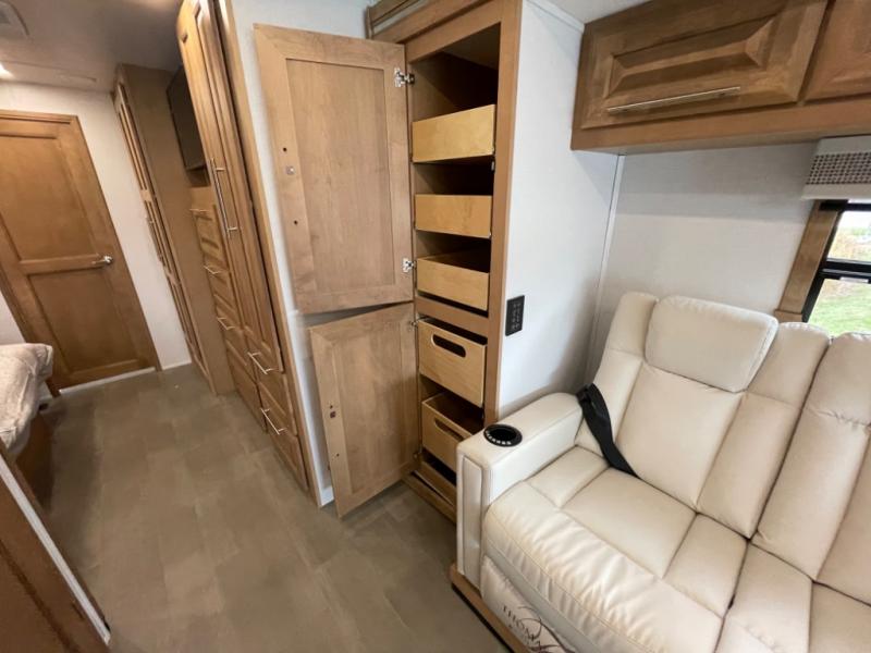 Comfort and convenience is found all throughout this motorhome! Starting with the full rear master bath that has a 42" x 30" shower with a seat and a dual sink vanity, plus it leads into the private bedroom. Inside the bedroom is a 72" x 80" king bed slide with overhead cabinets across from a dresser with overhead cabinets and a 32" LED TV, a wardrobe, and another wardrobe that is prepped to add an optional stackable washer and dryer. The half bathroom is conveniently near the fully equipped kitchen so you can get back to creating your best home cooked meals fast. Relax in true comfort each night by either playing games at the booth dinette or on the theater seating that comes with power recline, heat, and massage!