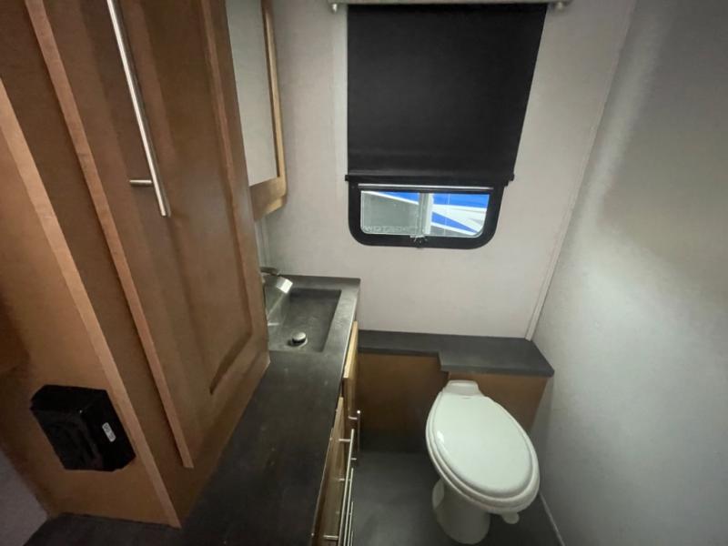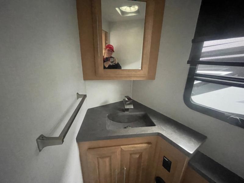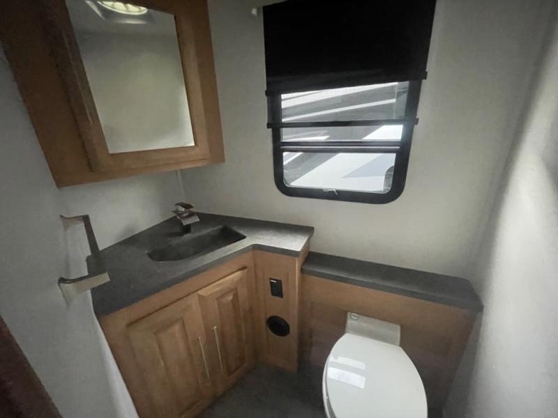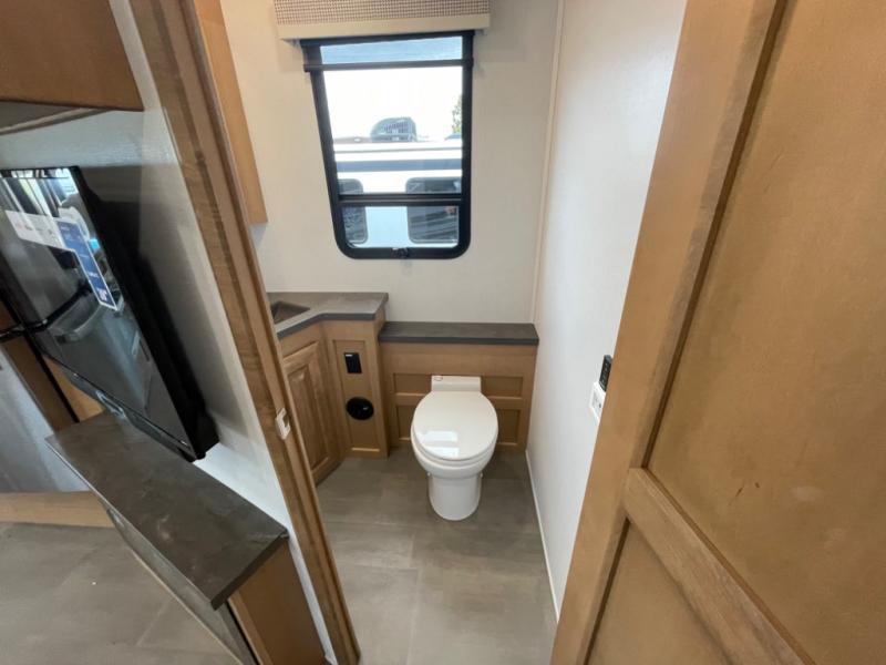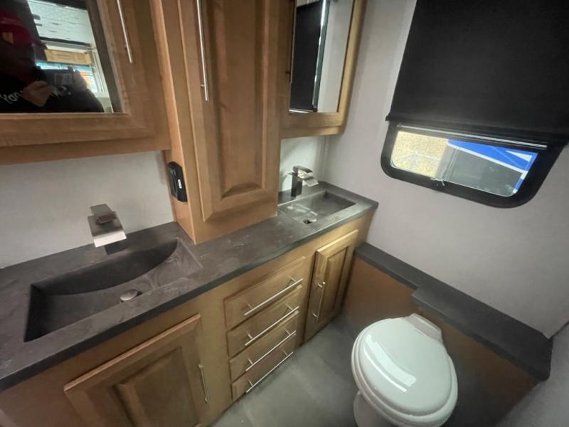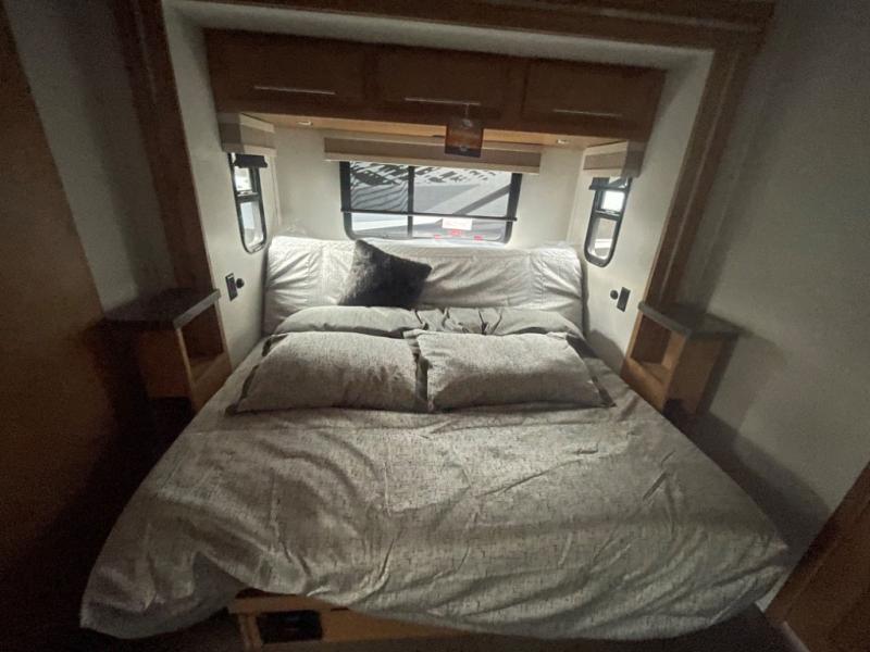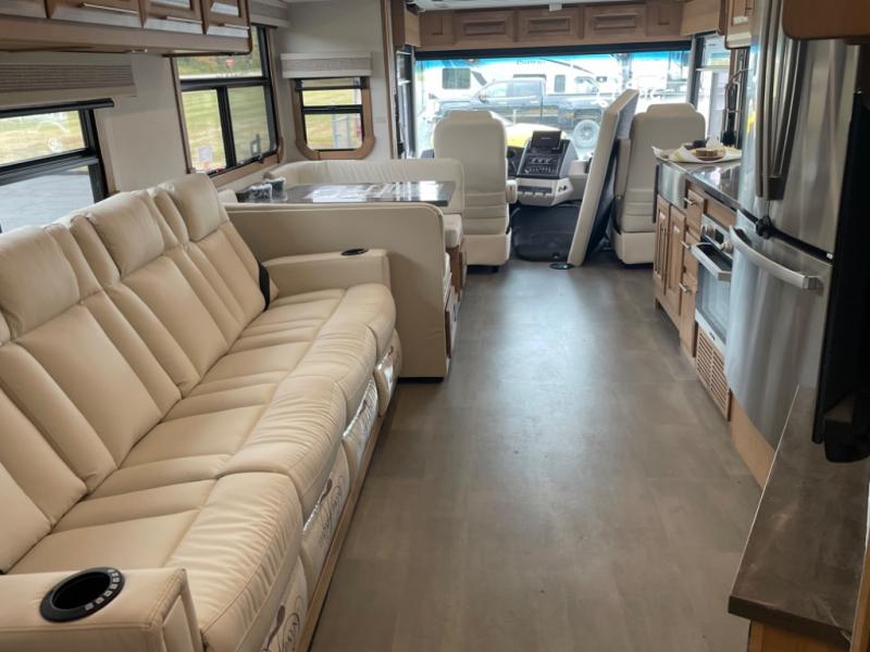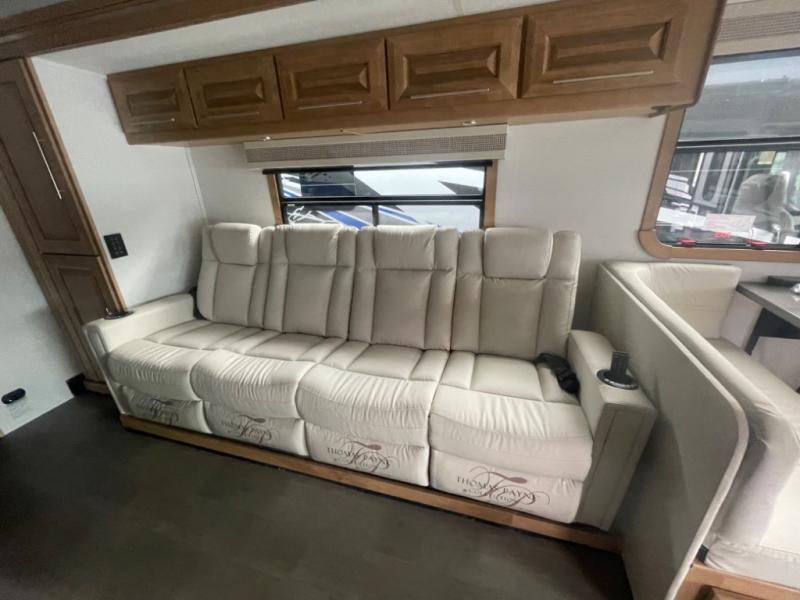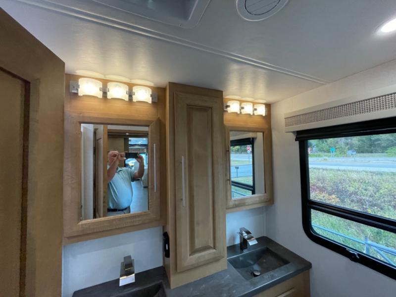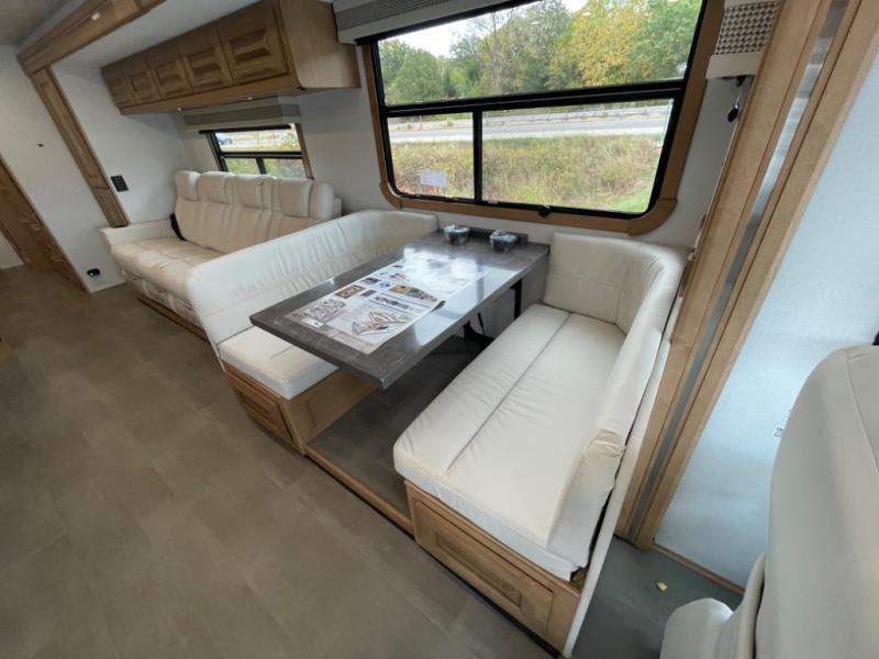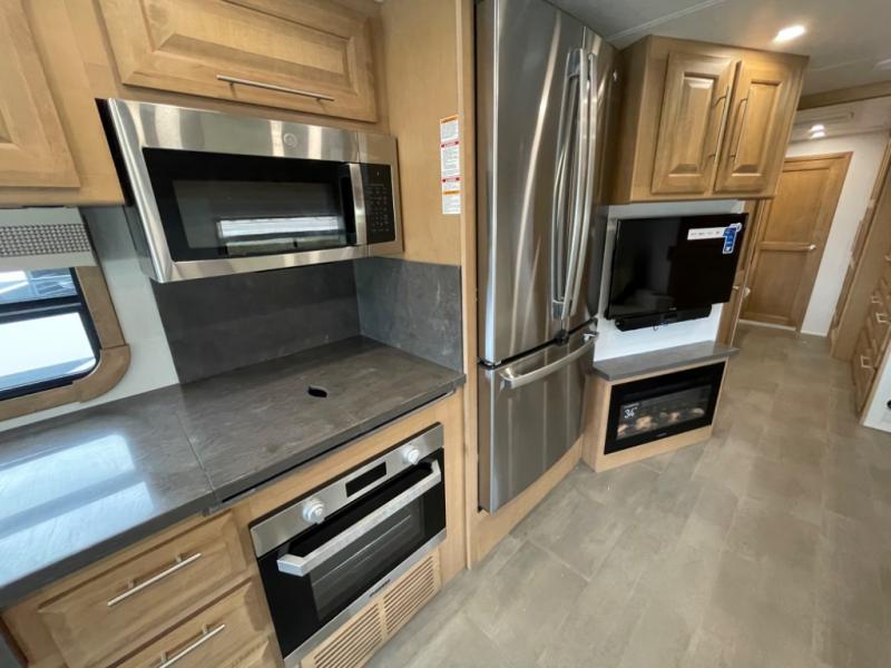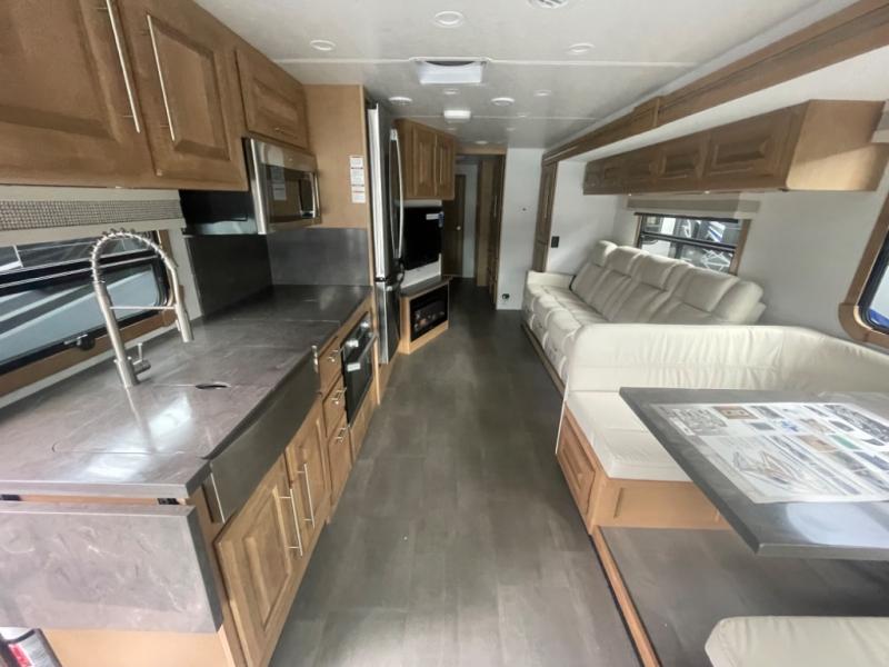 Comfort and convenience is found all throughout this motorhome! Starting with the full rear master bath that has a 42" x 30" shower with a seat and a dual sink vanity, plus it leads into the private bedroom. Inside the bedroom is a 72" x 80" king bed slide with overhead cabinets across from a dresser with overhead cabinets and a 32" LED TV, a wardrobe, and another wardrobe that is prepped to add an optional stackable washer and dryer. The half bathroom is conveniently near the fully equipped kitchen so you can get back to creating your best home cooked meals fast. Relax in true comfort each night by either playing games at the booth dinette or on the theater seating that comes with power recline, heat, and massage!