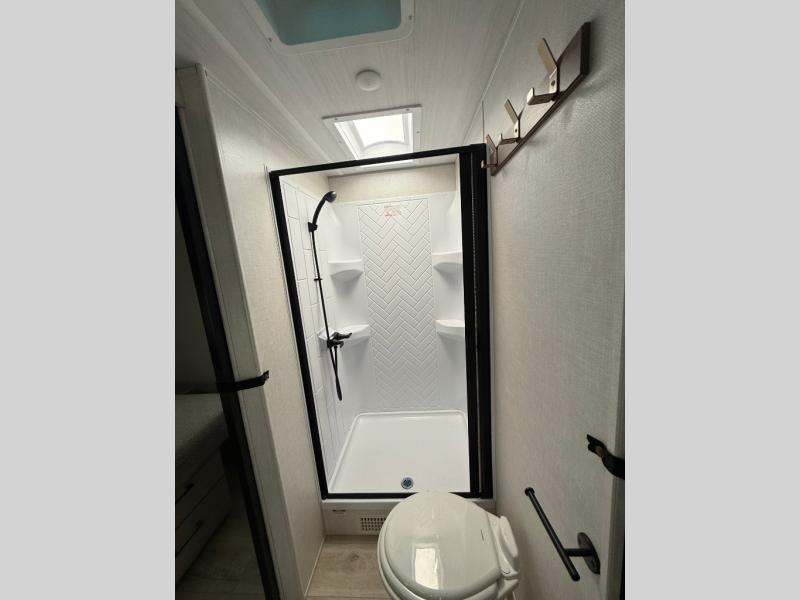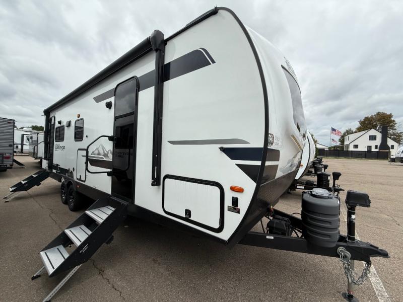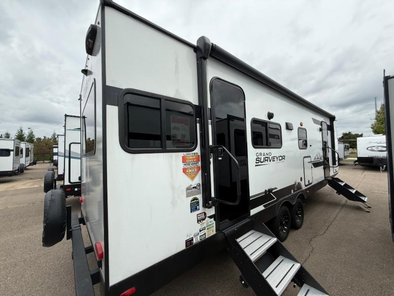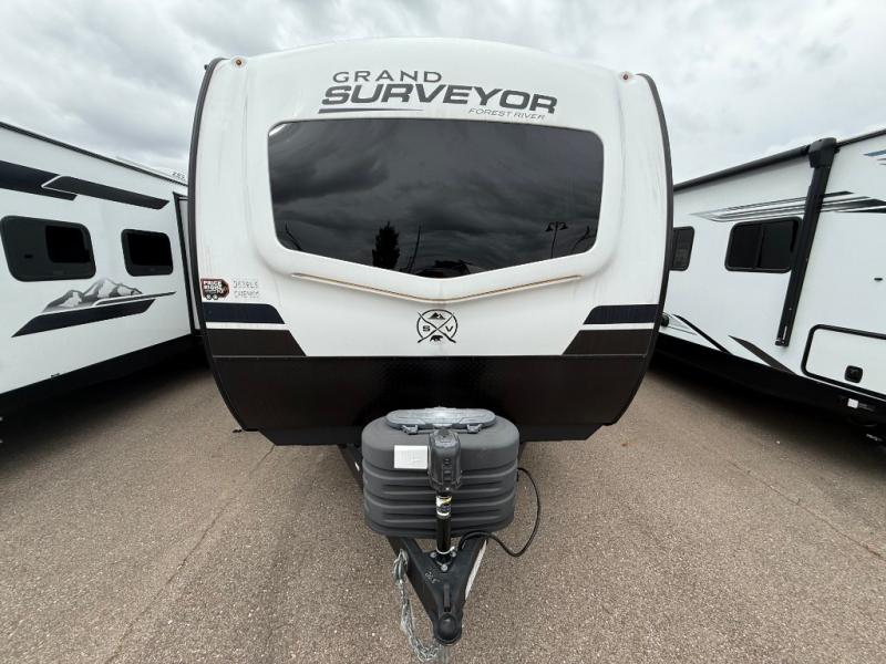 With any Grand Surveyor travel trailer by Forest River you will enjoy turn-key ready-to-go features and quality construction! Each model includes Azdel composite walls and a gel coated fiberglass front cap with an automotive style tinted windshield for a sleek look. There are friction hinge black glass entry door(s), an adjustable platform step with a night light, plus Goodyear tires and a power tongue jack for easy towing. The interior will have you feeling right at home with roller shades, residential faucets, sinks, and bathroom vanity, plus Surf(x) seamless countertops throughout. You can also plan for adventure with a 2" rear accessory and exterior spray port, and there are slam latch baggage doors throughout to keep all your gear secure. Other stand-out features include a central vacuum system, a 200 watt solar panel with a 30 amp controller, a tankless water heater, carpet-free interiors, and the list goes on!