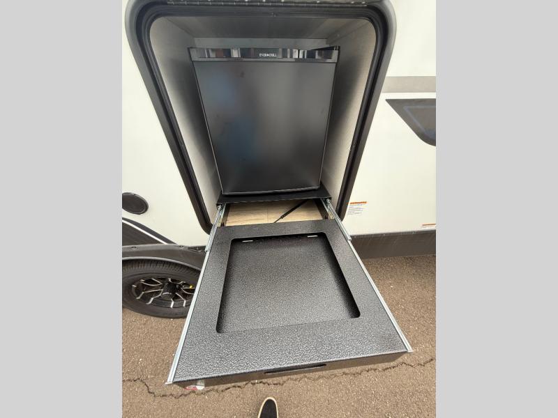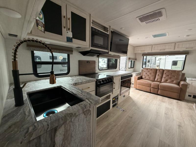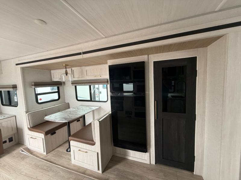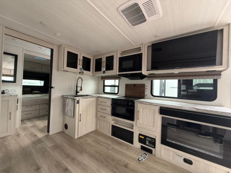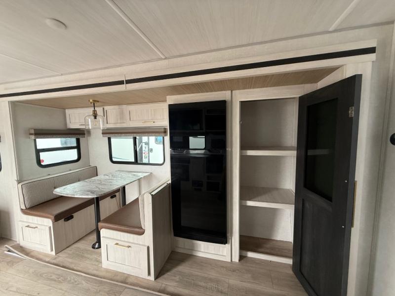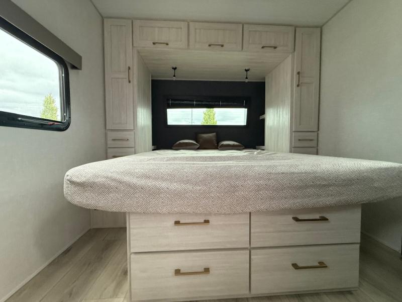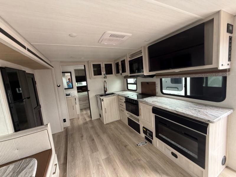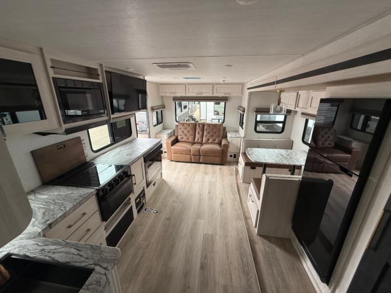 Camping your favorite site has never been more relaxing than in this travel trailer. You can comfortably sleep five to six each night with the custom king bed in the front master bedroom, plus the tri-fold sofa and booth dinette in the rear living area. There is also a walk-through bath that will easily accessible for everyone to use. Whip up your best meals on the residential range, or head outdoors to cook on the gas griddle included within the outdoor kitchen. You'll also find a sink and a refrigerator, and a 21' power awning with LED lights to create the perfect outdoor living space. After a day outdoors, you can relax by the fireplace or watch a movie on the HD TV, and there is a large kitchen pantry to stock up on snacks!