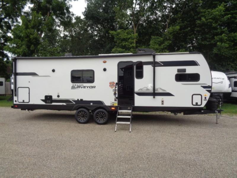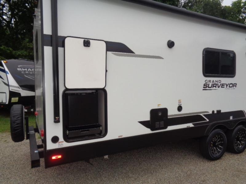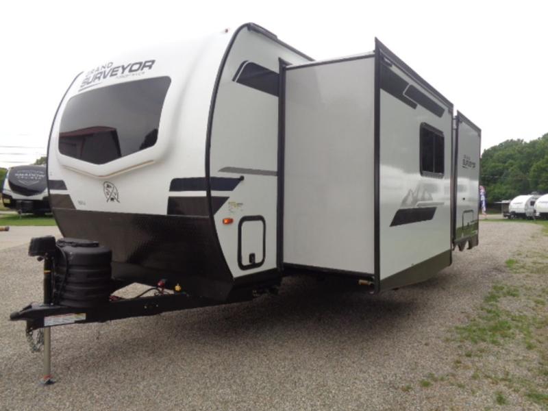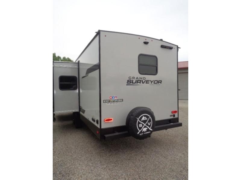 With any Grand Surveyor travel trailer by Forest River you will enjoy turn-key ready-to-go features and quality construction! Each model includes Azdel composite walls and a gel coated fiberglass front cap with an automotive style tinted windshield for a sleek look. There are friction hinge black glass entry door(s), an adjustable platform step with a night light, plus Goodyear tires and a power tongue jack for easy towing. The interior will have you feeling right at home with roller shades, residential faucets, sinks, and bathroom vanity, plus Surf(x) seamless countertops throughout. You can also plan for adventure with a 2" rear accessory and exterior spray port, and there are slam latch baggage doors throughout to keep all your gear secure. Other stand-out features include a central vacuum system, a 200 watt solar panel with a 30 amp controller, a tankless water heater, carpet-free interiors, and the list goes on!