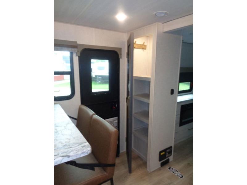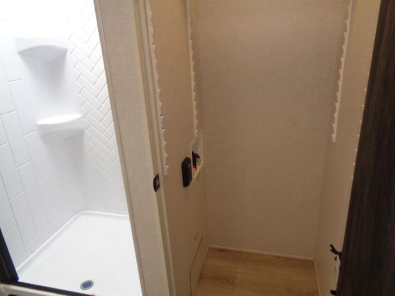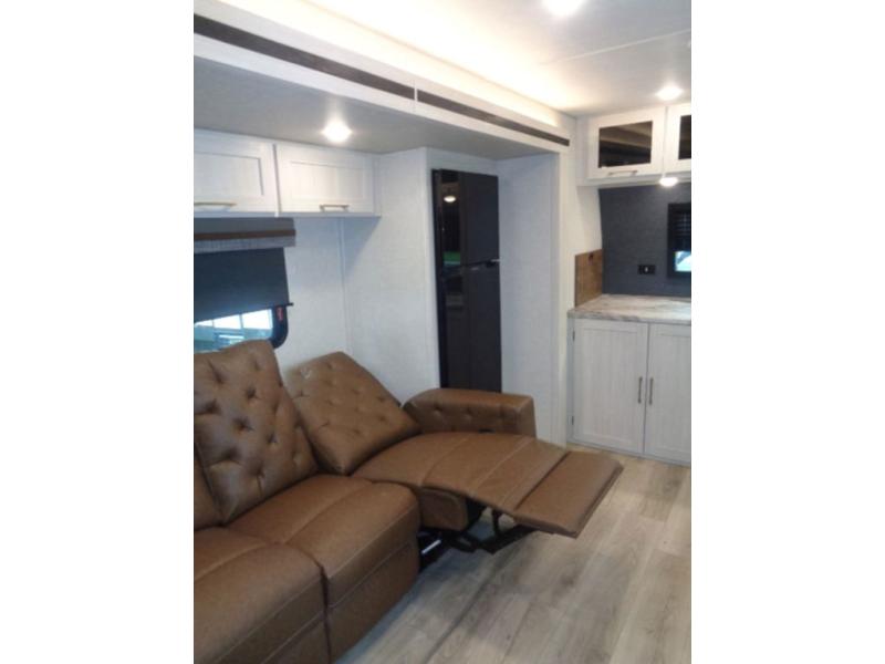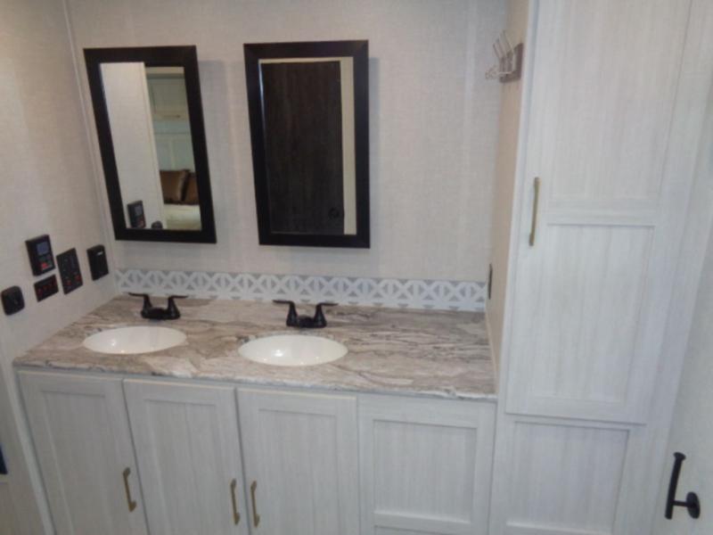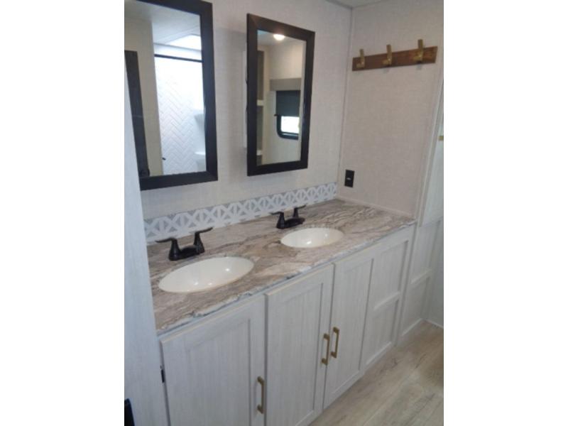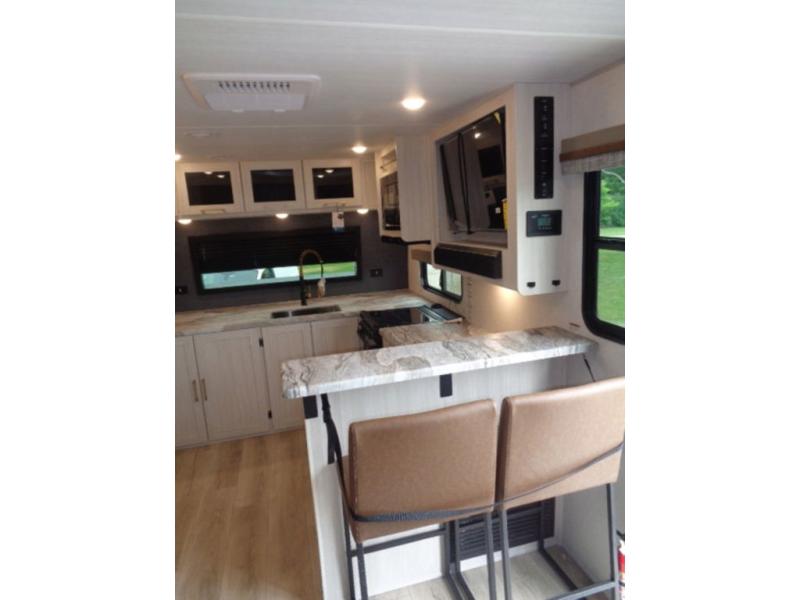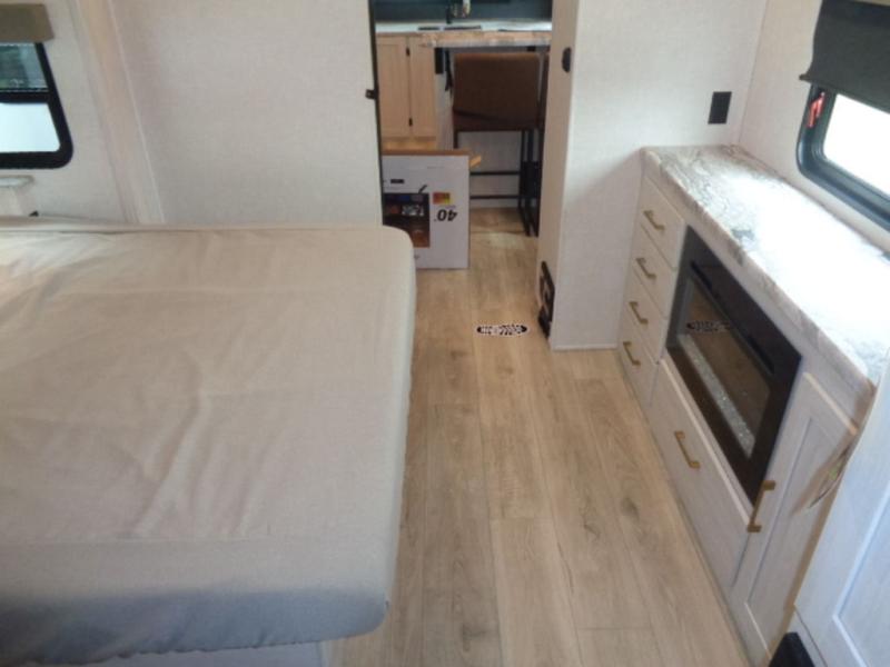 This couple's trailer will be giving you all the glamping vibes! There is a front kitchen with ample counter space, along with a counter with two bar stools, a central vacuum to easily clean up, and a slide out for more space! The second slide out is found in the middle master bedroom where you'll also enjoy a custom king bed across from a bedroom fireplace, a wardrobe, and a dresser with TV prep. Head towards the back and you'll be wowed by the full bath with dual bath sinks, an upgraded slow-close shower door, and a closet with washer and dryer prep. The exterior is just as impressive as the interior with its outside kitchen, 20' power awning with LED lights, pass-through storage, TV coax, and so much more!