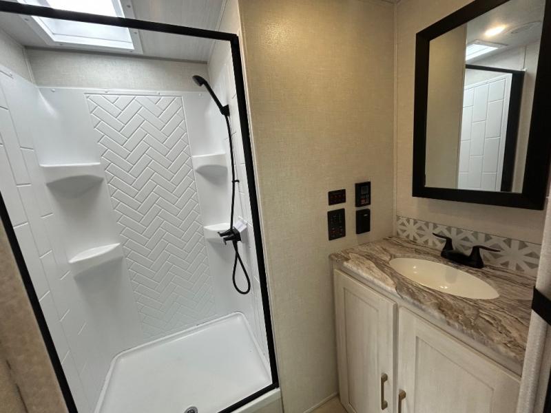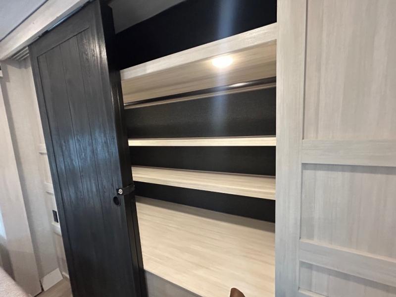 When it’s time to wind down, the front master suite invites you in with a custom king bed slide, a second fireplace, full-wall wardrobe, dresser with desk, and a washer/dryer prep area. The full bath is spacious and well-equipped for total comfort.