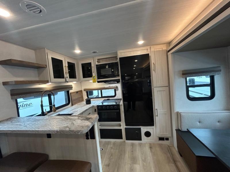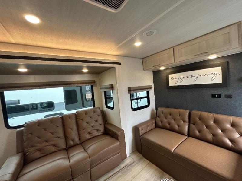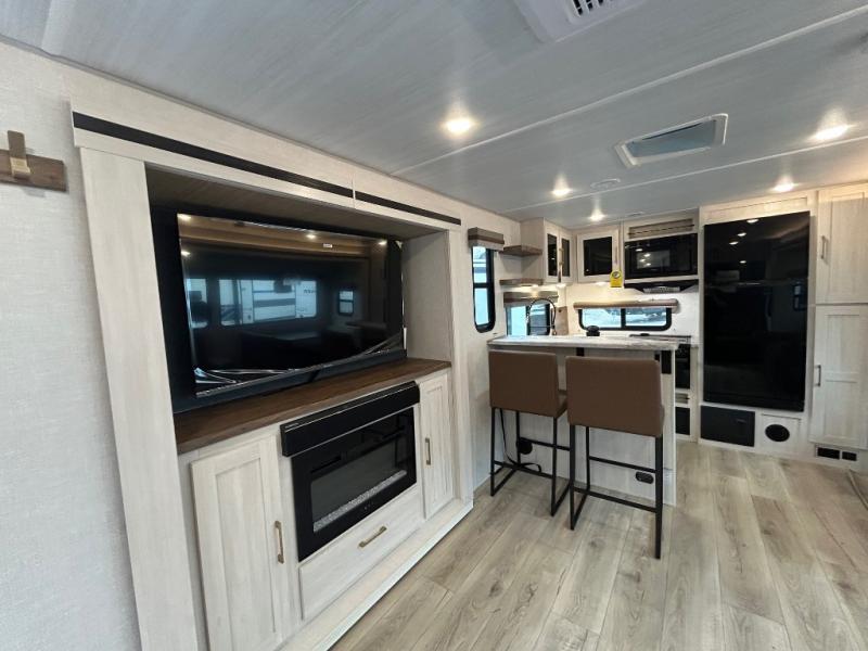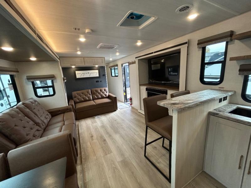 Discover the perfect blend of comfort, style, and functionality with the Grand Surveyor 301RKBS travel trailer by Forest River. Designed for travelers who want it all, this spacious model features a rear kitchen layout with ample storage and a cozy breakfast bar complete with two chairs, creating a welcoming U-shaped space for morning coffee or evening snacks.