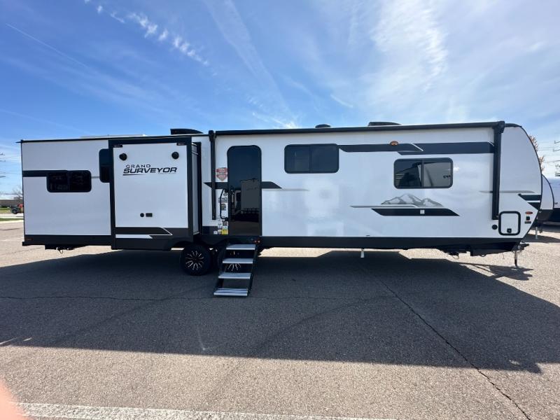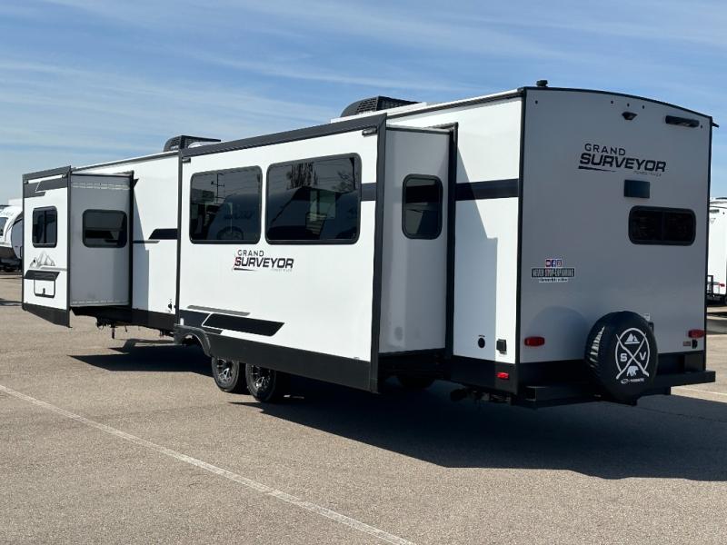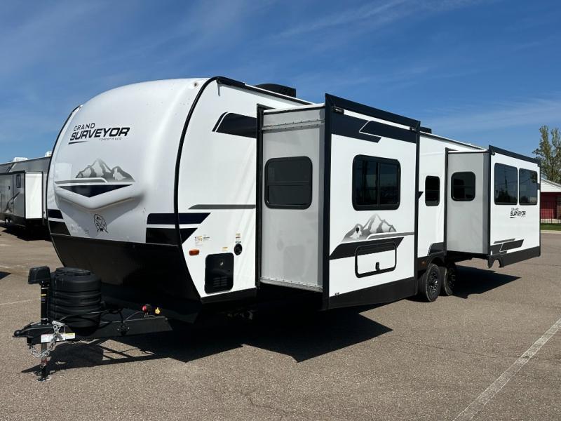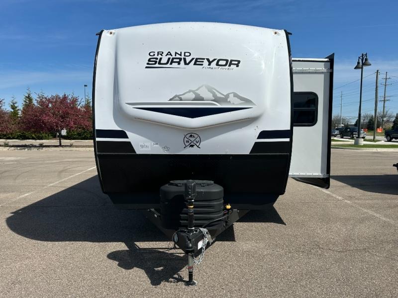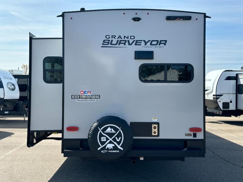 With any Grand Surveyor travel trailer by Forest River you will enjoy turn-key ready-to-go features and quality construction! Each model includes Azdel composite walls and a gel coated fiberglass front cap with an automotive style tinted windshield for a sleek look. There are friction hinge black glass entry door(s), an adjustable platform step with a night light, plus Goodyear tires and a power tongue jack for easy towing. The interior will have you feeling right at home with roller shades, residential faucets, sinks, and bathroom vanity, plus Surf(x) seamless countertops throughout. You can also plan for adventure with a 2" rear accessory and exterior spray port, and there are slam latch baggage doors throughout to keep all your gear secure. Other stand-out features include a central vacuum system, a 200 watt solar panel with a 30 amp controller, a tankless water heater, carpet-free interiors, and the list goes on!