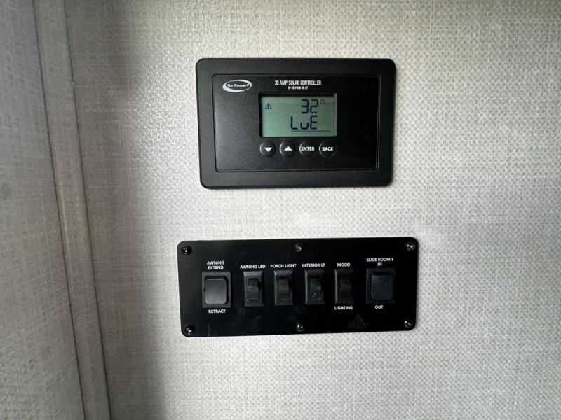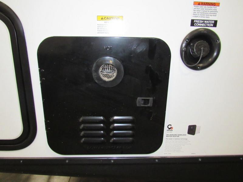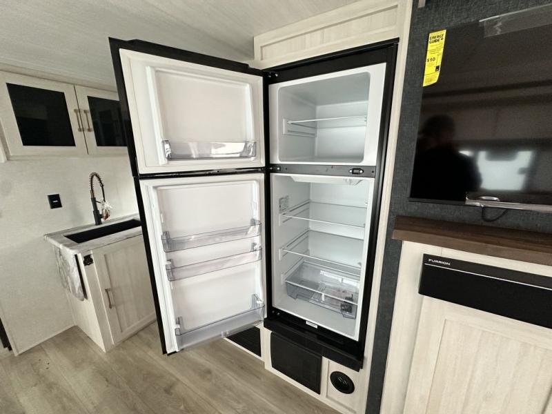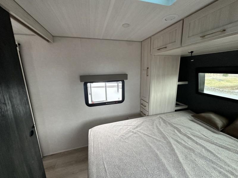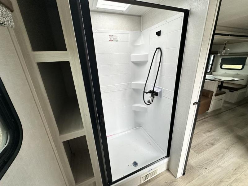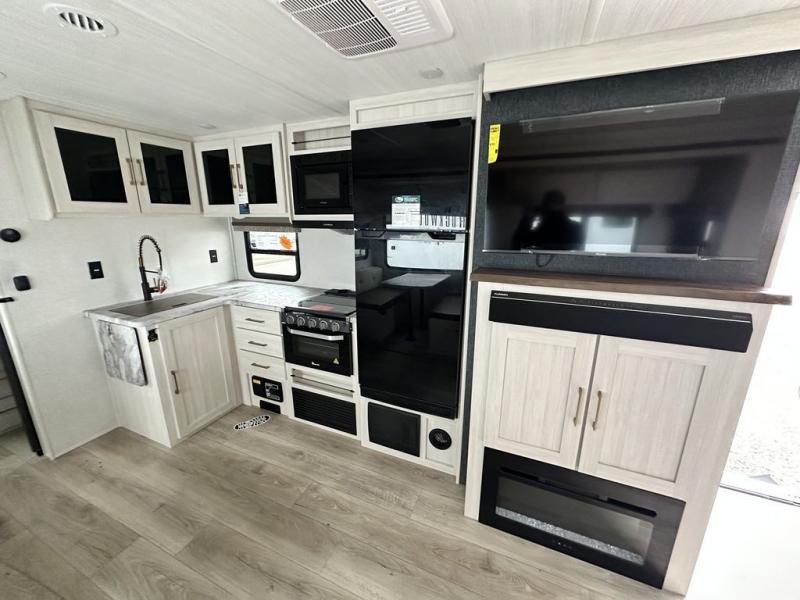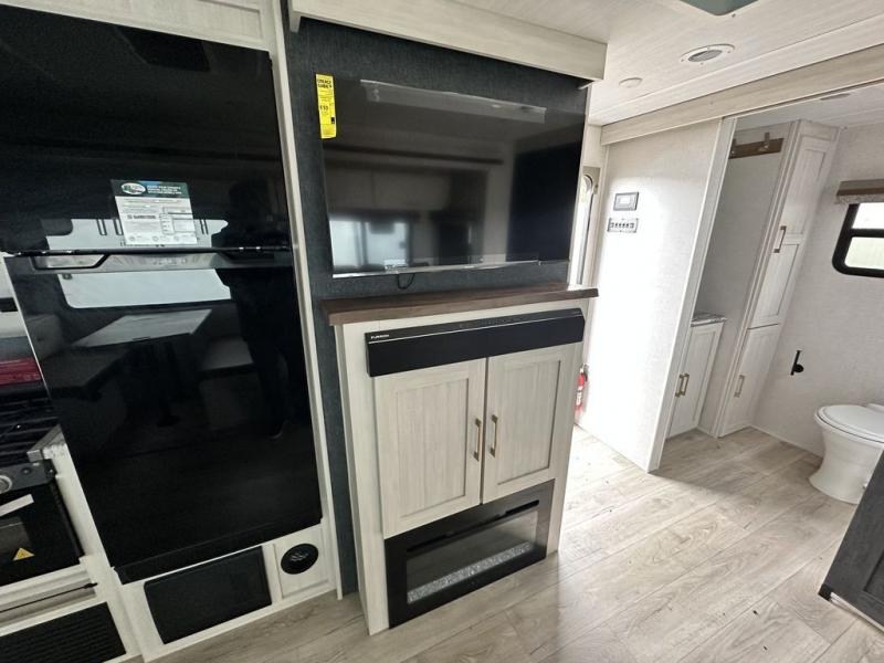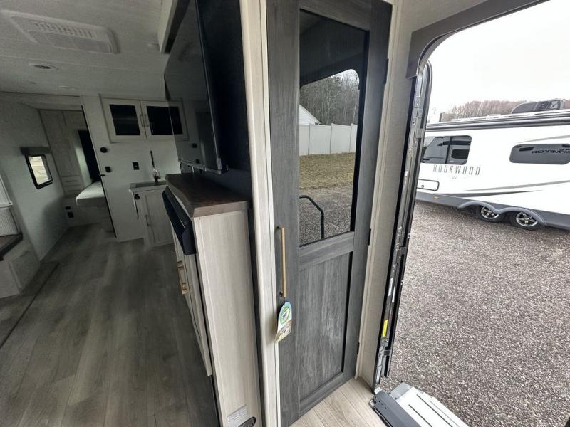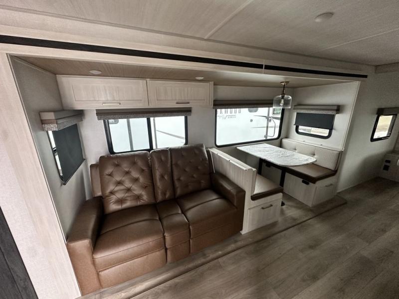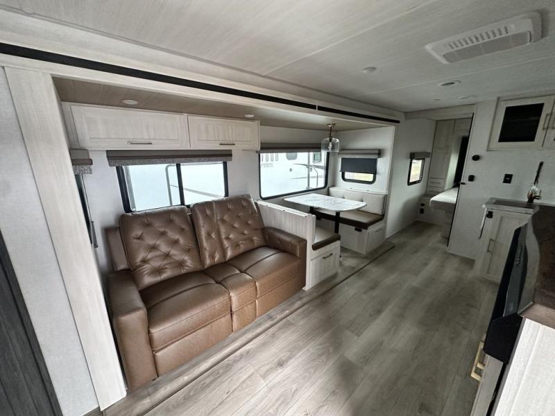 No need to rough it when you camp; this trailer offers amenities that allow you to "Glamp" if you want! The rear spacious bathroom is tucked away behind a beautiful barn door, and inside features a 30" x 36" shower, wardrobe, and linen storage. The front master bedroom offers privacy, a walk-around custom king bed, dual wardrobes and underbed storage, plus TV prep if you want the option to watch movies in bed. The L-shaped counter in the kitchen provides enough space to have everything at your fingertips while you cook, plus there is a countertop extension for more prep and serving space if needed. A nice walk-in pantry just inside the entry door will be perfect for chips and snacks or canned goods for those longer camping trips. If dining inside, the booth dinette with pull-out dinette drawers will be comfortable plus you will enjoy the view provided by the panoramic windows within the slide out. An outside kitchen will be a favorite for anyone that cooks, and the 19' awning will provide some protection from the elements and offering an outdoor living area to enjoy with everyone.