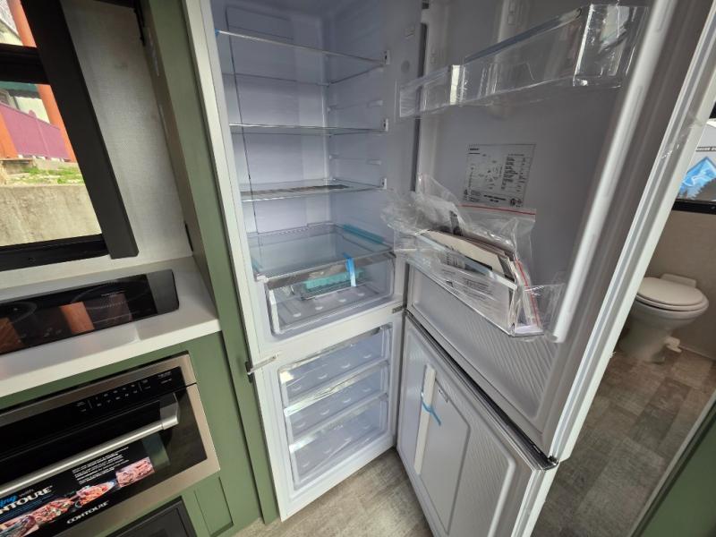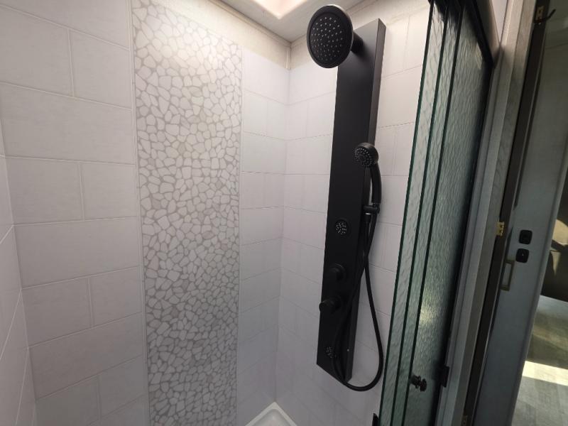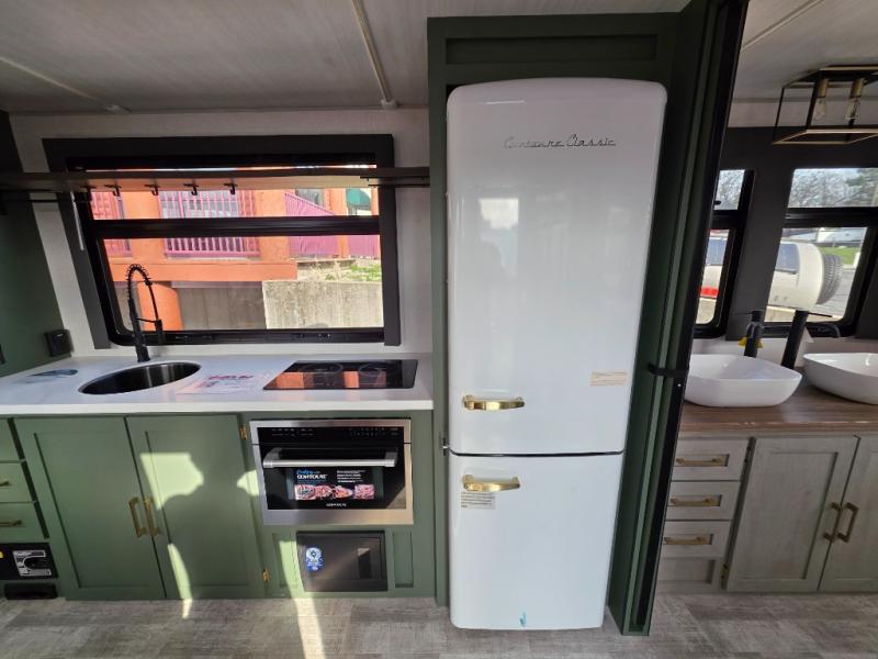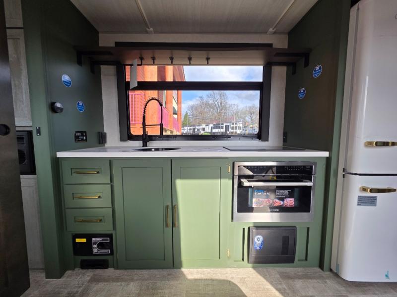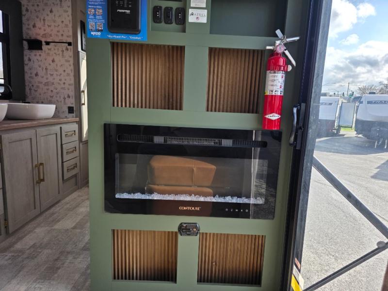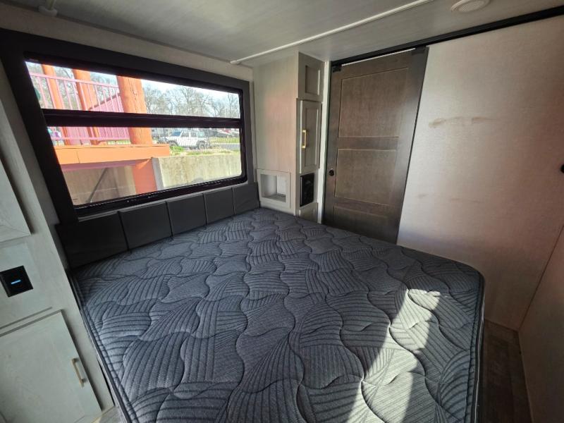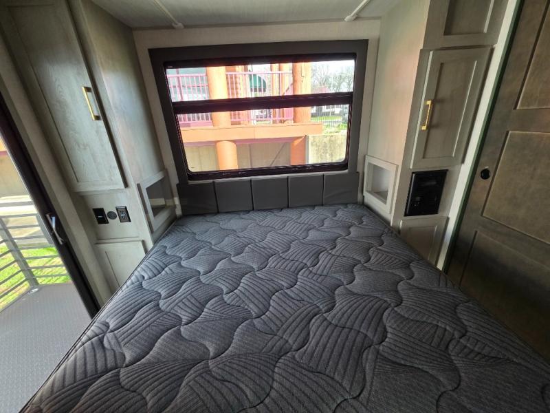 This model has a similar layout to RVS1, but you'll enjoy a fixed king bed slide out with storage instead of a fold up bed, a bedroom fireplace and a dresser, plus a desk with a chair. There are still rear doors with a sun deck, a middle living room/kitchen with a luxury lounge, and a full kitchen. The front bath is ultra luxurious with its dual bath sinks, waterfall shower, and optional washer/dryer combo!