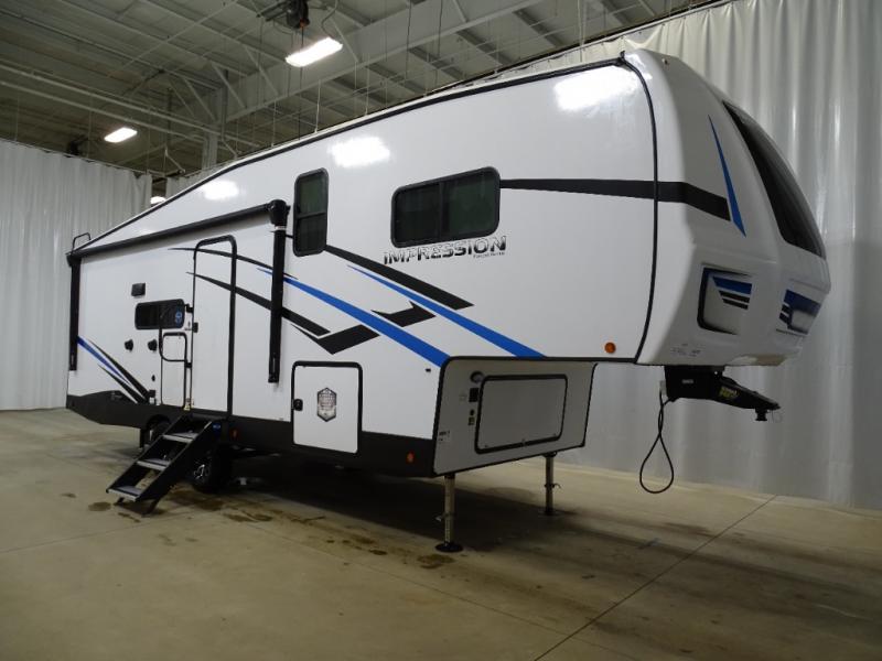 With any Impression mid-profile fifth wheel by Forest River, the focus of the design is comfort and value, built with quality craftsmanship and attention to customer's desires in each Impression! The exterior includes upgraded E-rated Goodyear Endurance tires made in the U.S.A., custom exterior graphics package, and One Touch automatic leveling system for easy setup. There is also an enclosed docking station and a gel coat fiberglass front cap with an automotive windshield with LED lights for style and beautiful views. The fully heated and enclosed AccessiBelly has removable underbelly panels and offers four seasons of travel. The interior has oversized opening windows in the living area for more natural lighting and good air flow, a stainless steel single bowl sink with high rise faucet with a pulldown sprayer to easily clean the dishes, and a porcelain foot flush toilet to mention a few comforts and conveniences.