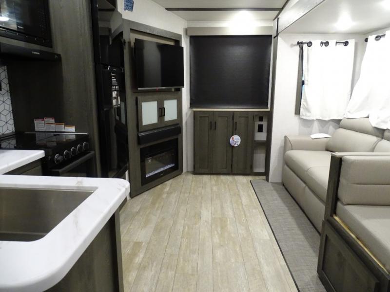 Whether you are a couple or a family this fifth wheel will make an impression! The large slide out provides plenty of space to relax, especially on the tri-fold sofa and booth dinette. The kitchen has everything the cook needs to keep everyone fed, plus there is a fireplace below a 40" LED TV to watch shows. The full bathroom includes a walk-in shower with a skylight for more headroom and lighting, and the front bedroom allows you to sleep like a queen and includes plenty of storage for two, plus a third wardrobe.
