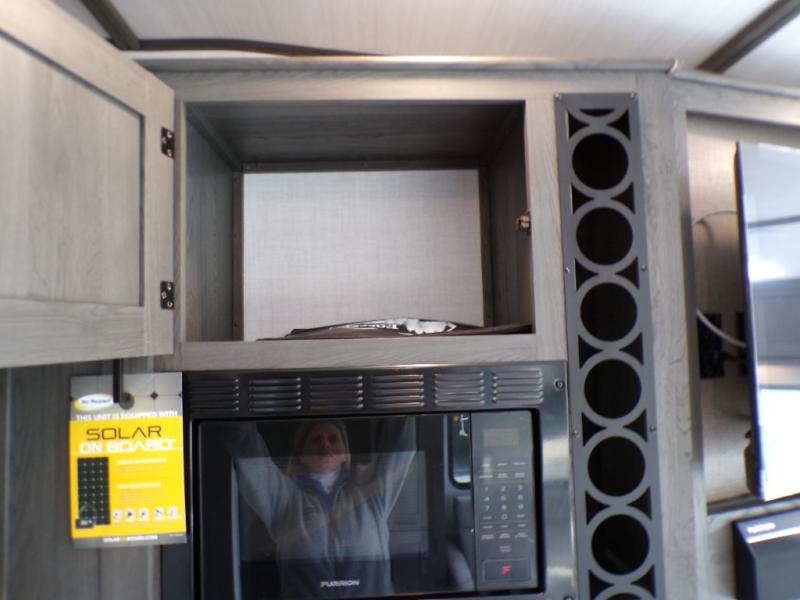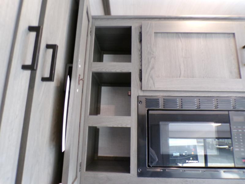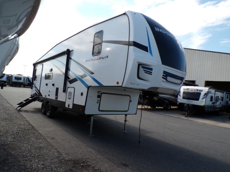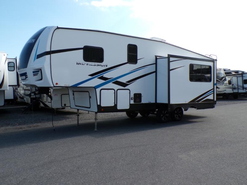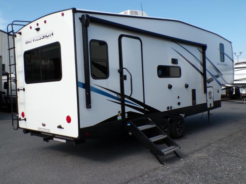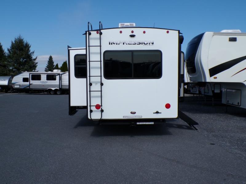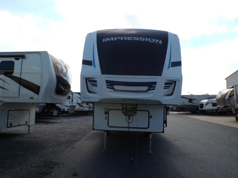 Four or six can travel together in this Impression fifth wheel comfortably featuring a single slide in the open concept living/kitchen area. Along the rear wall of the unit, you will find a 70" x 40" u-shaped dinette which is perfect for gathering around to dine and play games. This can also be converted for added sleeping space if needed. The 68" tri-fold sofa adjacent is found within the roadside slide that also features a pantry and 12 volt refrigerator, which is handy for all of your snacks and perishables. Opposite, an entertainment center with 40" TV that is easily viewable from the sofa or dinette. The kitchen also provides a three burner range, overhead microwave oven and sink, along with plenty of overhead cabinets for storage. Head up to the bath and front private bedroom where you will start or end your days with a nice walk-in shower including a skylight for more headroom and natural lighting. The private bedroom features a queen bed for a comfortable nights rest, dual bedside wardrobes and nightstands, as well as a wardrobe that has been prepped for a washer and dryer if you choose to add that convenience as well. On the outside, you will find an unobstructed pass-through compartment for your outdoor gear, a 17' awning for added outdoor living space, and a docking station with a Shurflow water pressure regulator, and more.