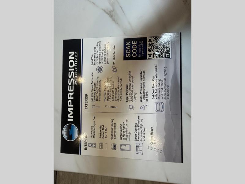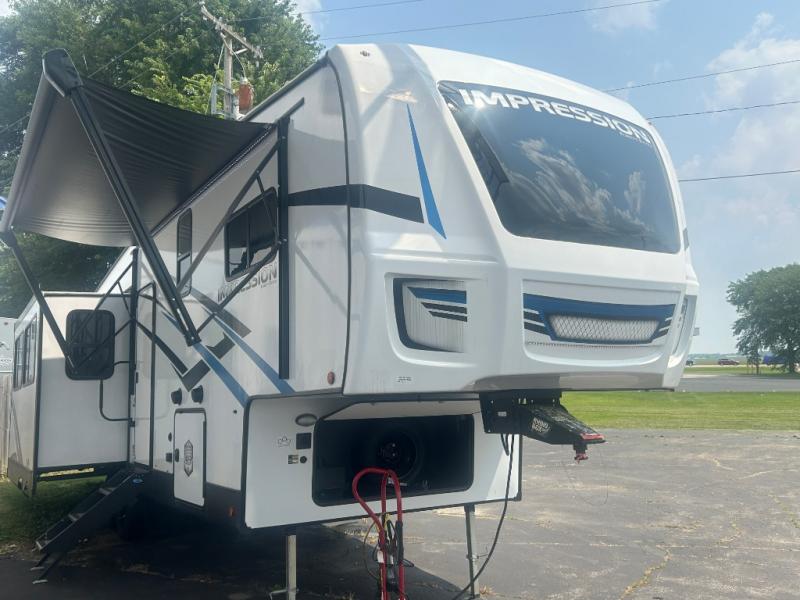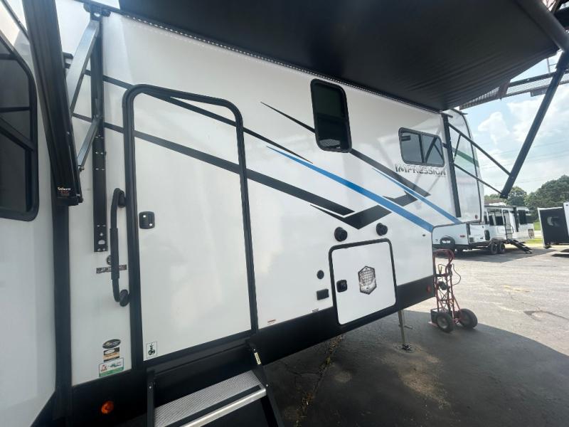 With any Impression mid-profile fifth wheel by Forest River, the focus of the design is comfort and value, built with quality craftsmanship and attention to customer's desires in each Impression! The exterior includes upgraded E-rated Goodyear Endurance tires made in the U.S.A., custom exterior graphics package, and One Touch automatic leveling system for easy setup. There is also an enclosed docking station and a gel coat fiberglass front cap with an automotive windshield with LED lights for style and beautiful views. The fully heated and enclosed AccessiBelly has removable underbelly panels and offers four seasons of travel. The interior has oversized opening windows in the living area for more natural lighting and good air flow, a stainless steel single bowl sink with high rise faucet with a pulldown sprayer to easily clean the dishes, and a porcelain foot flush toilet to mention a few comforts and conveniences.