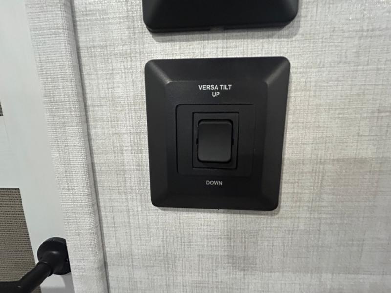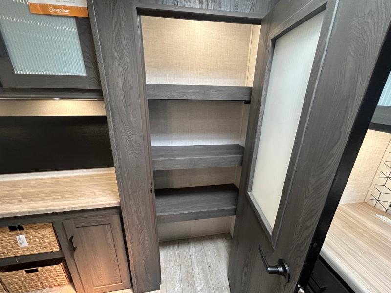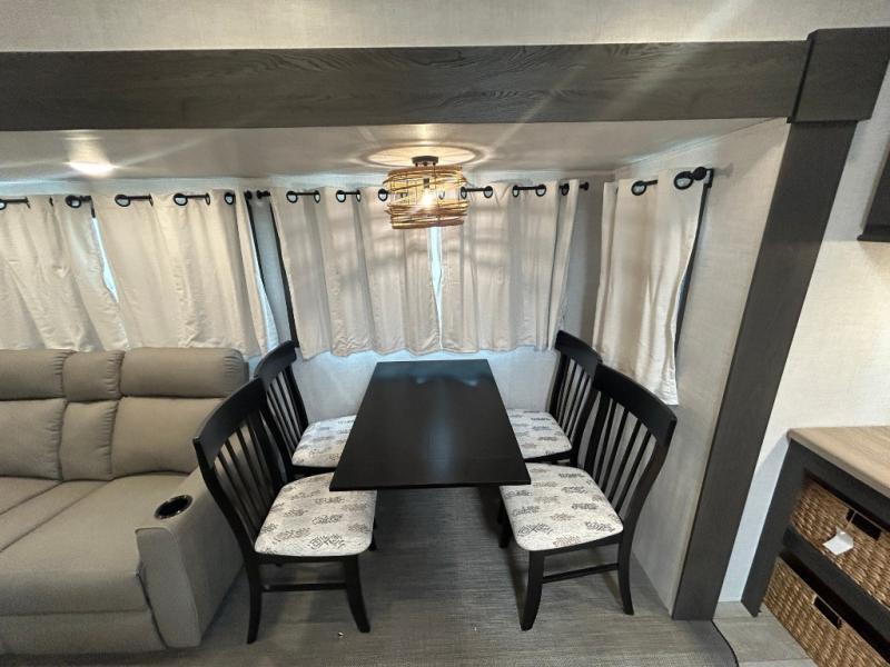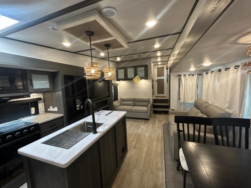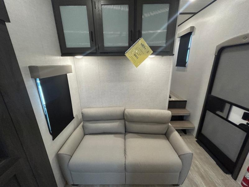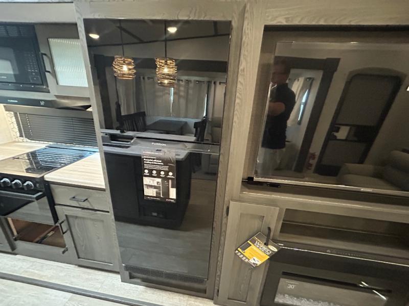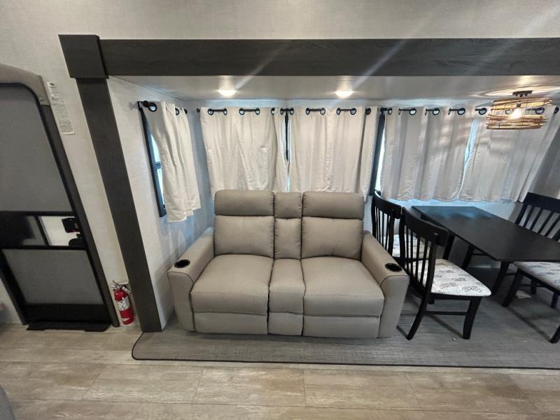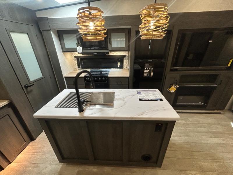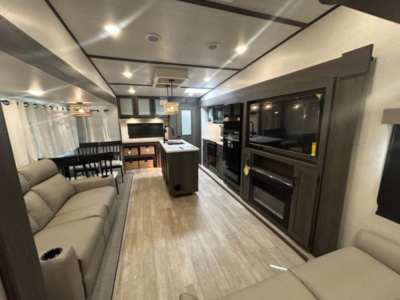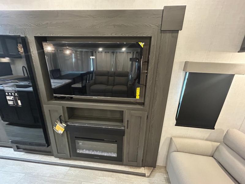 This fifth wheel is spacious, inviting and comfortable! Walk right inside to the combined kitchen and living area with two opposing slides, or walk around the kitchen island to access the floor-to-ceiling pantry. There is a large counter space plus lots of upper and lower cabinets for your dishes, games, and such. You can dine or even work at the free standing dinette with chairs, and relax on the theater seats with USB ports or the tri-fold hide-a-bed sofa while watching the LED TV with a soundbar and enjoying the fireplace below. Get cleaned up in the full bathroom and fall quickly to sleep on the walk-around queen bed with Versa Tilt technology in the front bedroom that includes three wardrobes, a space prepped for a washer/dryer option, plus nightstands.