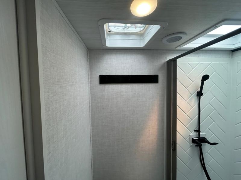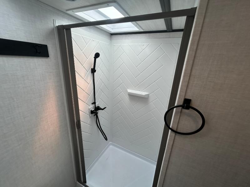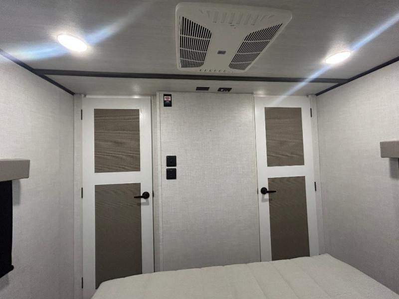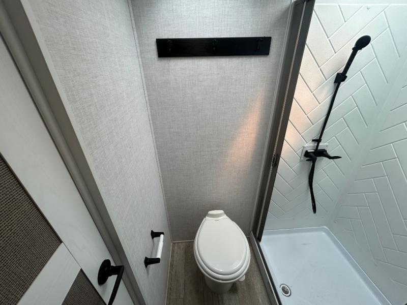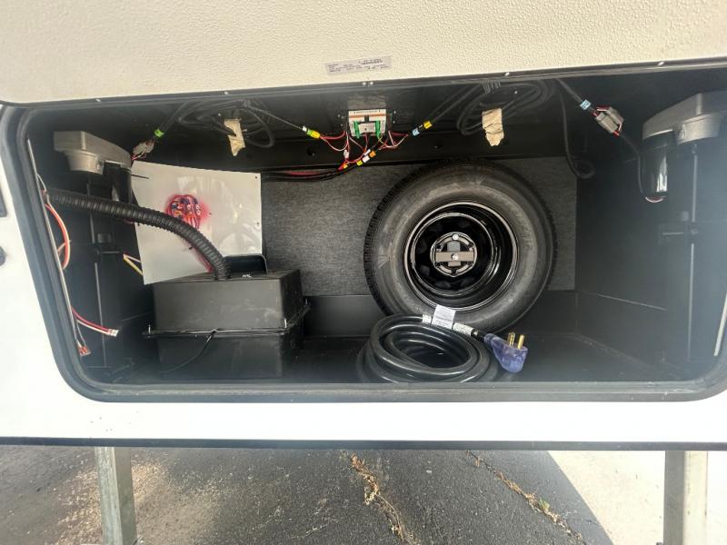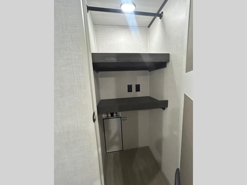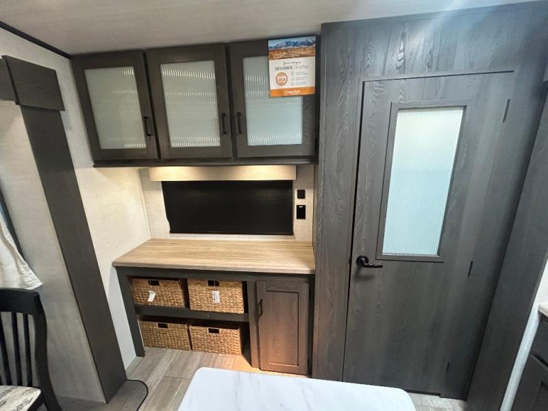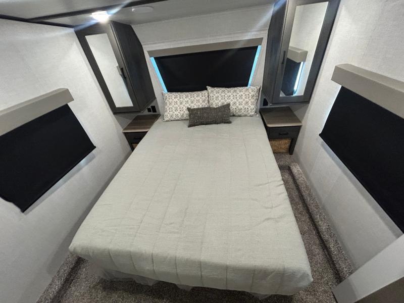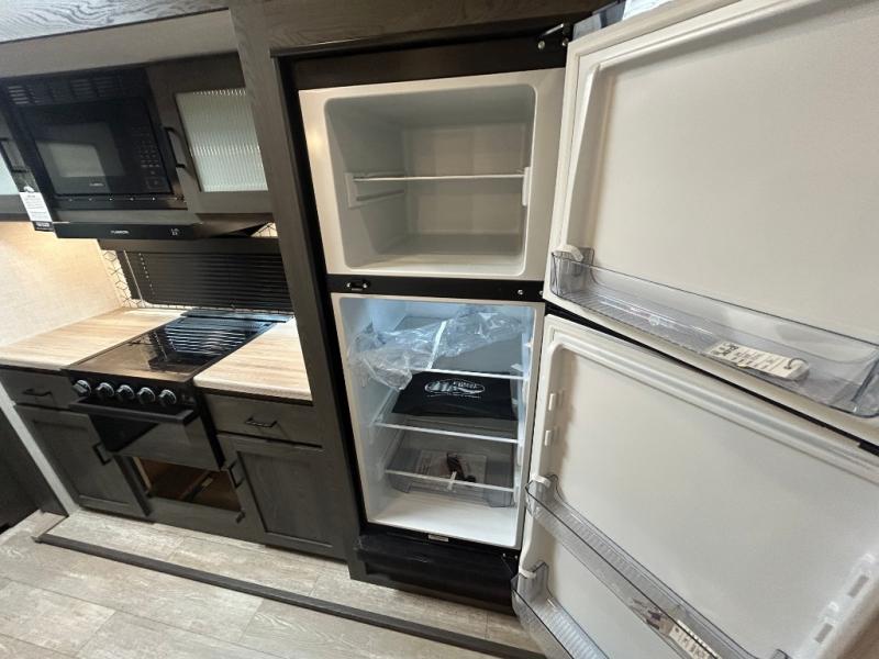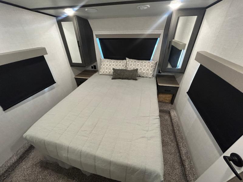 This fifth wheel is spacious, inviting and comfortable! Walk right inside to the combined kitchen and living area with two opposing slides, or walk around the kitchen island to access the floor-to-ceiling pantry. There is a large counter space plus lots of upper and lower cabinets for your dishes, games, and such. You can dine or even work at the free standing dinette with chairs, and relax on the theater seats with USB ports or the tri-fold hide-a-bed sofa while watching the LED TV with a soundbar and enjoying the fireplace below. Get cleaned up in the full bathroom and fall quickly to sleep on the walk-around queen bed with Versa Tilt technology in the front bedroom that includes three wardrobes, a space prepped for a washer/dryer option, plus nightstands.