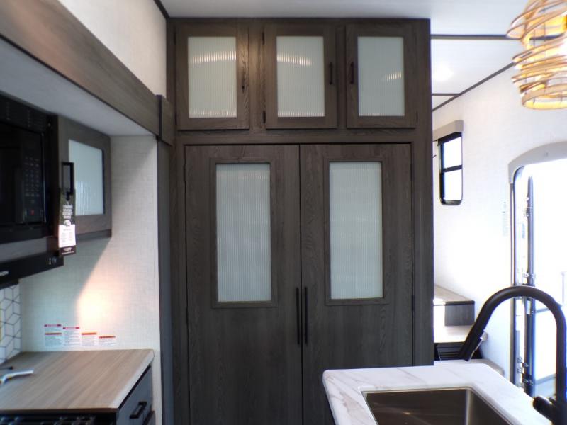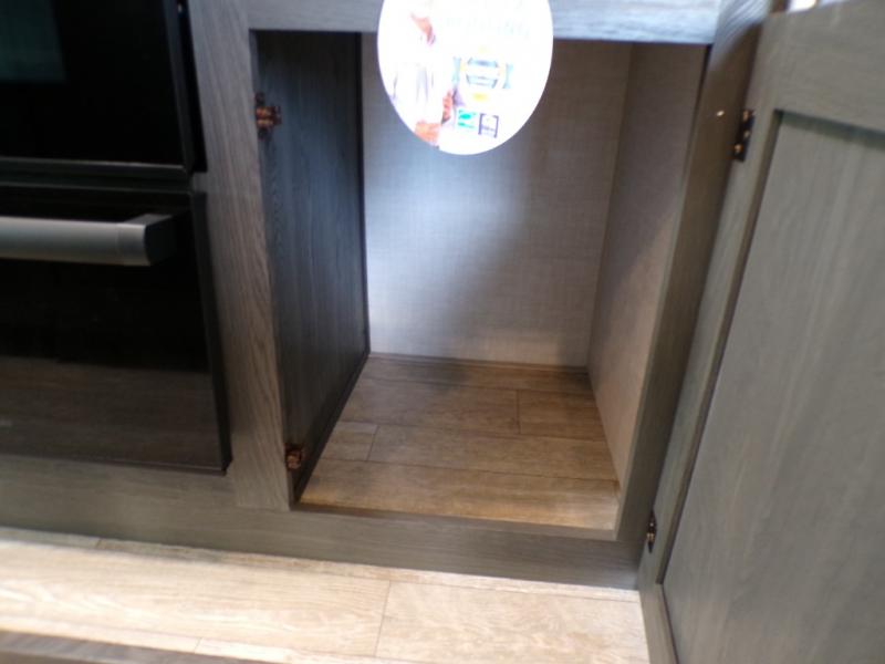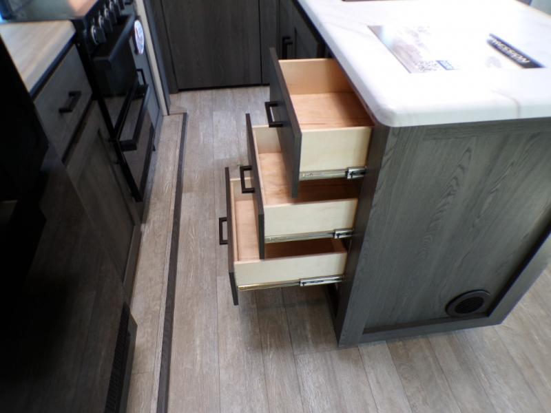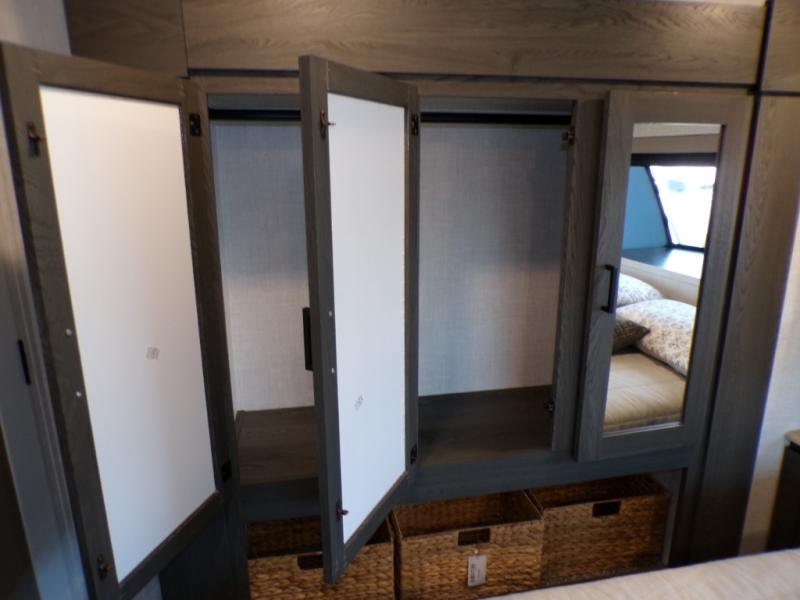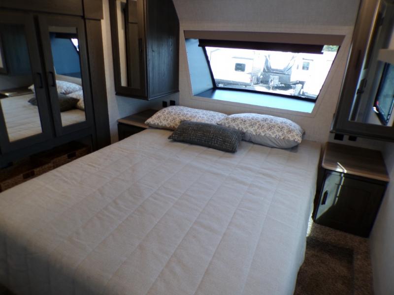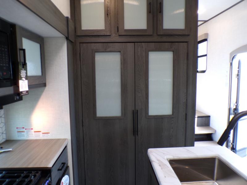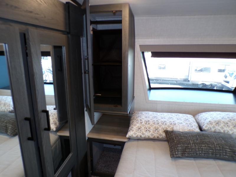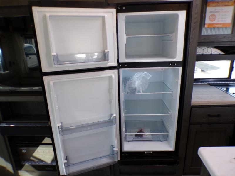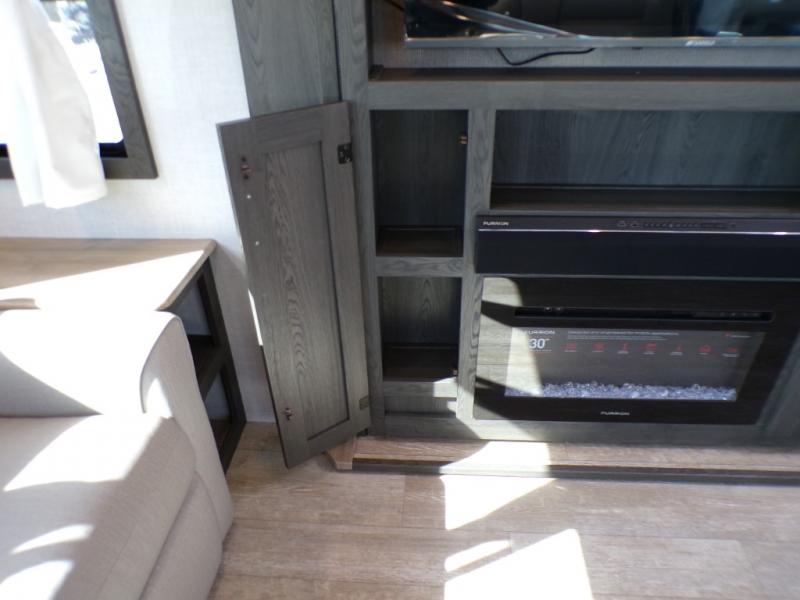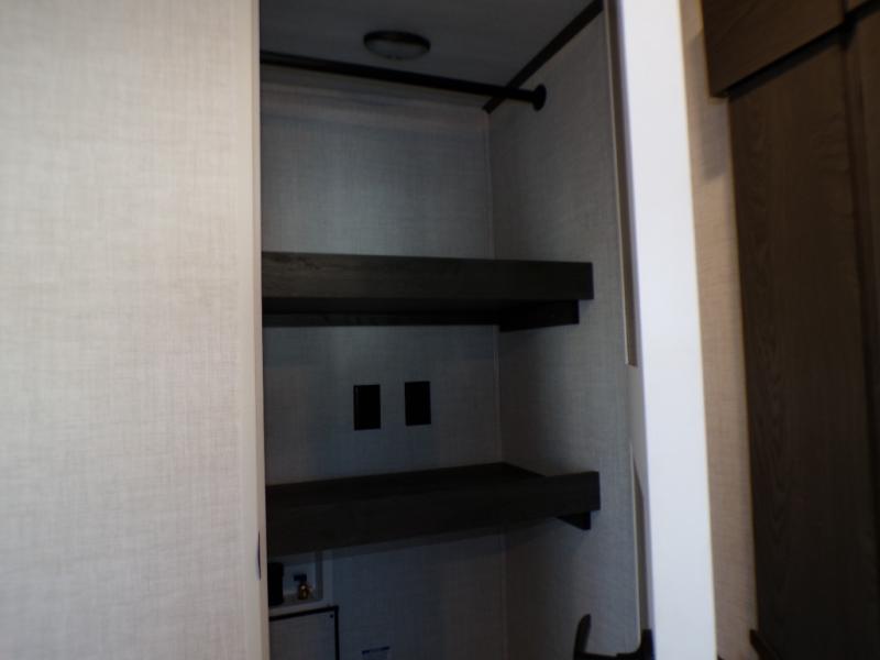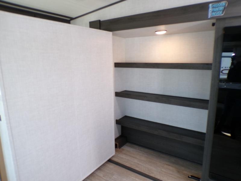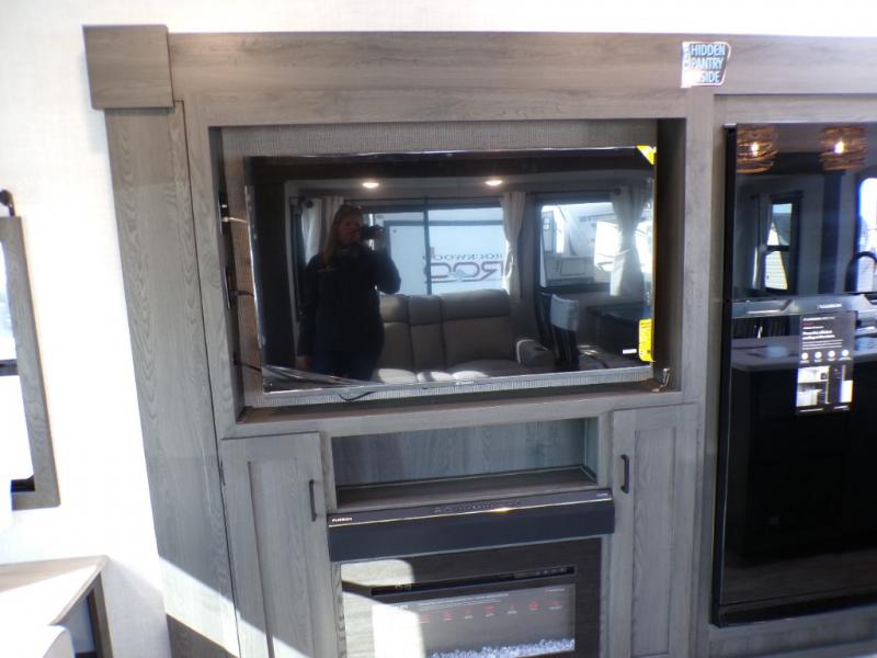 Enjoy camping each and every trip when you have this Impression at the campsite! The cook will love all the kitchen amenities including the walk-in pantry for loads of dry good storage, the kitchen island to prepare and serve meals from, and the 10 cu. ft. refrigerator. There is dining at the free standing table with chairs, or you can sit on the theater seats or even the rear tri-fold hide-a-bed sofa. Up a few steps you will find the full bathroom with a walk-in shower and skylight for more headroom and natural lighting. The bedroom up front offers four wardrobes; one is prepped for a washer/dryer option, and one is within a slide providing more floor space.