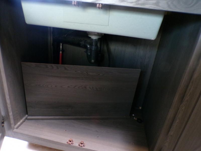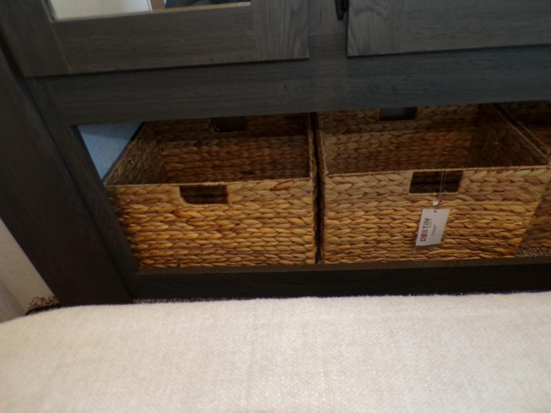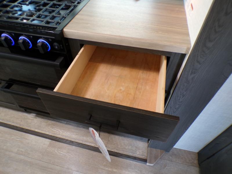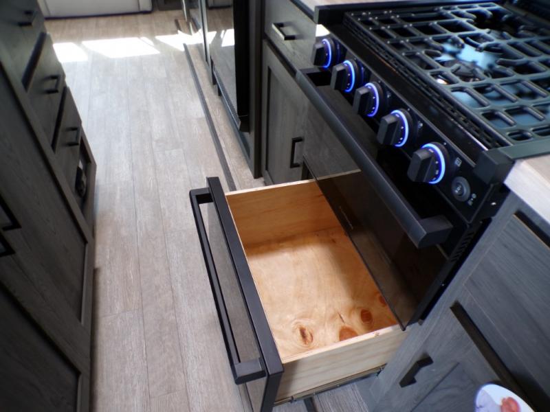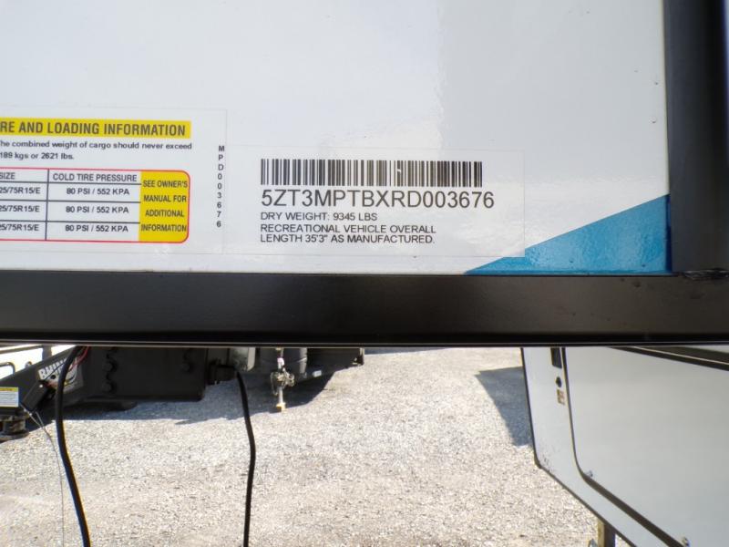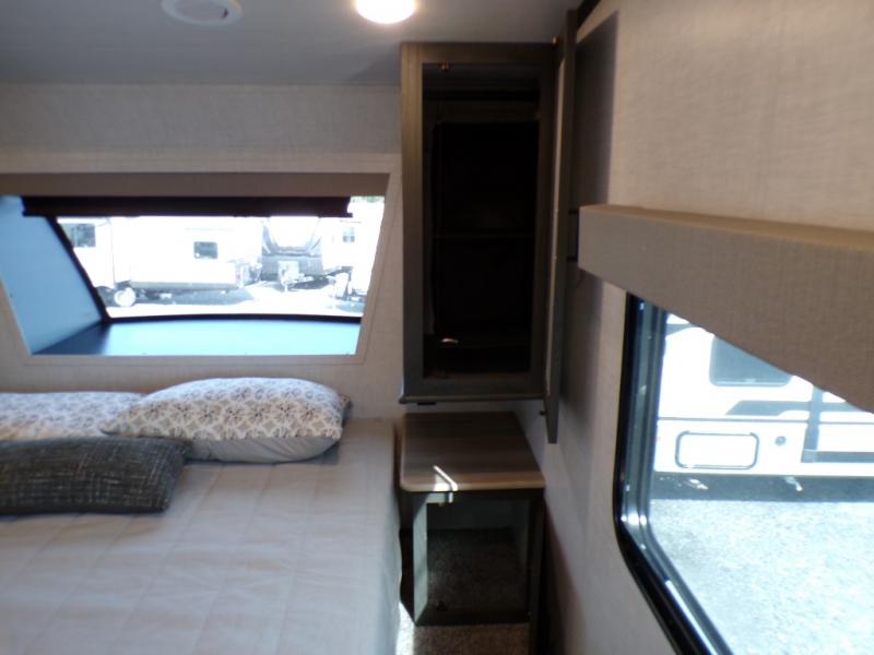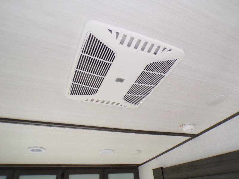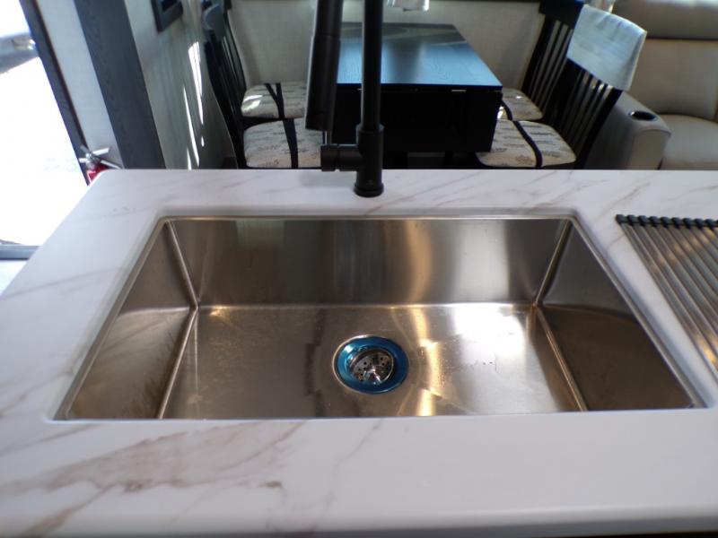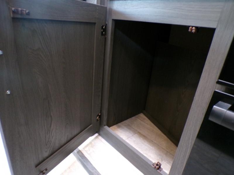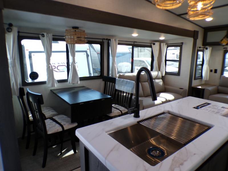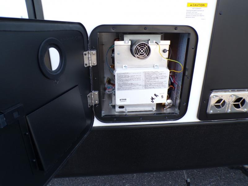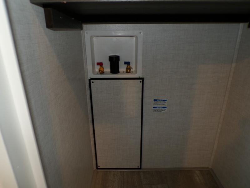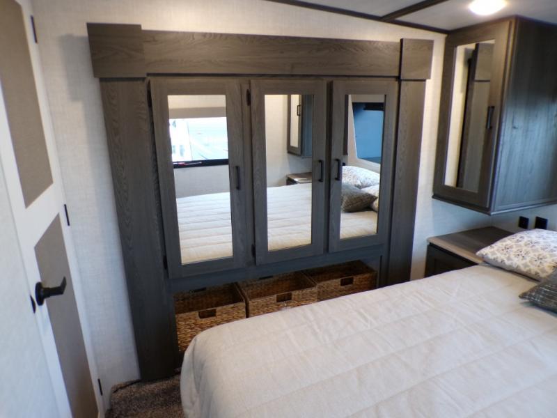 Enjoy camping each and every trip when you have this Impression at the campsite! The cook will love all the kitchen amenities including the walk-in pantry for loads of dry good storage, the kitchen island to prepare and serve meals from, and the 10 cu. ft. refrigerator. There is dining at the free standing table with chairs, or you can sit on the theater seats or even the rear tri-fold hide-a-bed sofa. Up a few steps you will find the full bathroom with a walk-in shower and skylight for more headroom and natural lighting. The bedroom up front offers four wardrobes; one is prepped for a washer/dryer option, and one is within a slide providing more floor space.