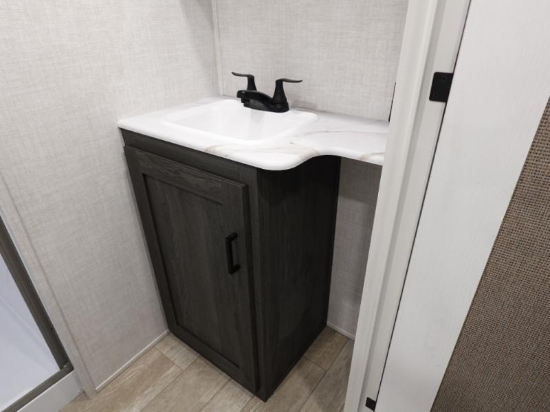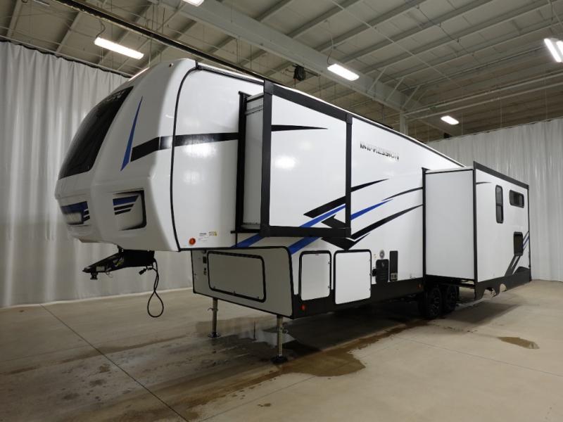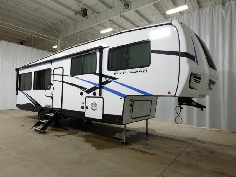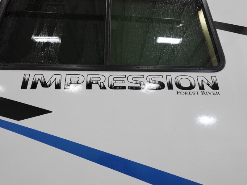 With any Impression mid-profile fifth wheel by Forest River, the focus of the design is comfort and value, built with quality craftsmanship and attention to customer's desires in each Impression! The exterior includes upgraded E-rated Goodyear Endurance tires made in the U.S.A., custom exterior graphics package, and One Touch automatic leveling system for easy setup. There is also an enclosed docking station and a gel coat fiberglass front cap with an automotive windshield with LED lights for style and beautiful views. The fully heated and enclosed AccessiBelly has removable underbelly panels and offers four seasons of travel. The interior has oversized opening windows in the living area for more natural lighting and good air flow, a stainless steel single bowl sink with high rise faucet with a pulldown sprayer to easily clean the dishes, and a porcelain foot flush toilet to mention a few comforts and conveniences.