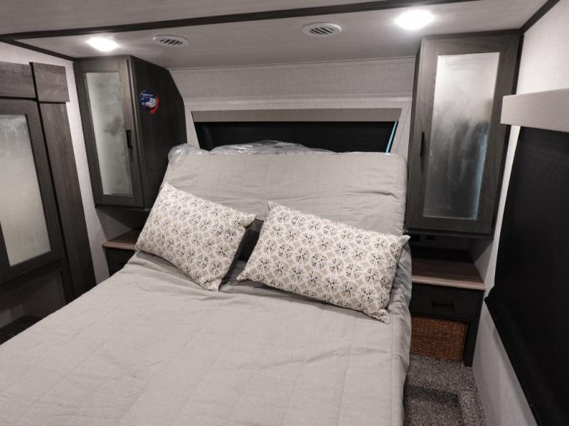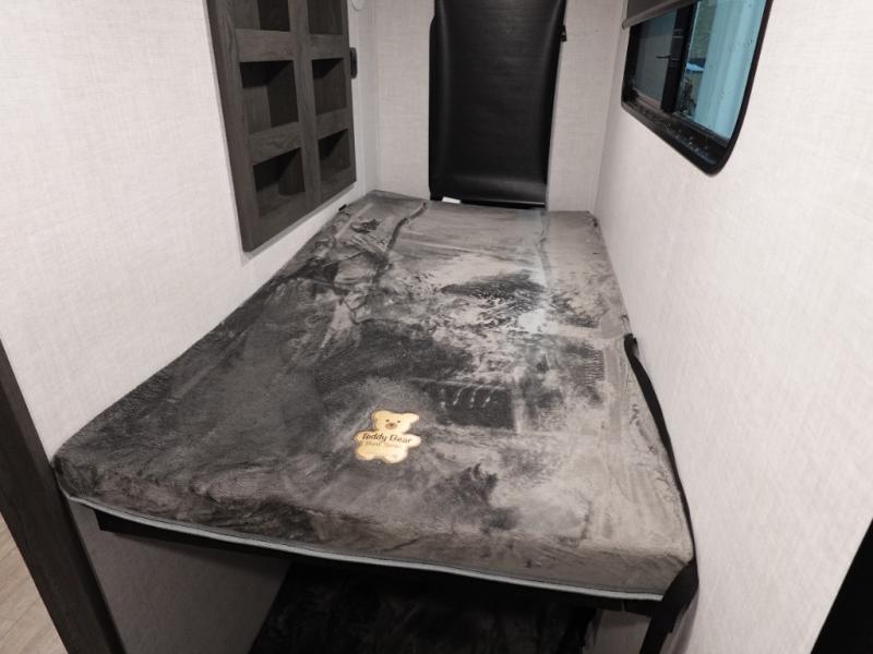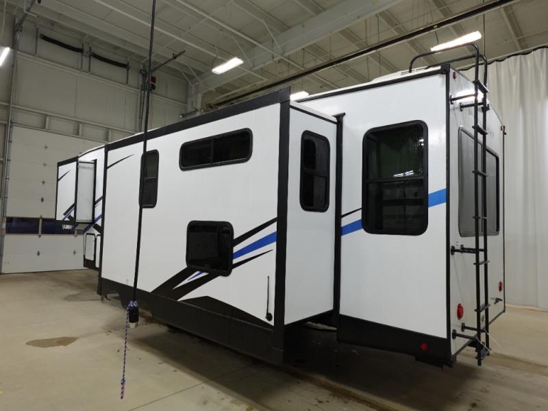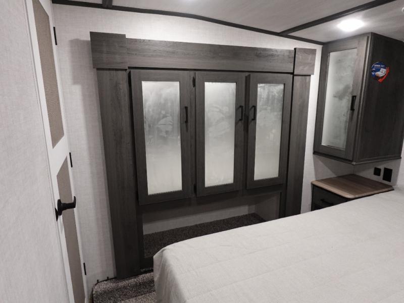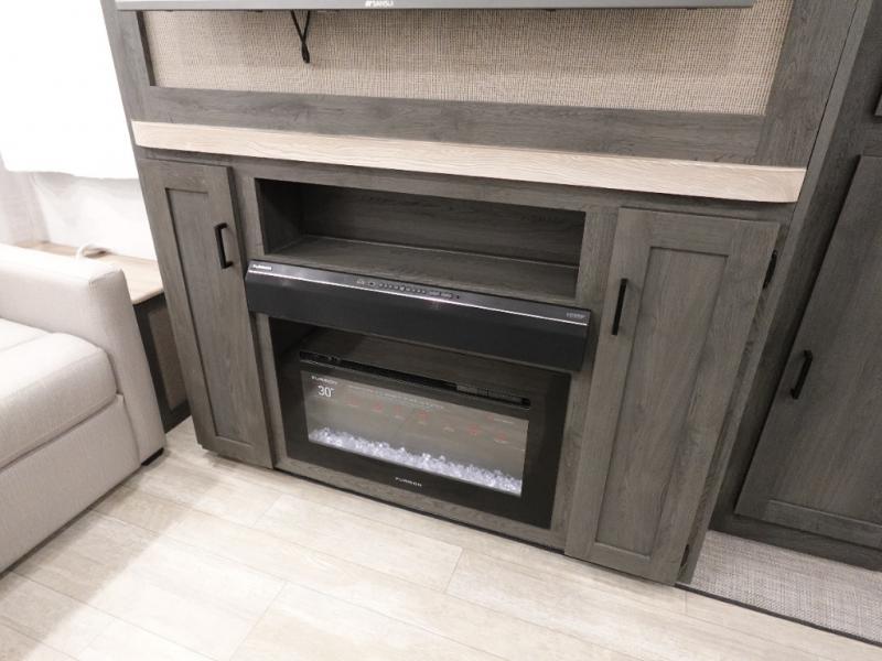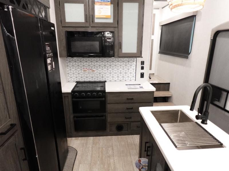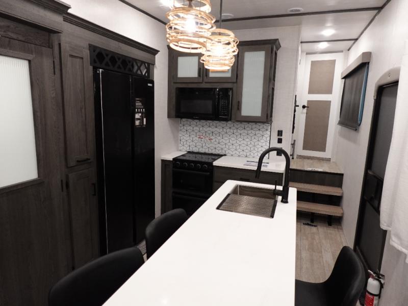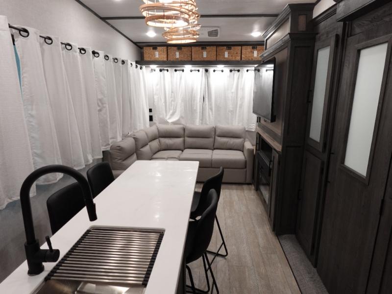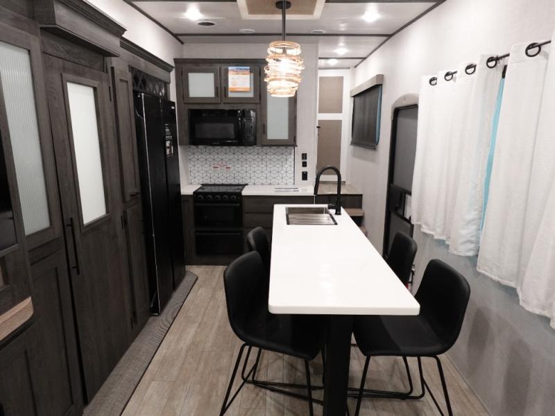 Experience a home away from home with this fifth wheel! The rear sectional sleeper sofa has a theater seating for a relaxing evening by the entertainment center with a 55" TV. Next to the entertainment center is a hidden door with cabinets and 16 cu. ft. 12V refrigerator, and above it is a 36" x 74" flip-down bunk and pad below it all housed within a slide. The kitchen has plenty of countertop space to prepare your best home cooked meals and an island with four bar stools to enjoy your meals. As you walk up the floating steps, you will notice the full bathroom to your left with a walk-in shower with a skylight for added natural lighting. The front private bedroom has a queen bed with Versa Tilt technology, wardrobes on either side and a wardrobe slide, plus there is a closet that is prepped for a washer and dryer!