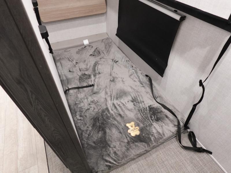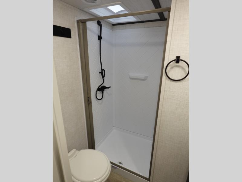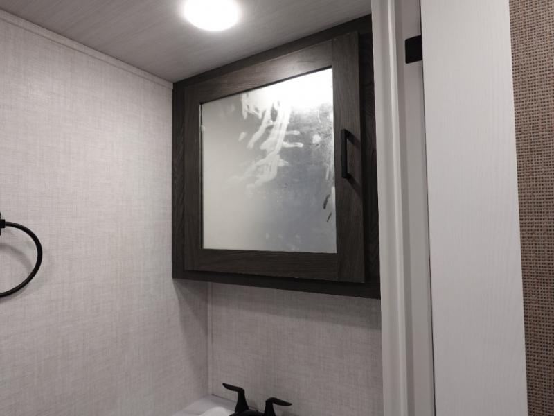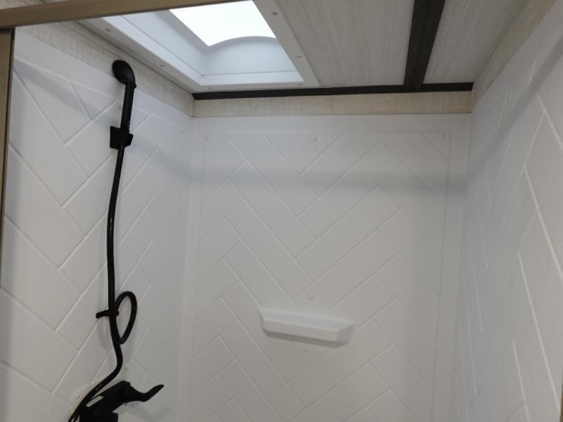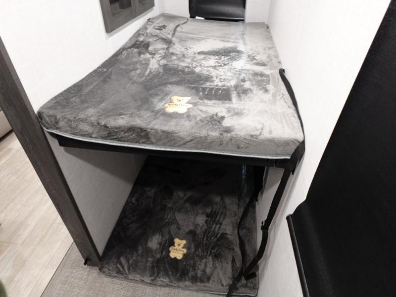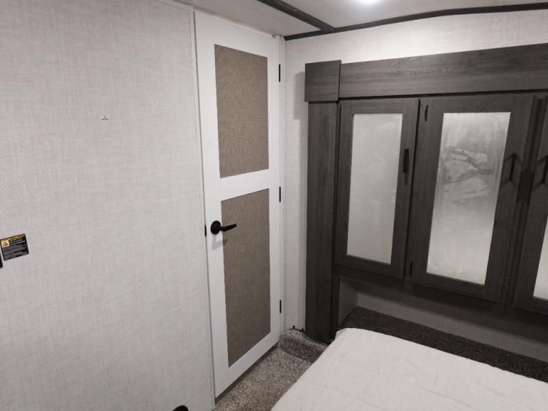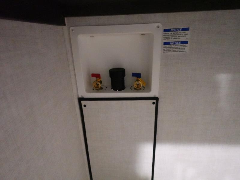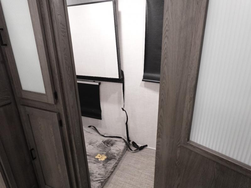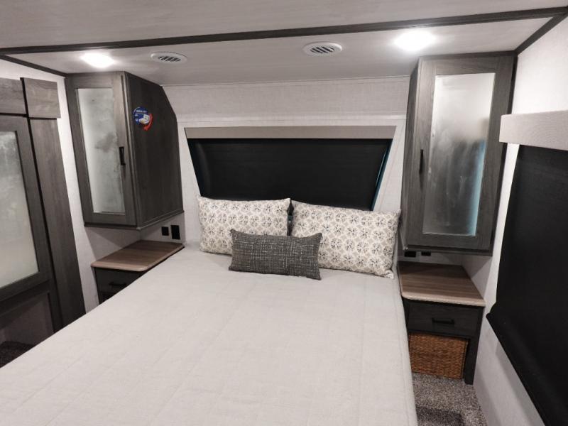 Experience a home away from home with this fifth wheel! The rear sectional sleeper sofa has a theater seating for a relaxing evening by the entertainment center with a 55" TV. Next to the entertainment center is a hidden door with cabinets and 16 cu. ft. 12V refrigerator, and above it is a 36" x 74" flip-down bunk and pad below it all housed within a slide. The kitchen has plenty of countertop space to prepare your best home cooked meals and an island with four bar stools to enjoy your meals. As you walk up the floating steps, you will notice the full bathroom to your left with a walk-in shower with a skylight for added natural lighting. The front private bedroom has a queen bed with Versa Tilt technology, wardrobes on either side and a wardrobe slide, plus there is a closet that is prepped for a washer and dryer!
