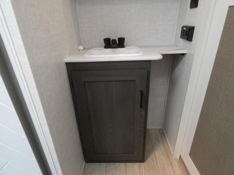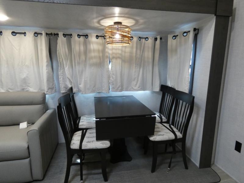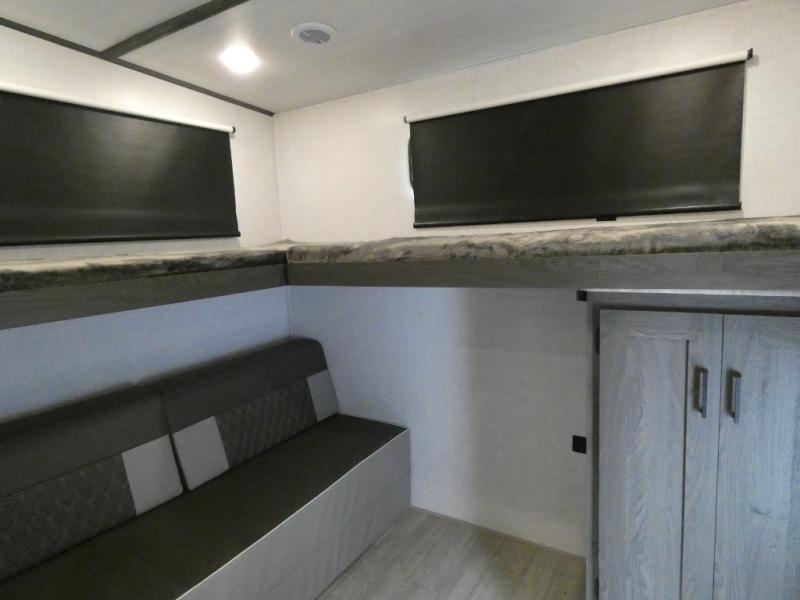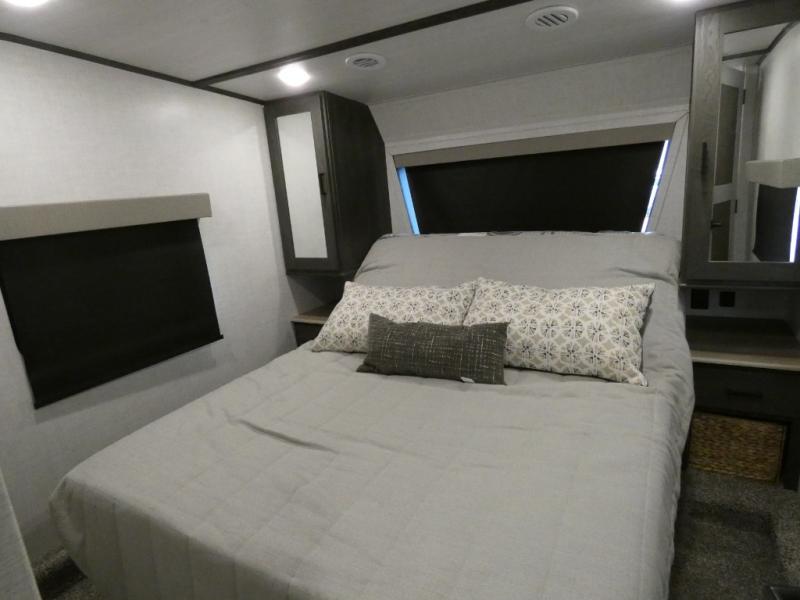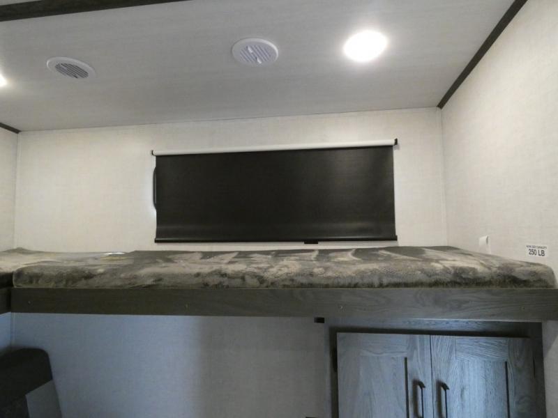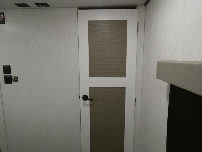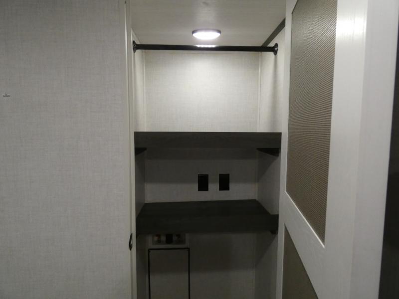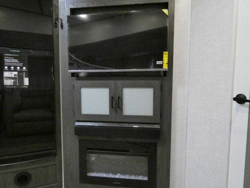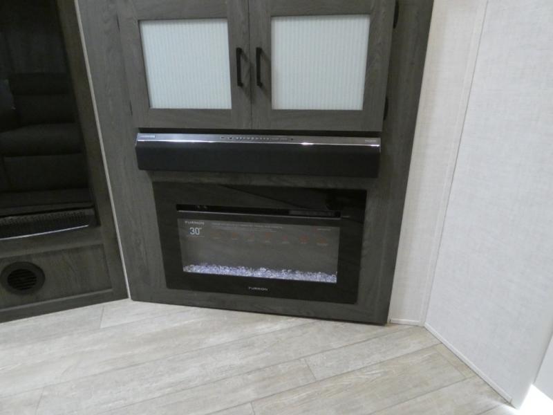 This fifth wheel is going to make an impression on anyone that steps foot inside or walks around the outside! From having a second entry/exit door into the rear bunkhouse and a main entry into the living and kitchen area, plus having an outside kitchen to make meals in the great outdoors, nobody will ever want to go home! The rear bunkhouse also includes a Versa queen bed plus two flip-down upper bunks, plus storage. The front bedroom gives you privacy from everyone and there is a walk-around queen bed with Versa Tilt technology, three wardrobes and a space prepped for a washer/dryer option. The full bathroom will keep everyone refreshed, and the inside kitchen has full amenities including an L-shaped counter. There is hidden storage behind the LED TV with fireplace below.