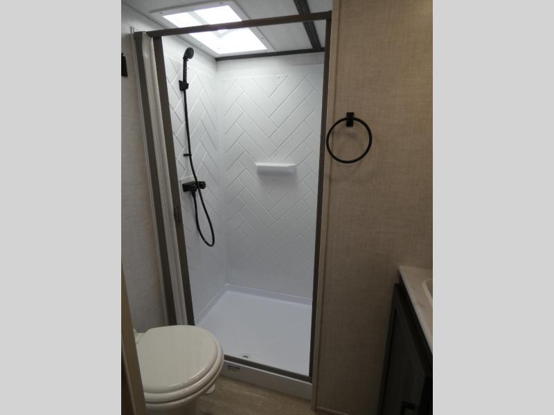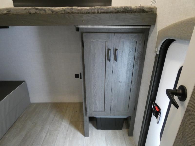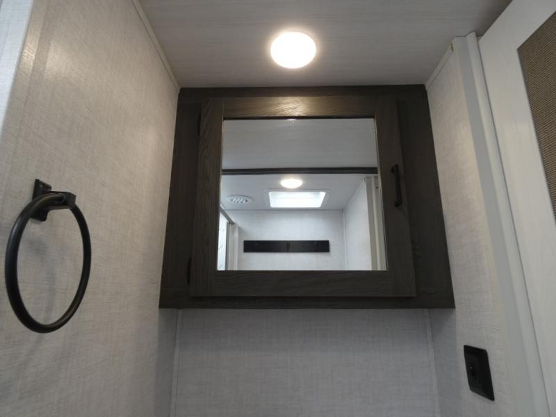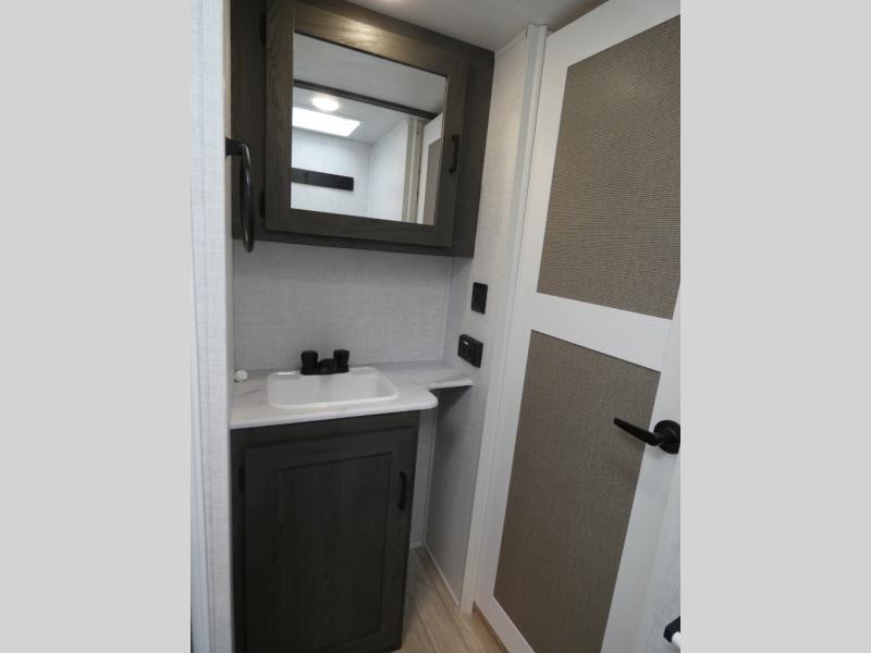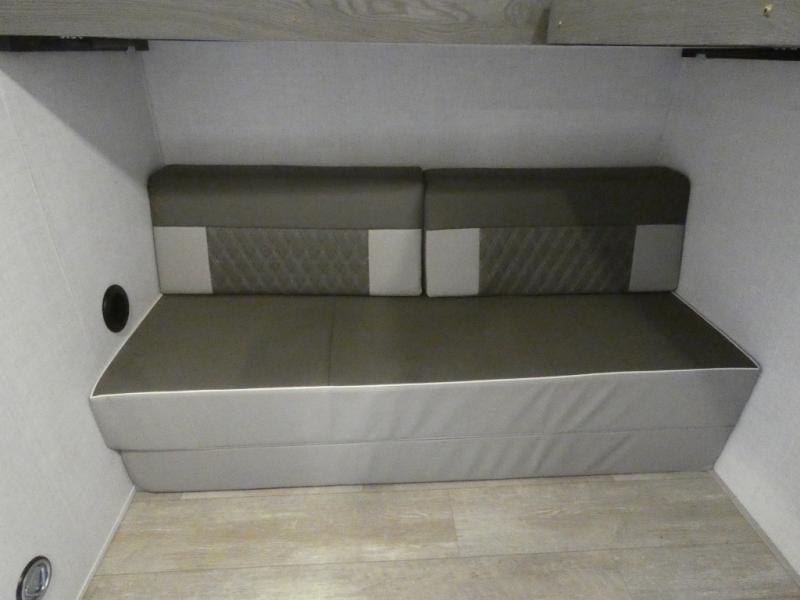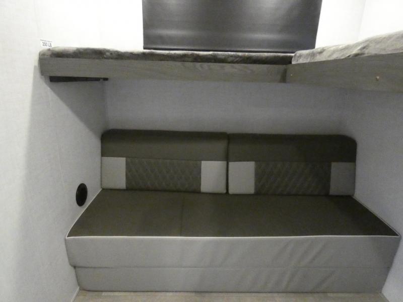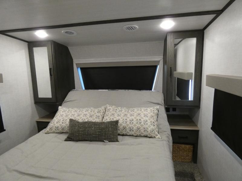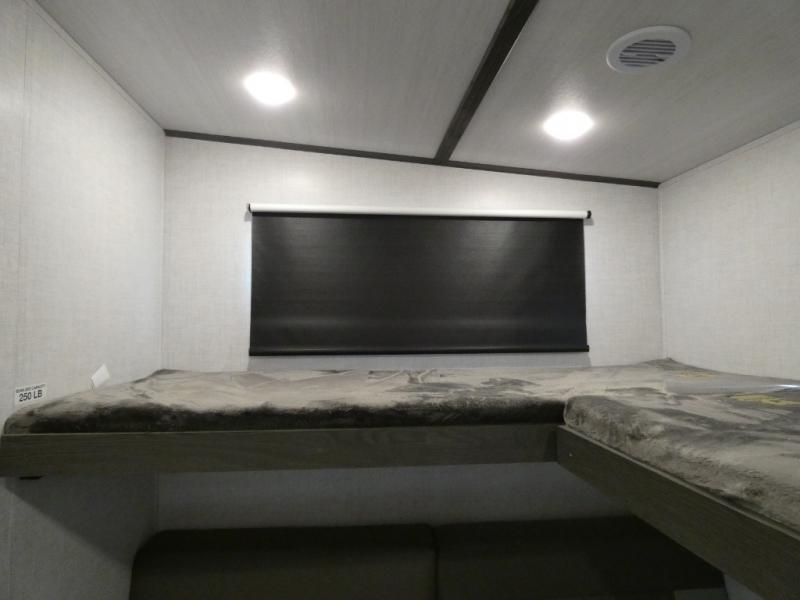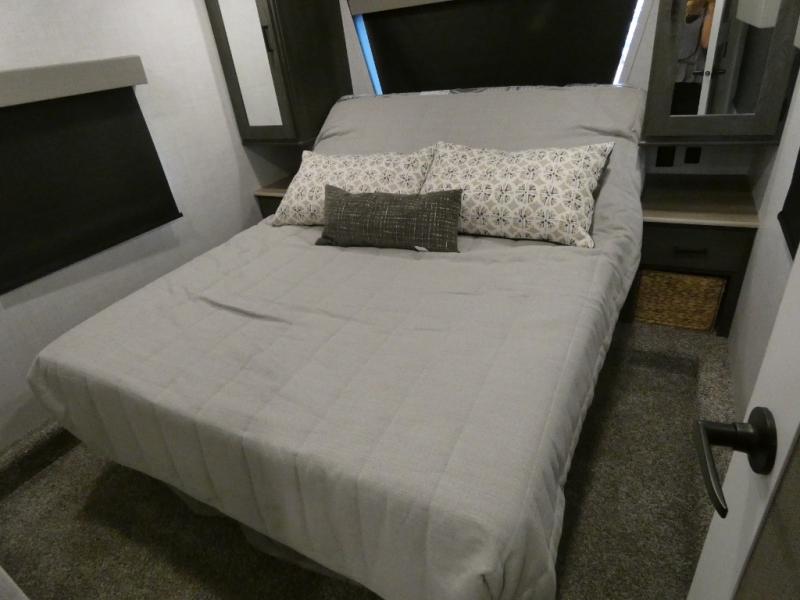 This fifth wheel is going to make an impression on anyone that steps foot inside or walks around the outside! From having a second entry/exit door into the rear bunkhouse and a main entry into the living and kitchen area, plus having an outside kitchen to make meals in the great outdoors, nobody will ever want to go home! The rear bunkhouse also includes a Versa queen bed plus two flip-down upper bunks, plus storage. The front bedroom gives you privacy from everyone and there is a walk-around queen bed with Versa Tilt technology, three wardrobes and a space prepped for a washer/dryer option. The full bathroom will keep everyone refreshed, and the inside kitchen has full amenities including an L-shaped counter. There is hidden storage behind the LED TV with fireplace below.